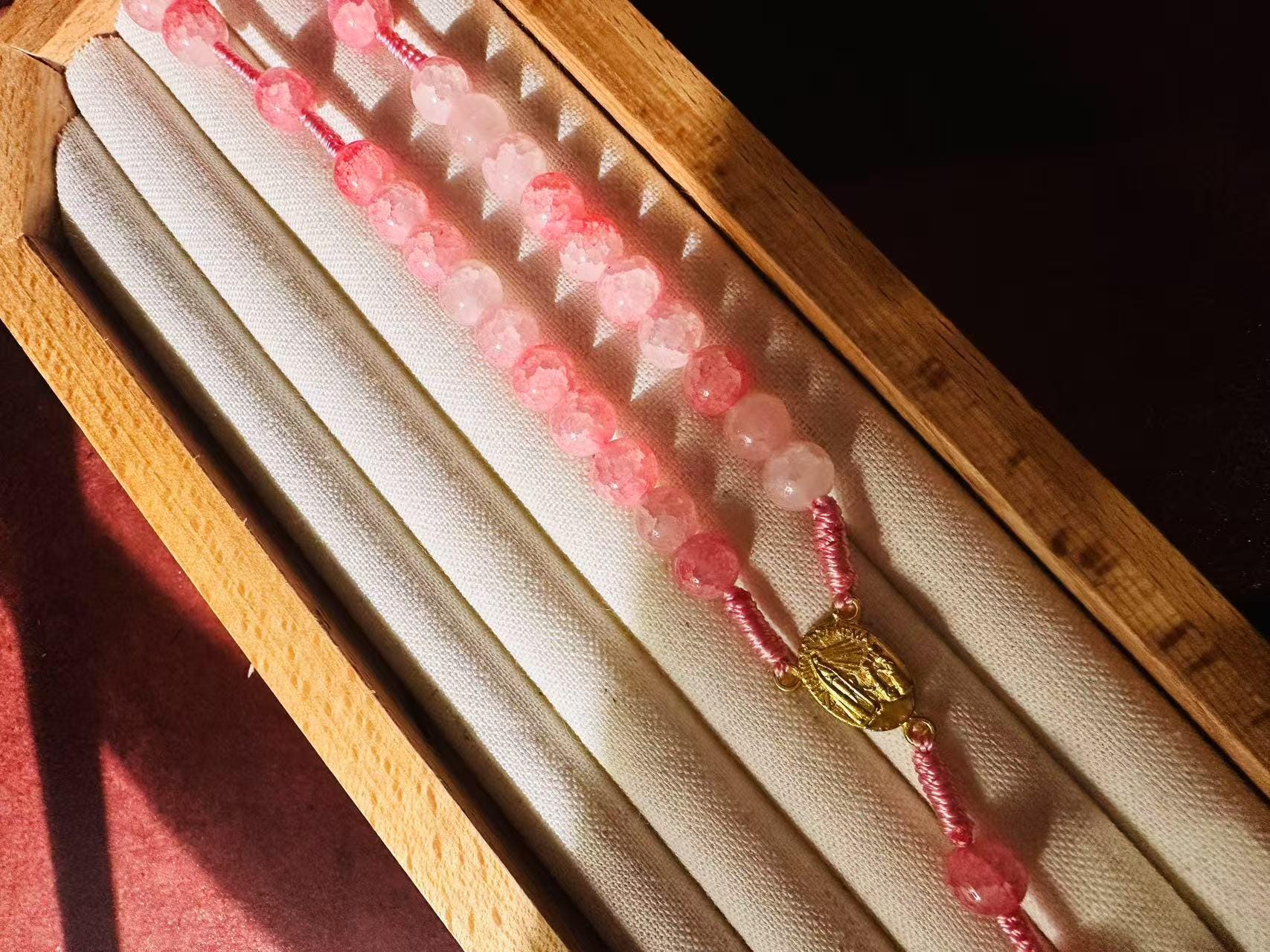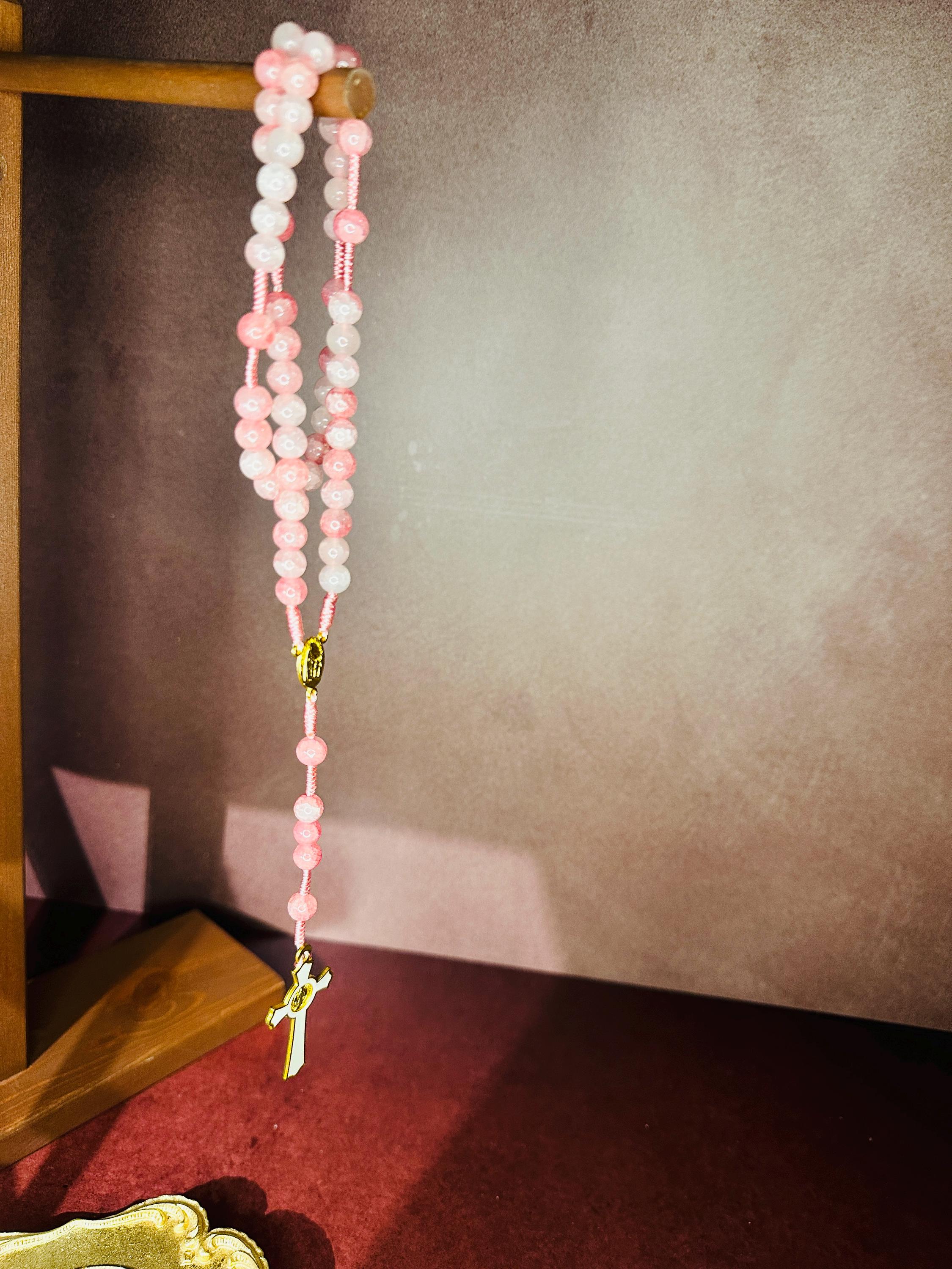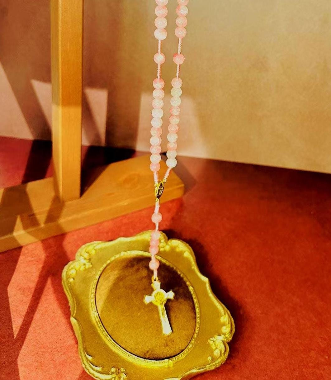 ✨ This is a precious First Communion gift that any little girl will adore. The handmade rosary necklace sparkles with playful pink ice-crack glass beads and a shining gold crucifix, designed to capture a young girl’s heart. Perfect for her First Communion, Confirmation, Baptism or Christmas celebration.