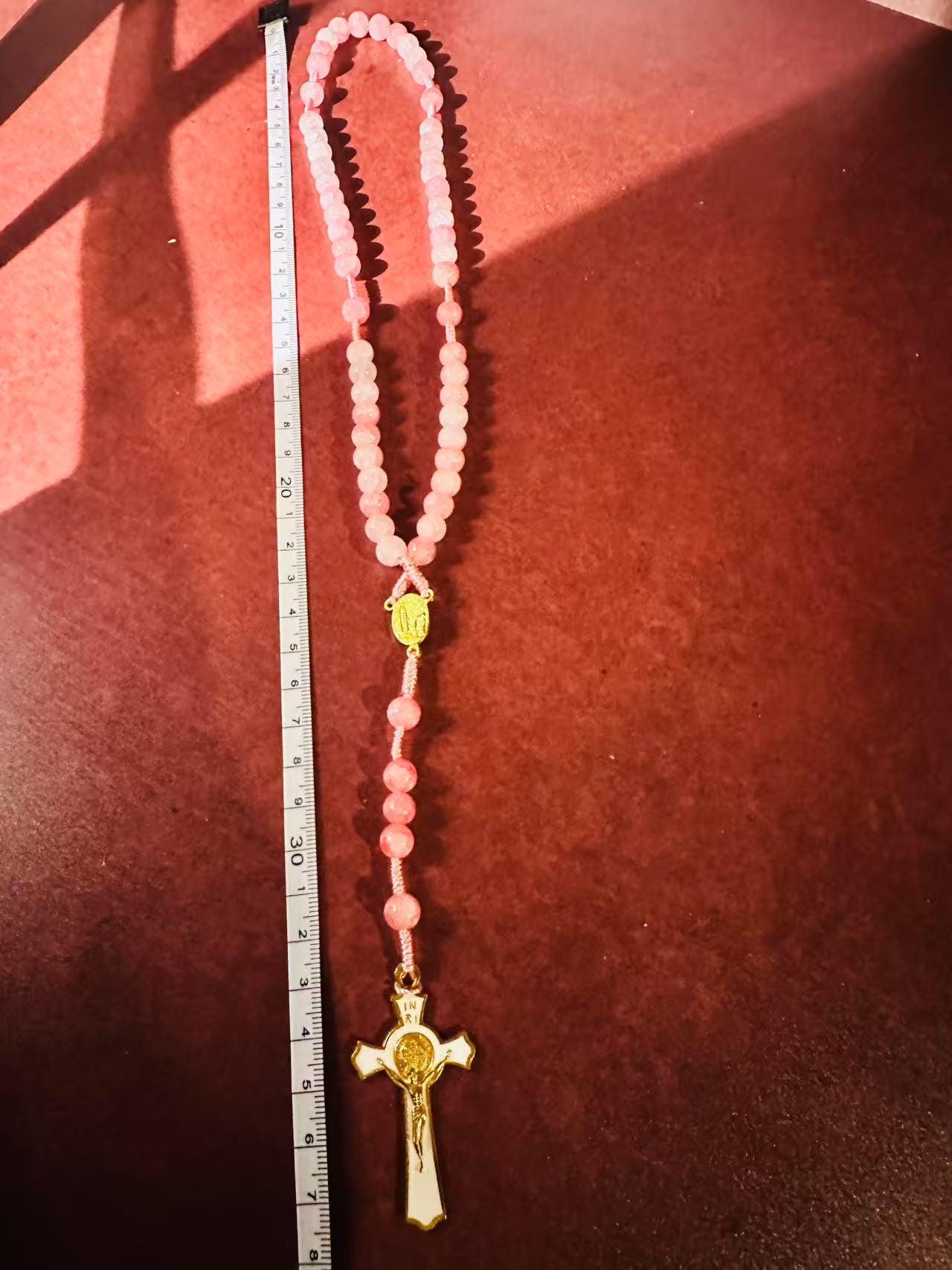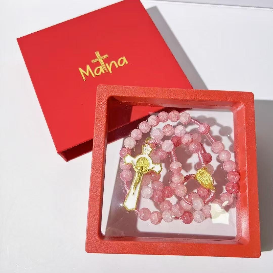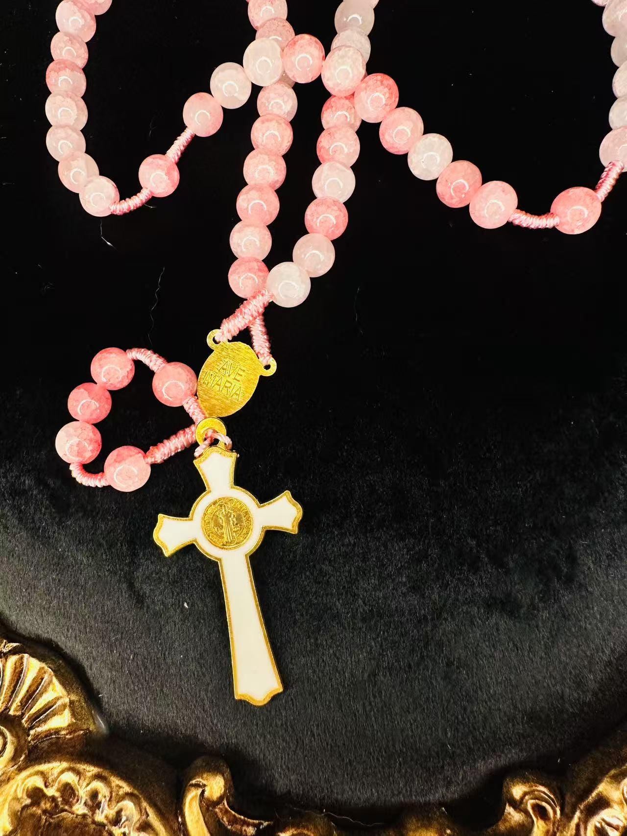 ✨ This is a precious First Communion gift that any little girl will adore. The handmade rosary necklace sparkles with playful pink ice-crack glass beads and a shining gold crucifix, designed to capture a young girl’s heart. Perfect for her First Communion, Confirmation, Baptism or Christmas celebration.