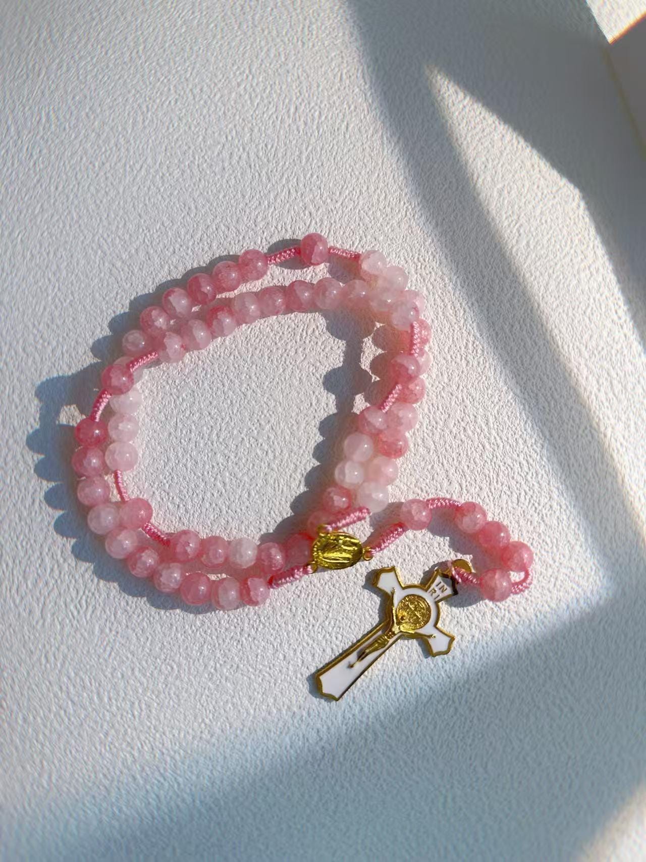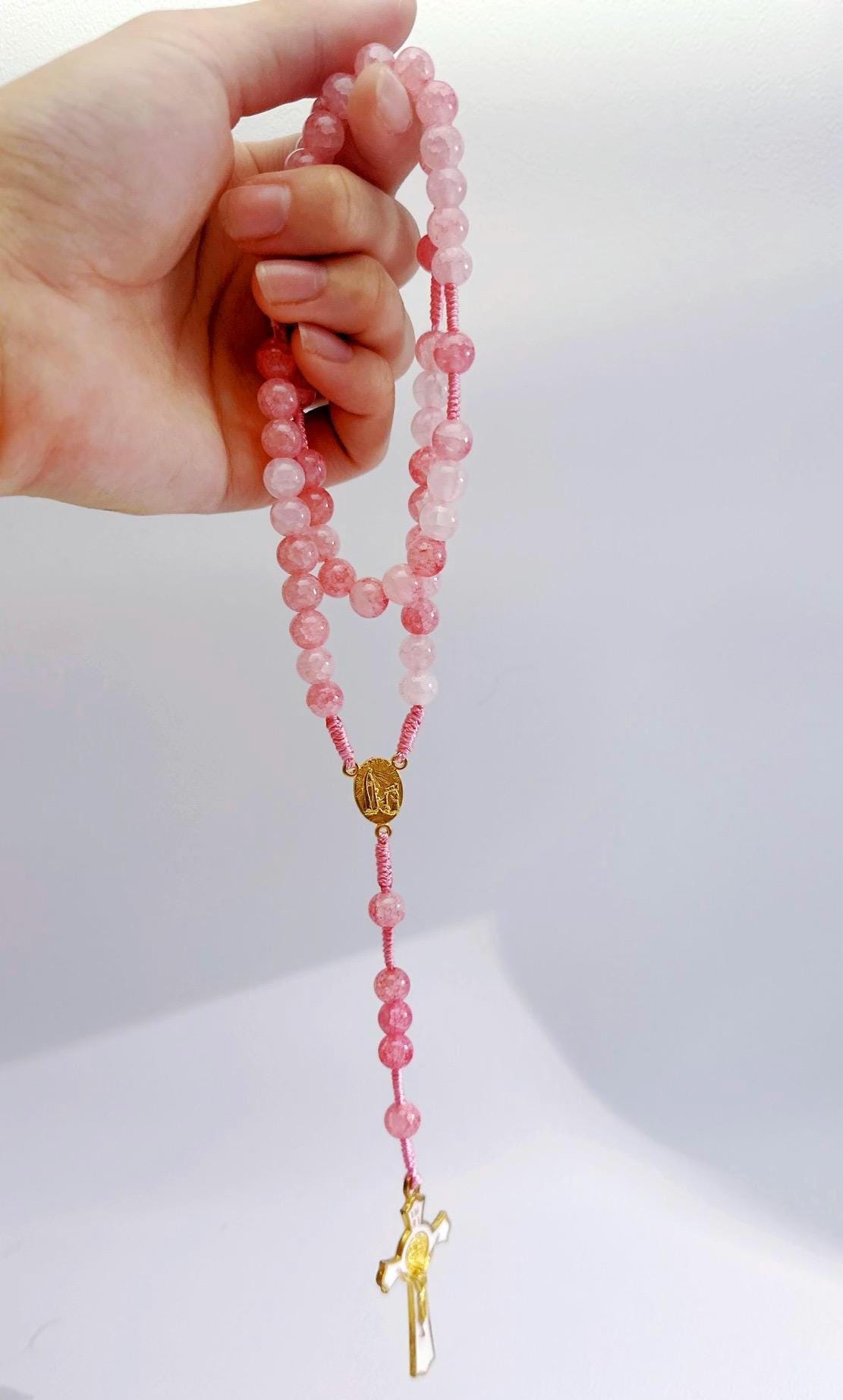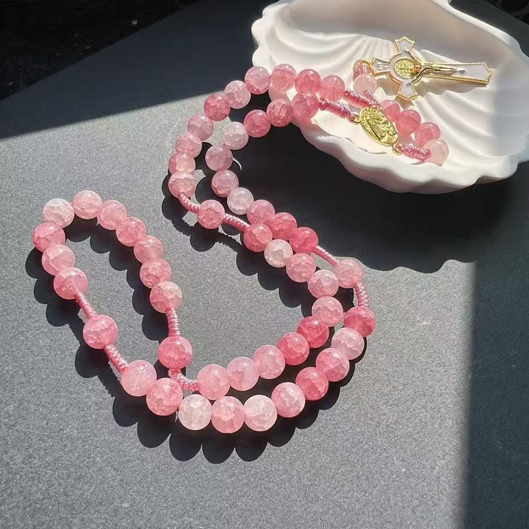 Pink Ice-Crack Crystal Rosary with Silver Crucifix, Christmas or First Communion Gift (Add Pouch – see description)
