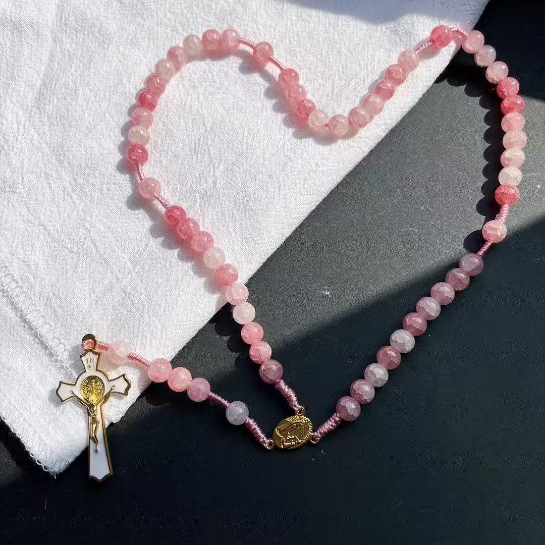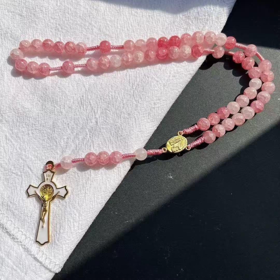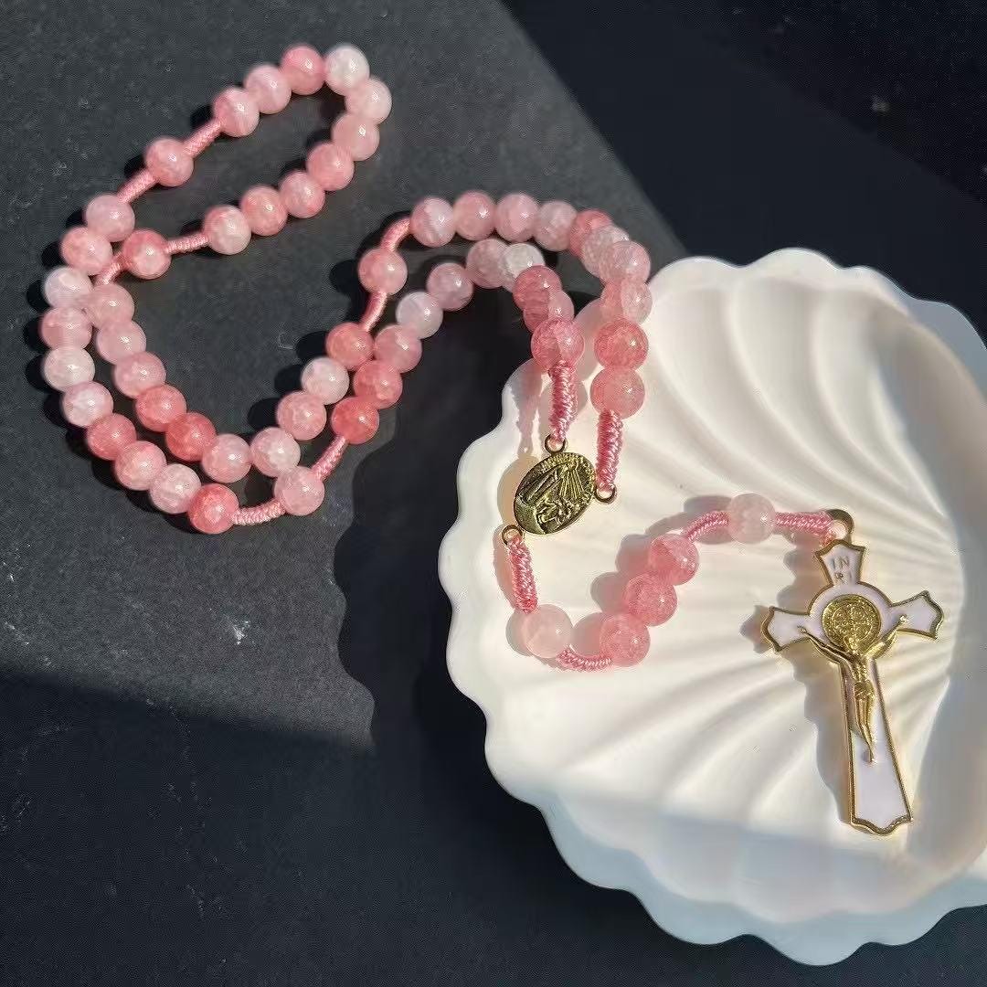 Pink Ice-Crack Crystal Rosary with Silver Crucifix, Christmas or First Communion Gift (Add Pouch – see description)