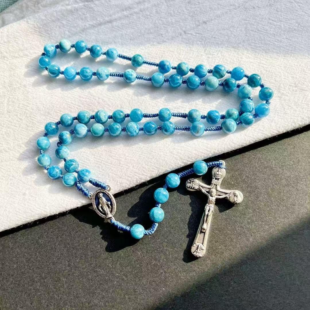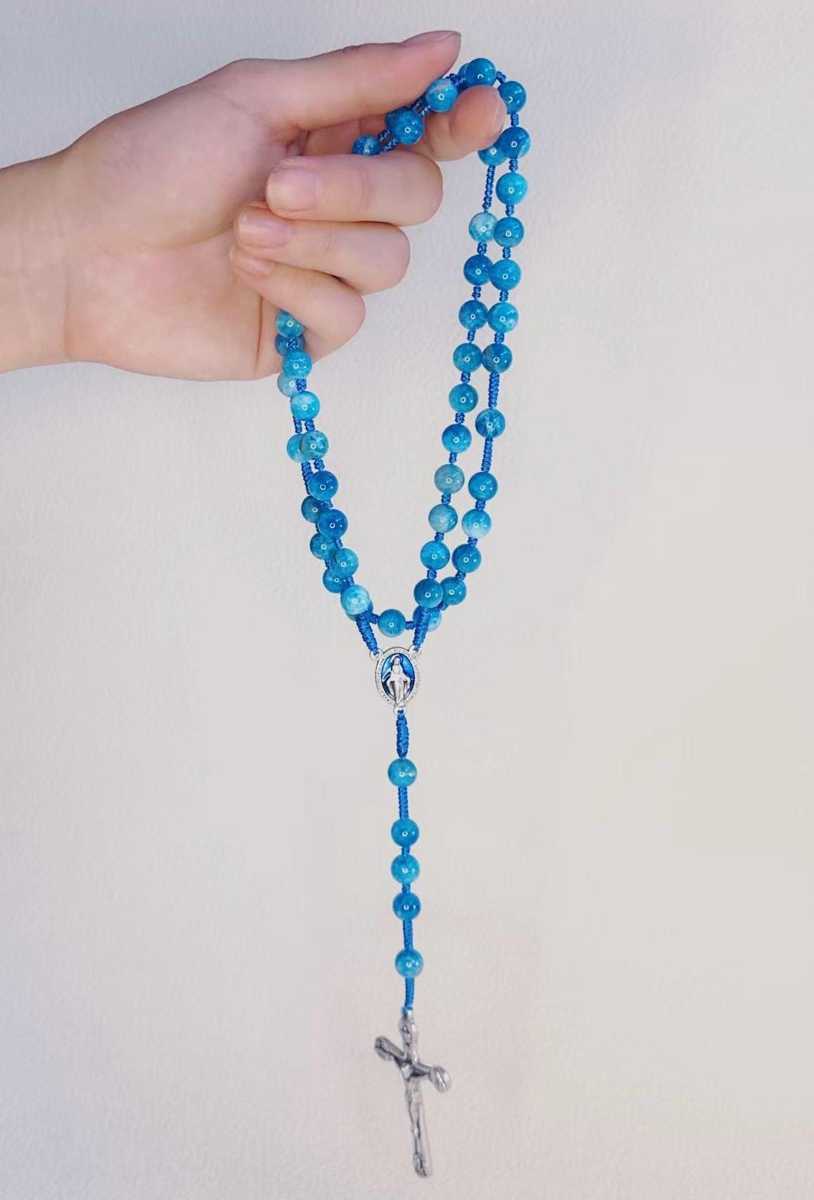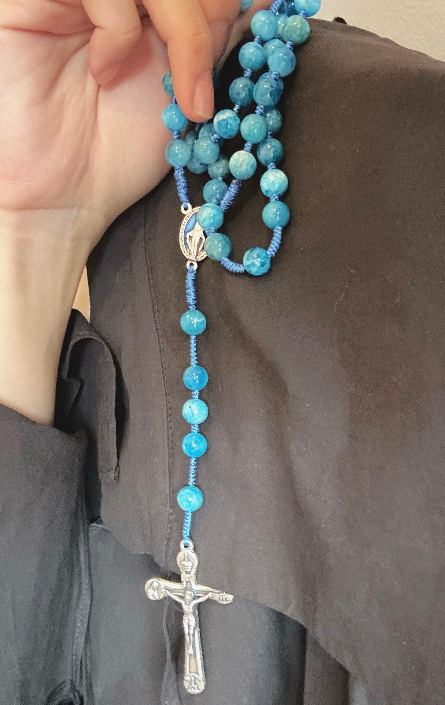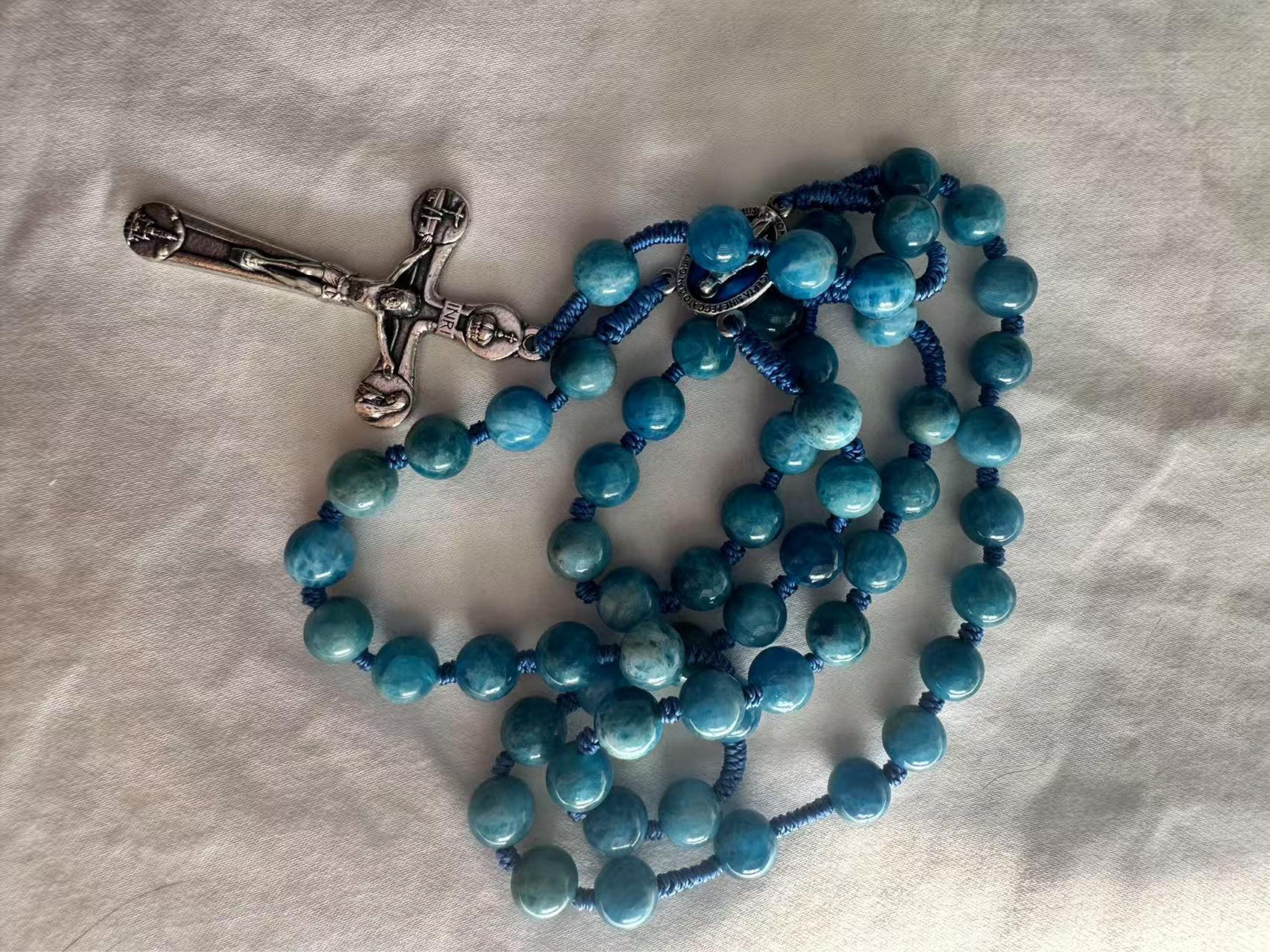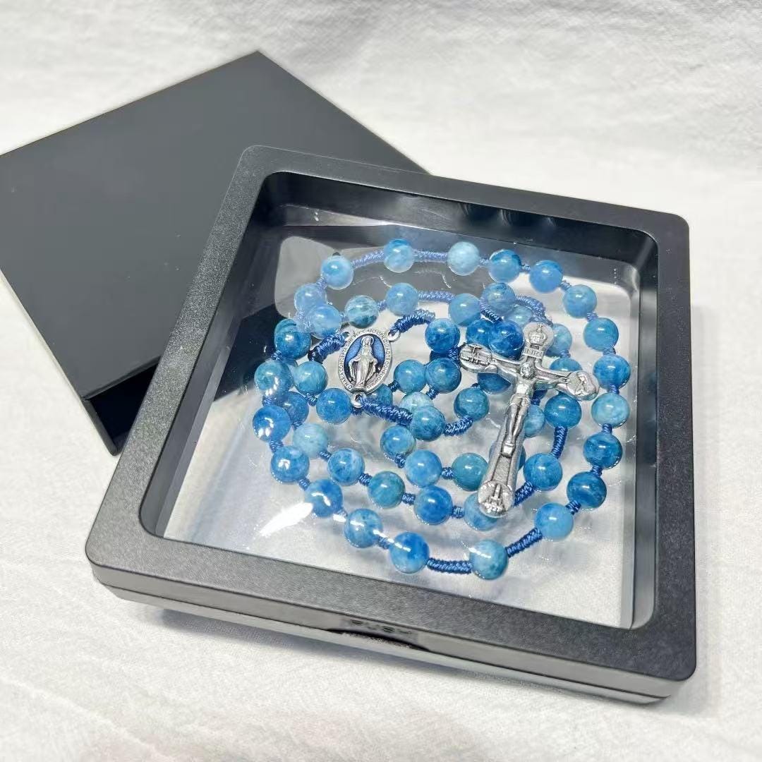 Marian Blue Gemstone Hand-Knotted Rosary, Catholic Christmas Gift (Add Pouch – see description)