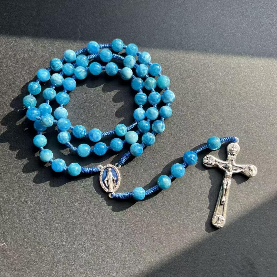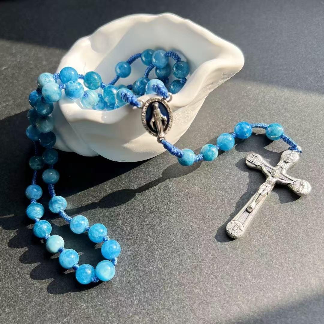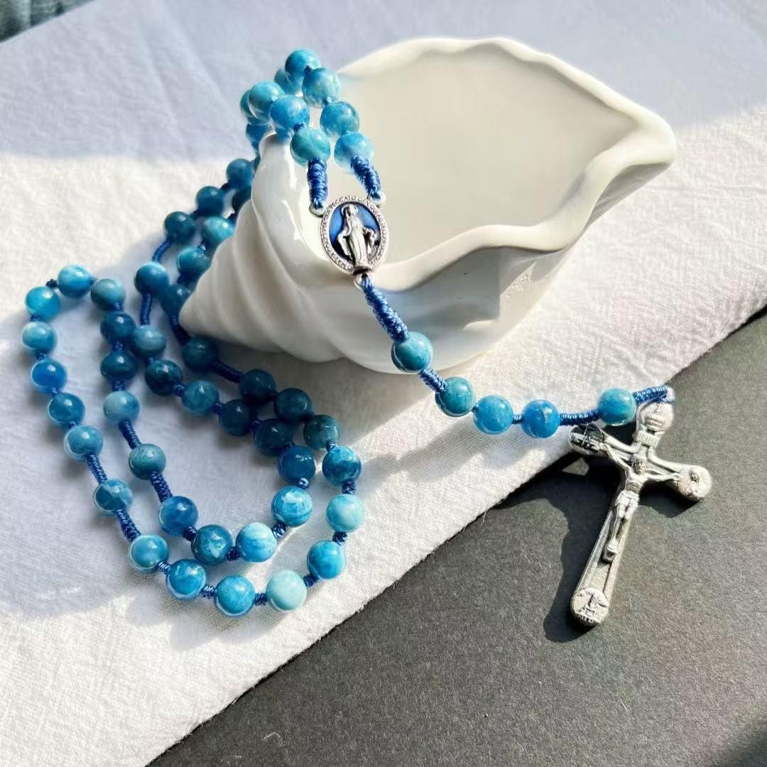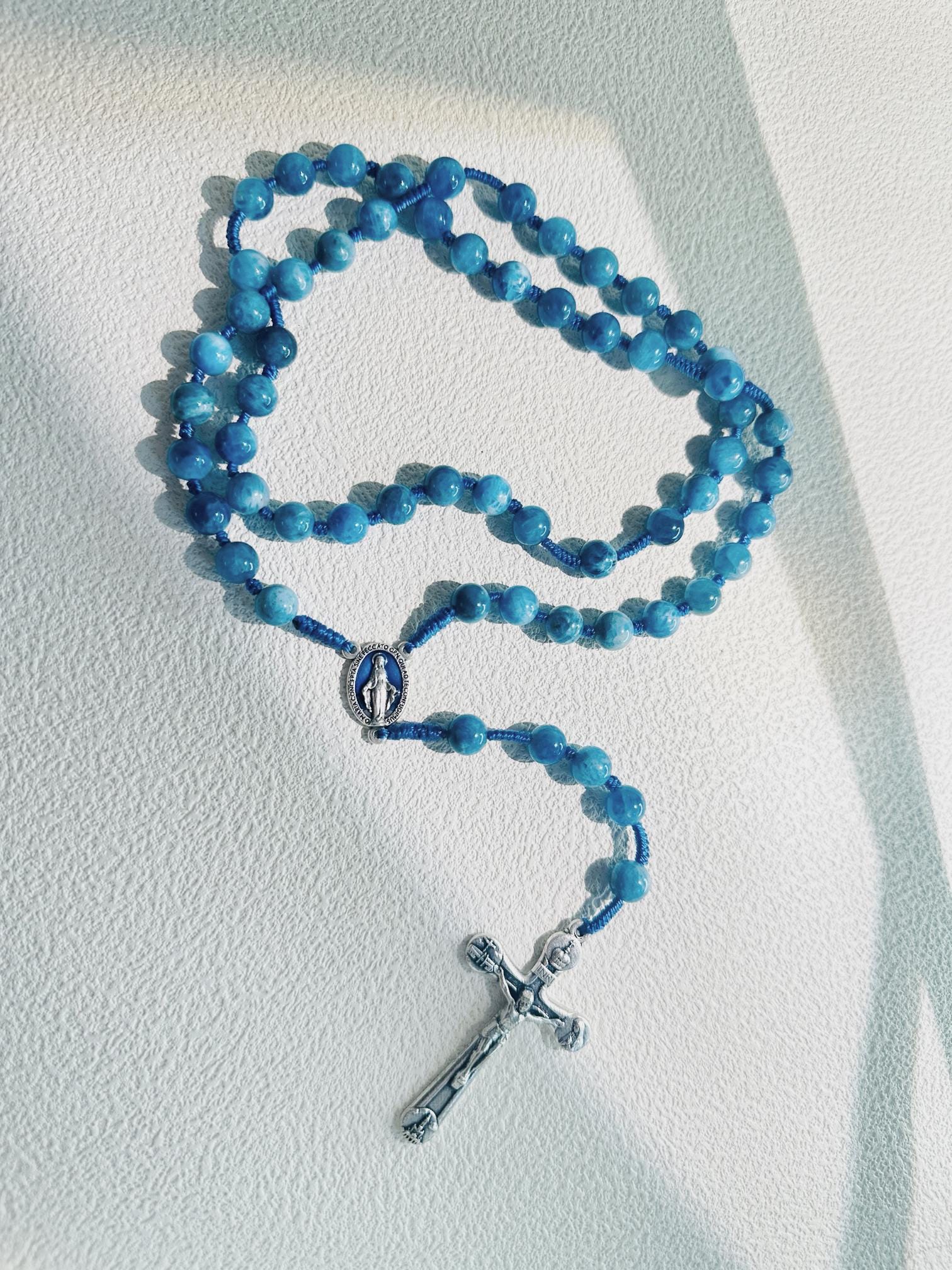 Marian Blue Gemstone Hand-Knotted Rosary, Catholic Christmas Gift (Add Pouch – see description)