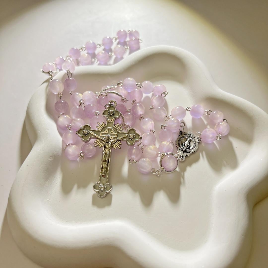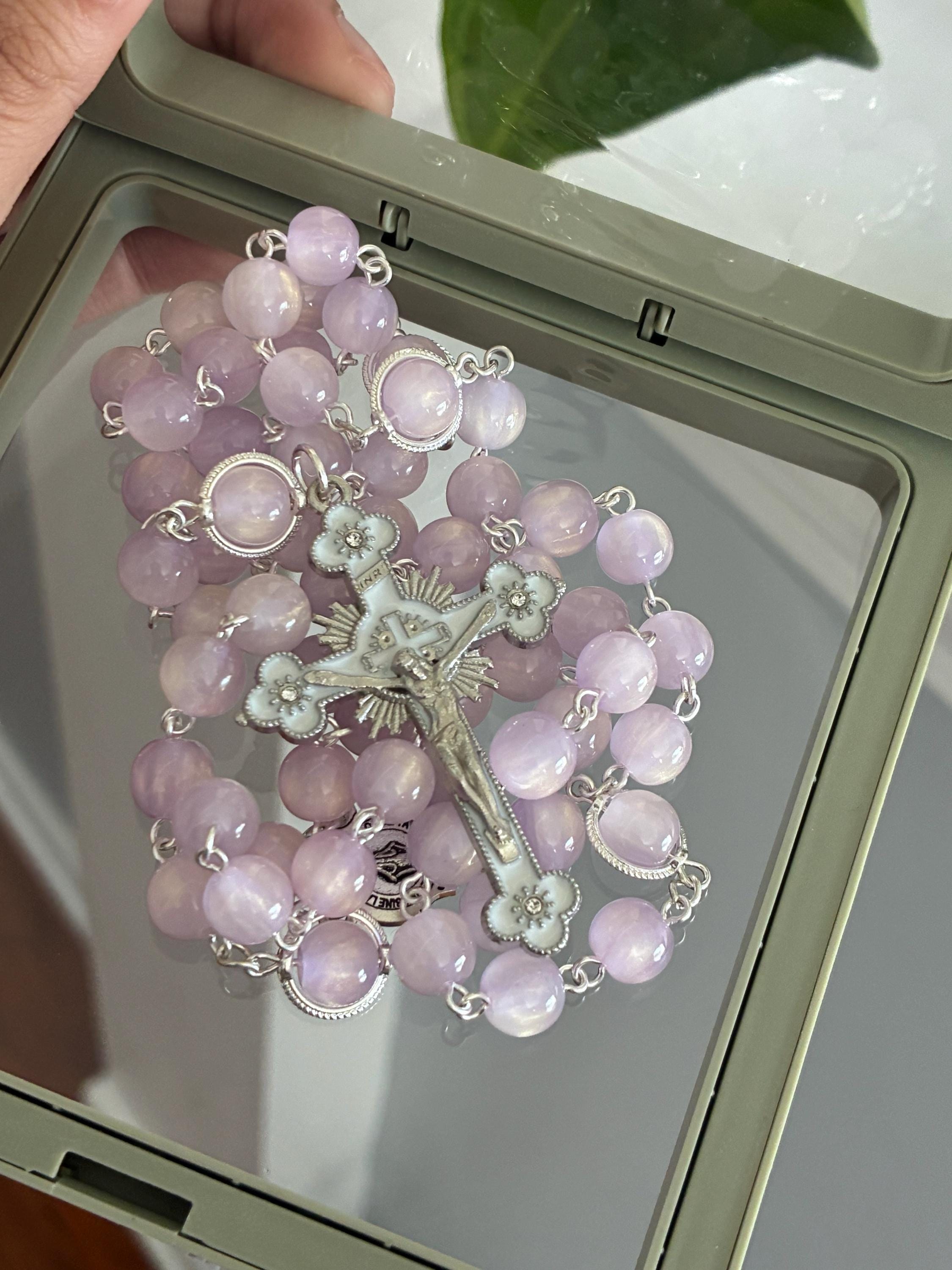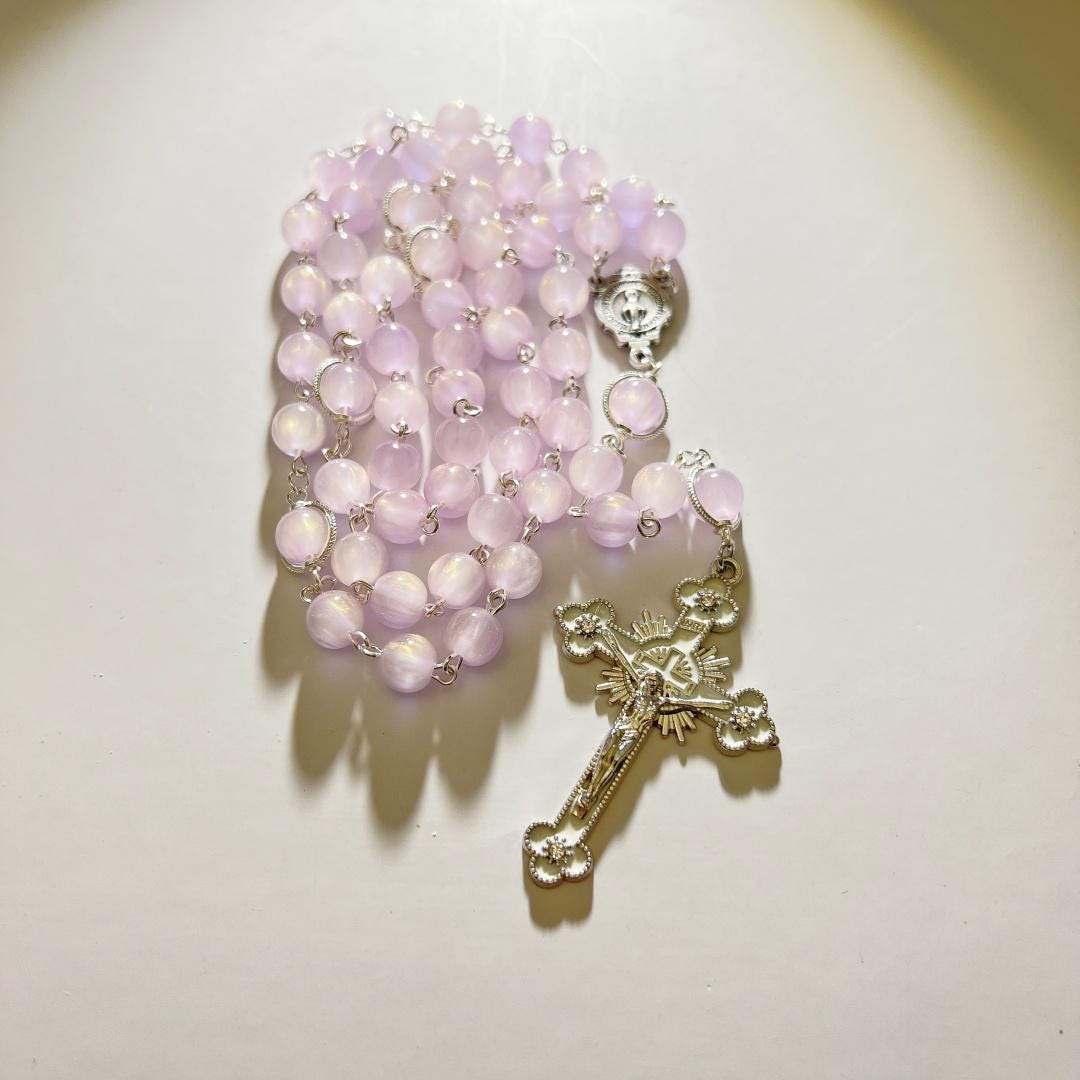 ✨ A versatile handmade rosary designed for both prayer and everyday wear. Crafted with translucent pink-purple resin beads that imitate the shimmer of natural cat’s eye.