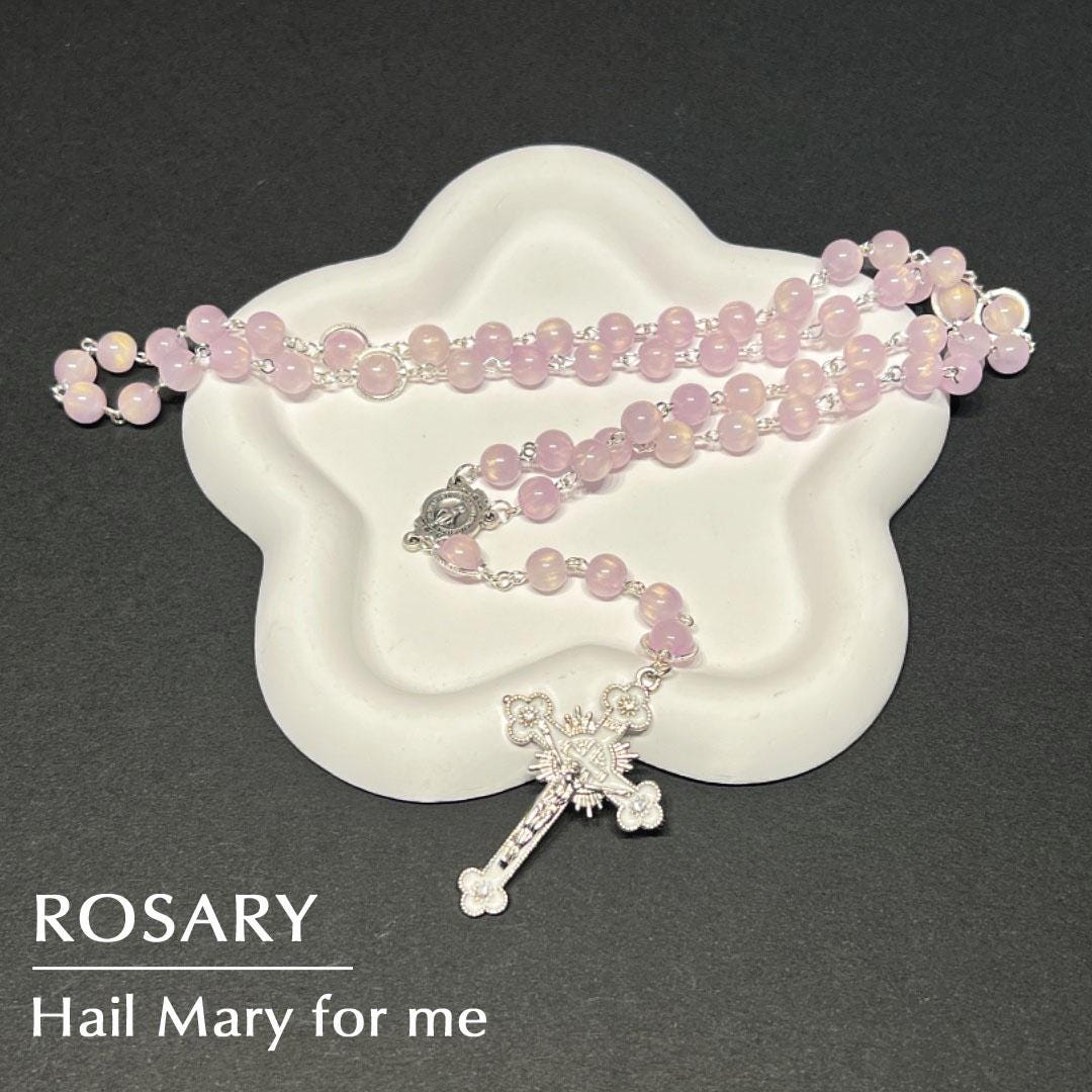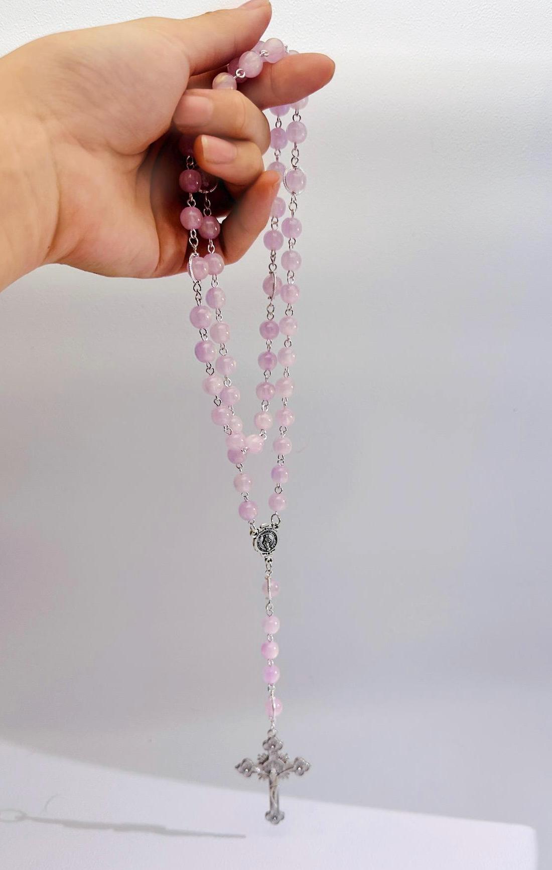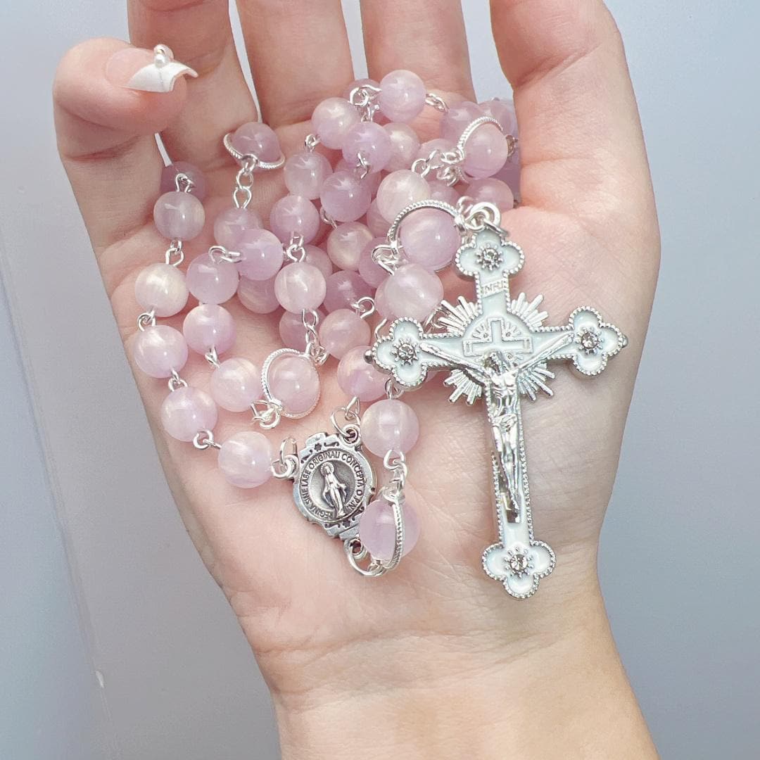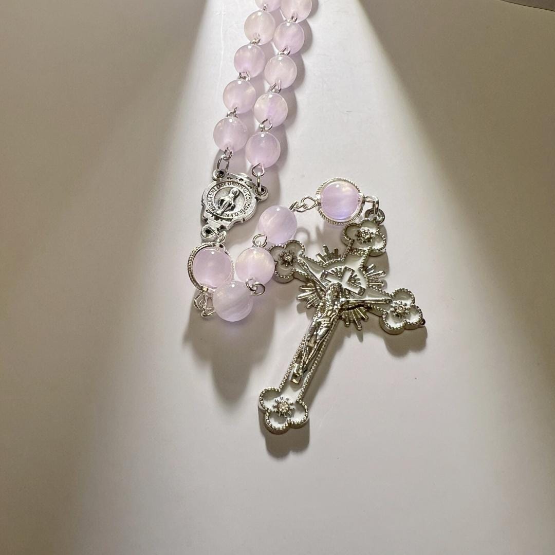 ✨ A versatile handmade rosary designed for both prayer and everyday wear. Crafted with translucent pink-purple resin beads that imitate the shimmer of natural cat’s eye.