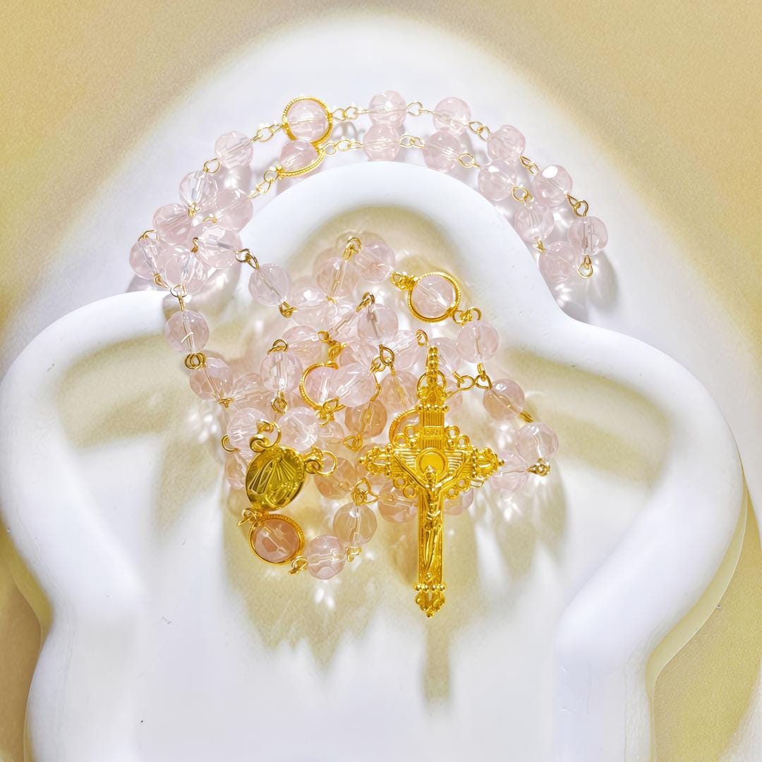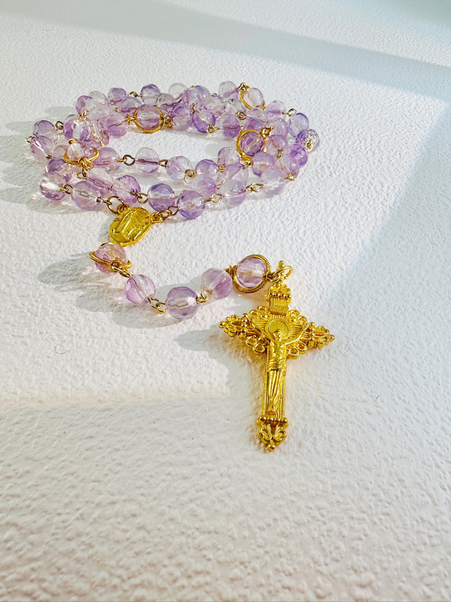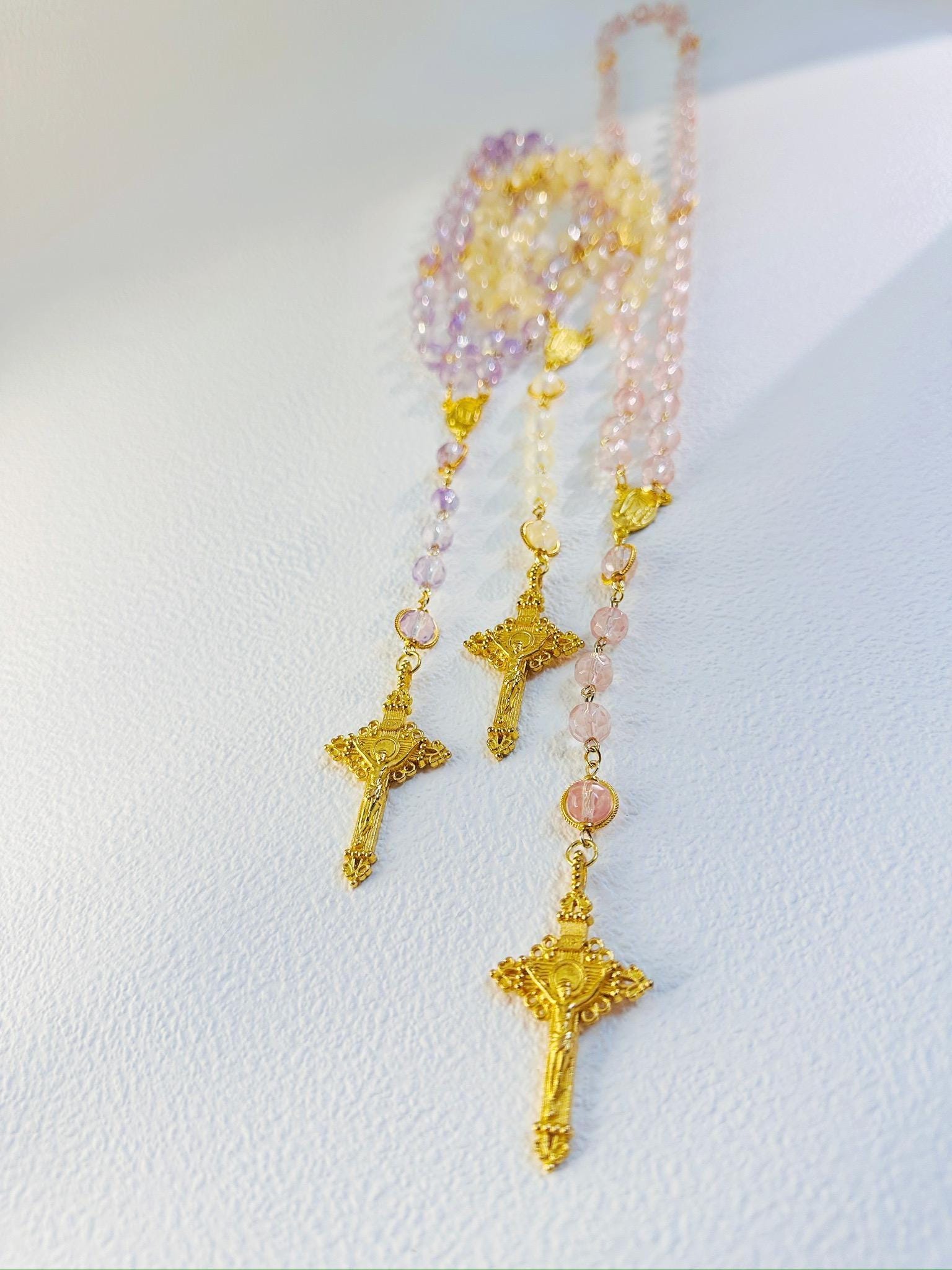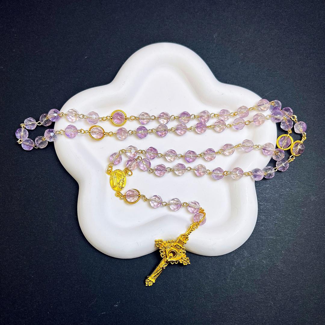 Elegant Purple Pink or Gold Crystal Glass Rosary 8 mm Golden Beads with Chain Catholic Prayer Beads Christmas Gift for Sisters in Christ