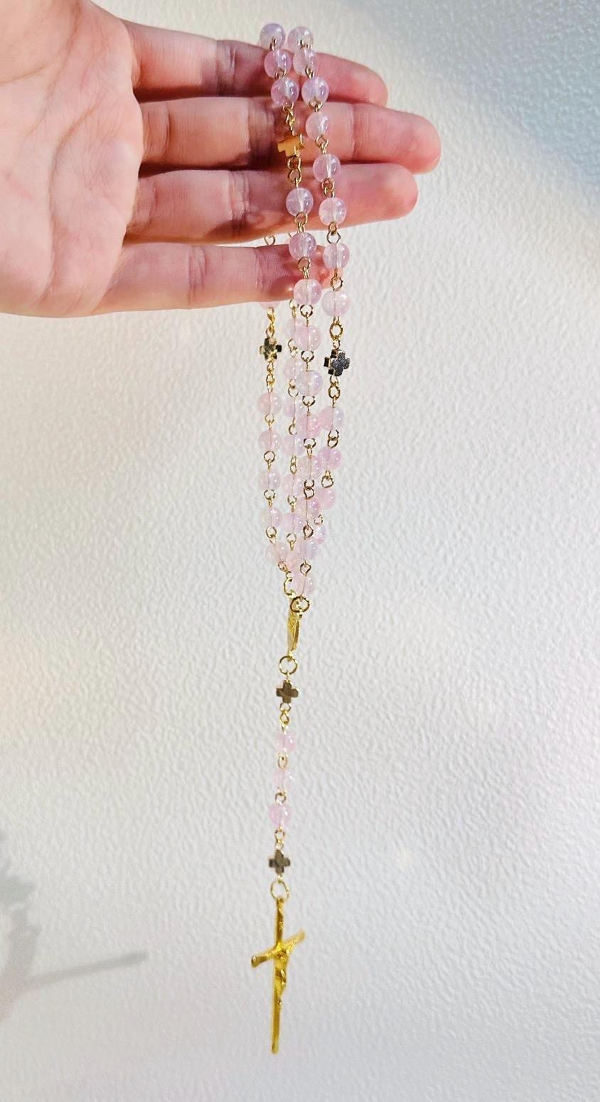 🌸 A beautifully handmade rosary featuring 8mm purple, pink, and gold-toned glass beads on a delicate gold-plated chain.