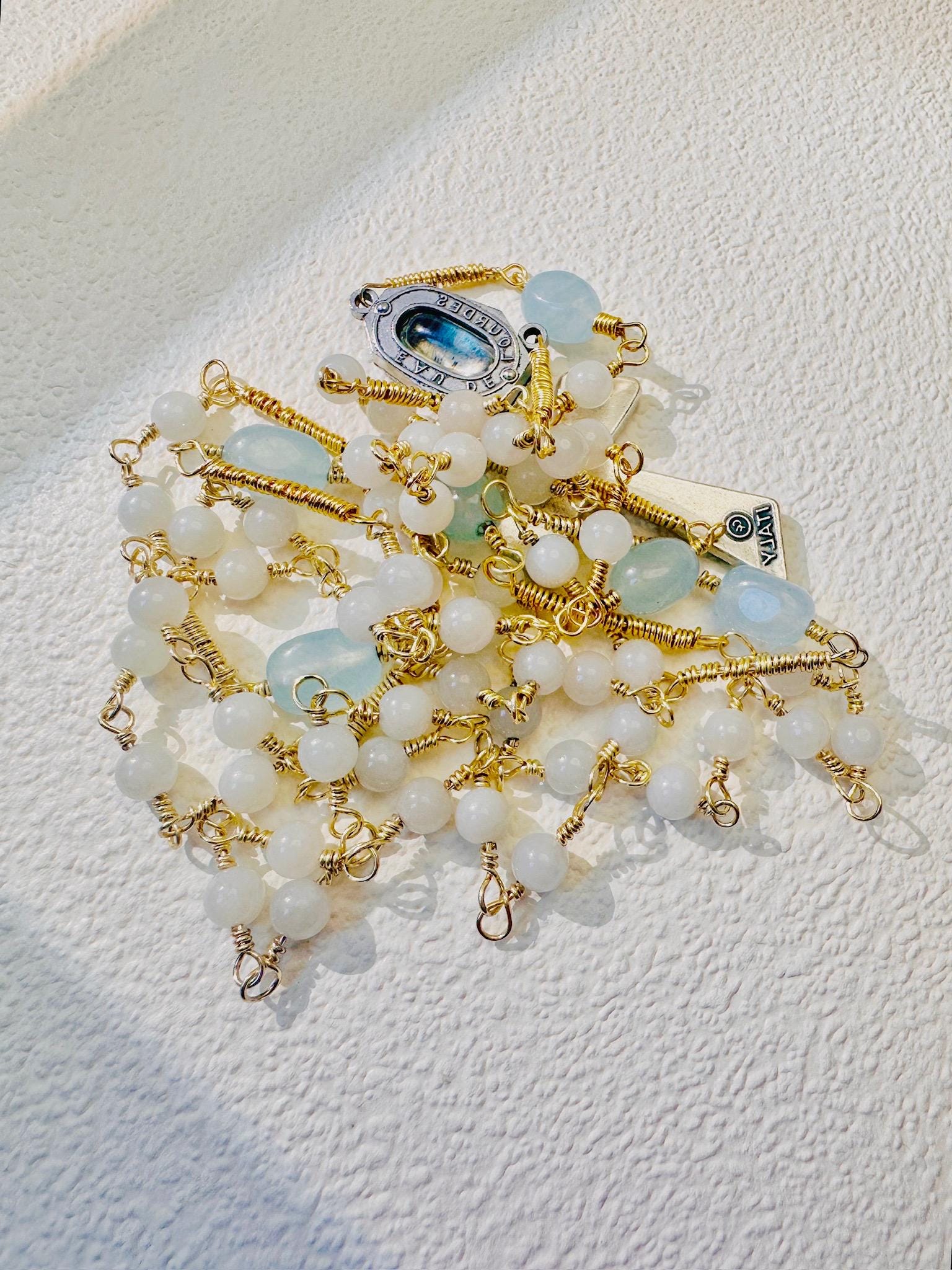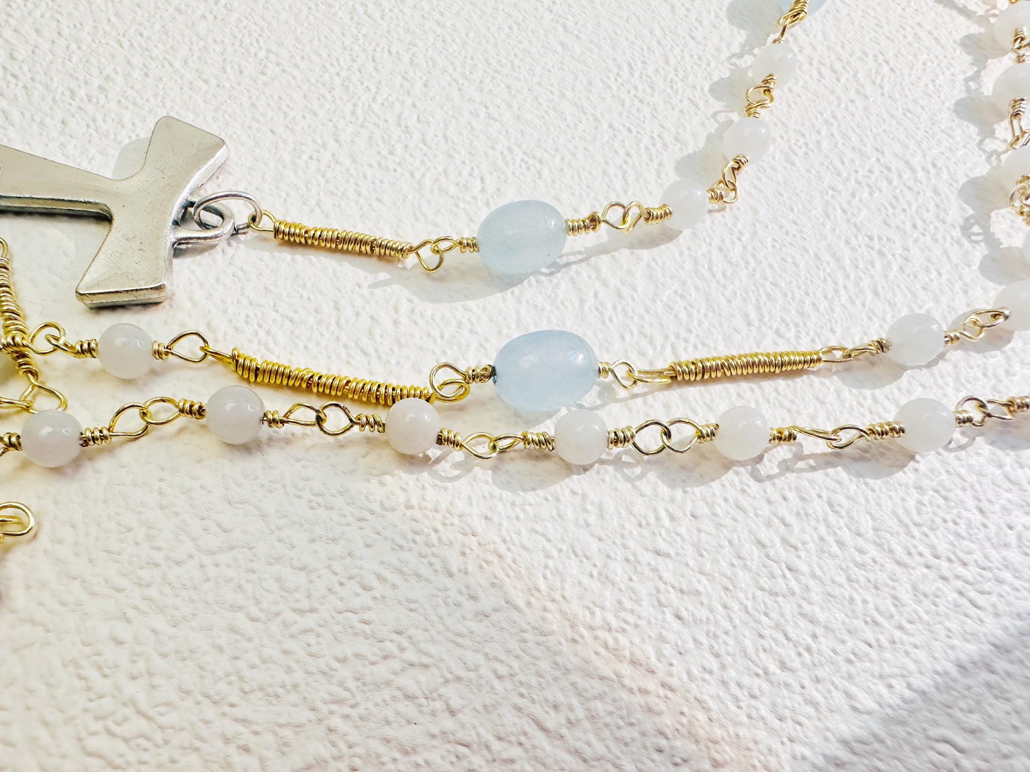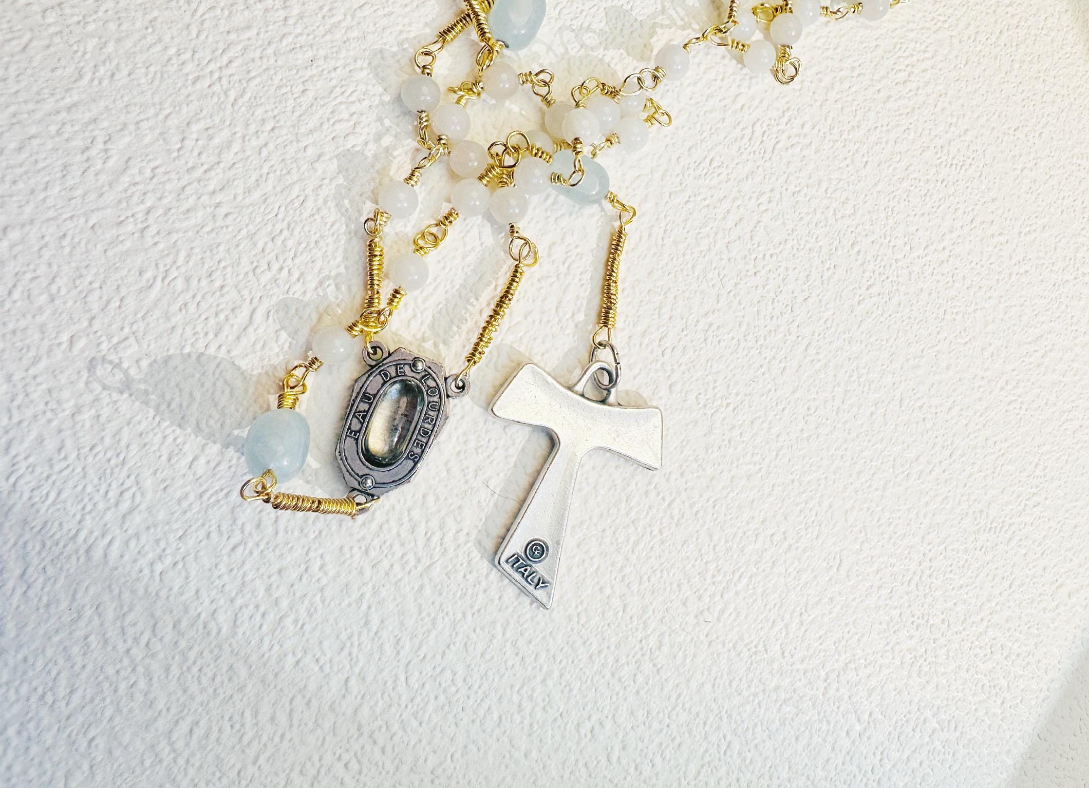 Durable Hand Knotted Rosary Prayer Beads with Lourdes Water Tau Cross Natural Burmese Lavender Jade and Aquamarine Crystal