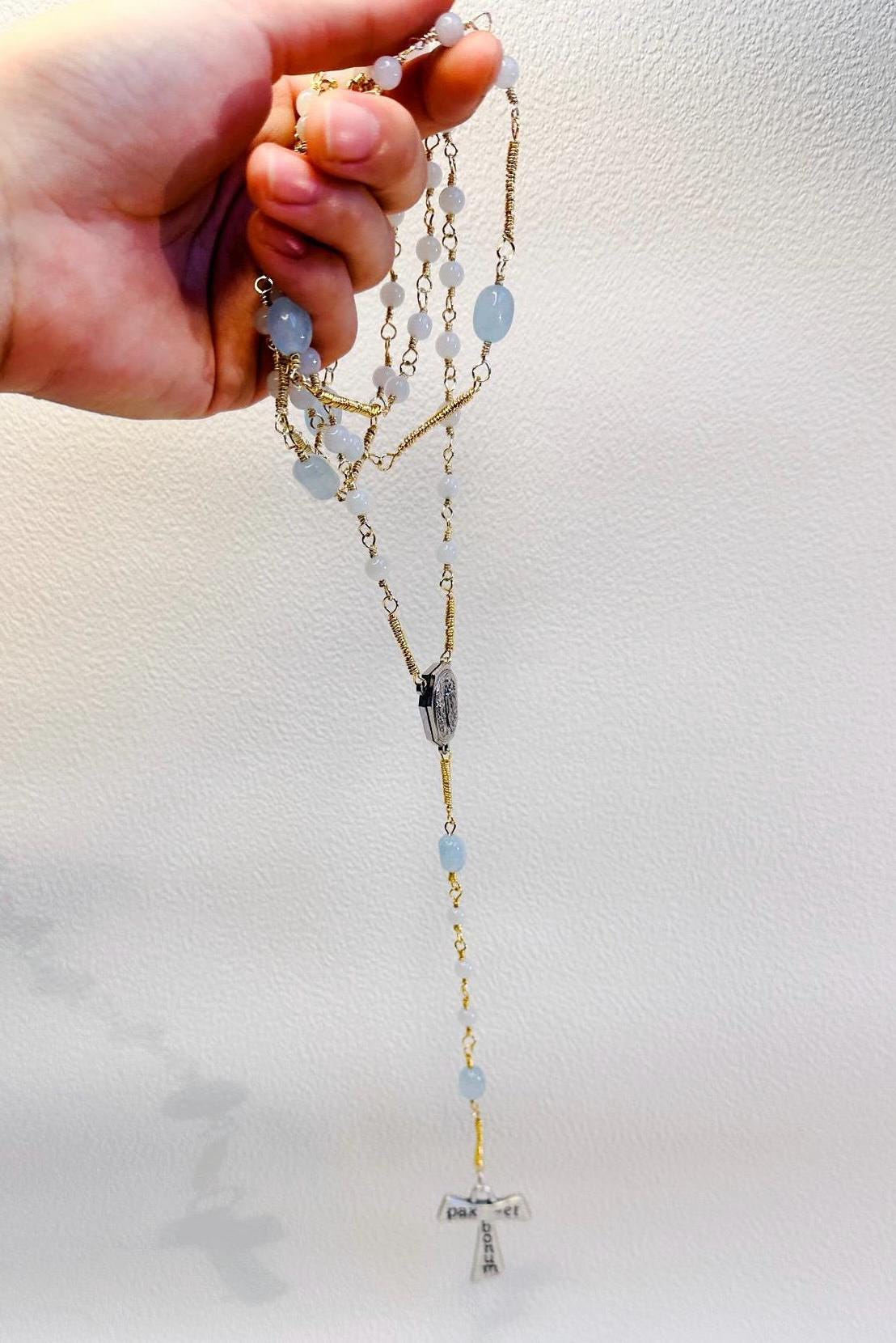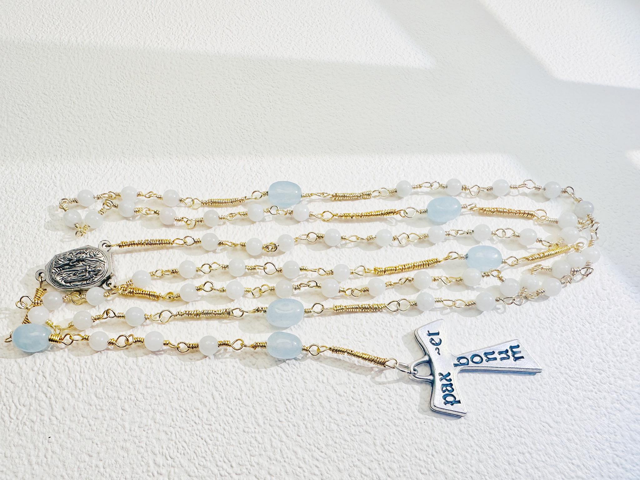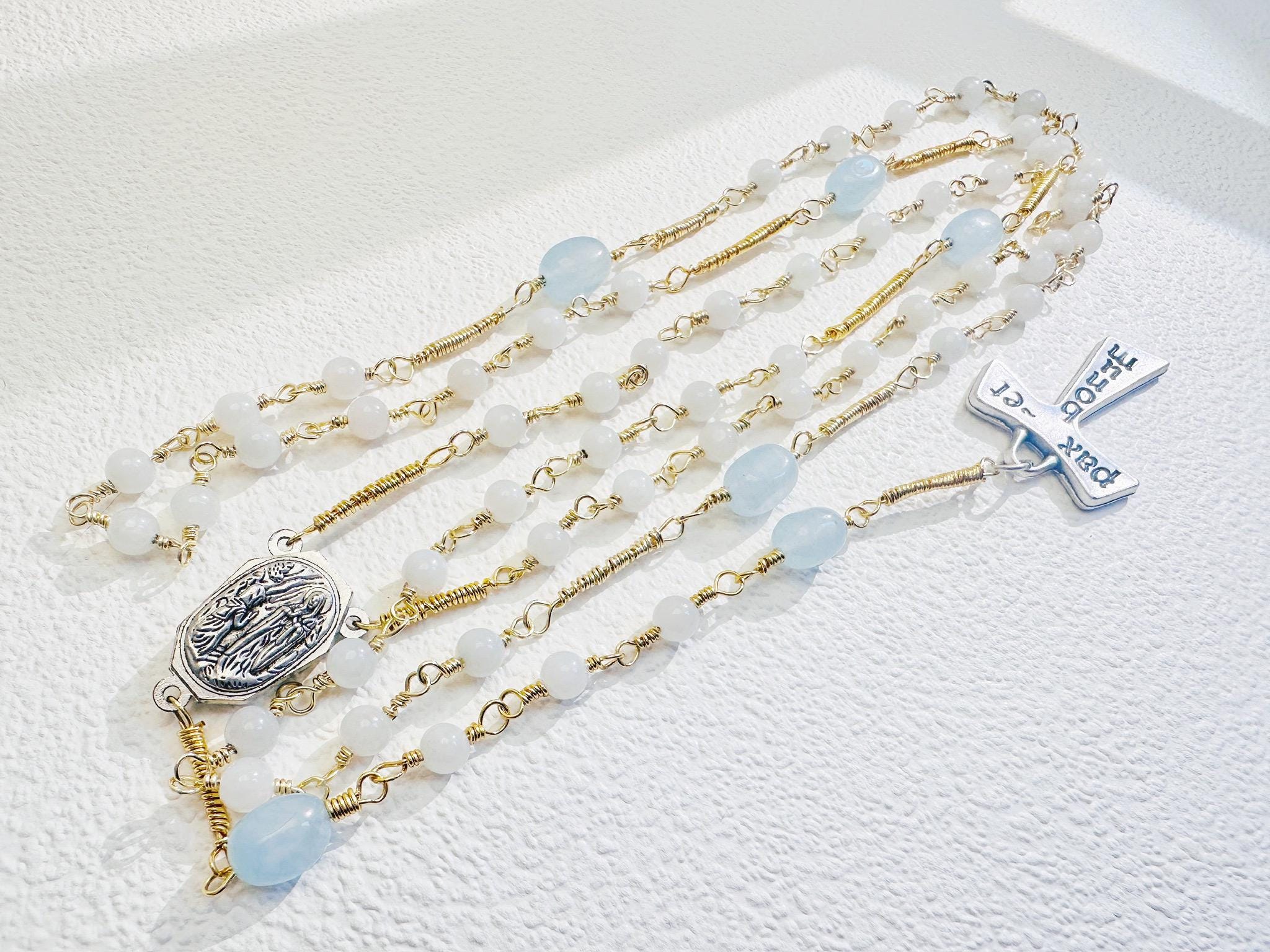 Durable Hand Knotted Rosary Prayer Beads with Lourdes Water Tau Cross Natural Burmese Lavender Jade and Aquamarine Crystal