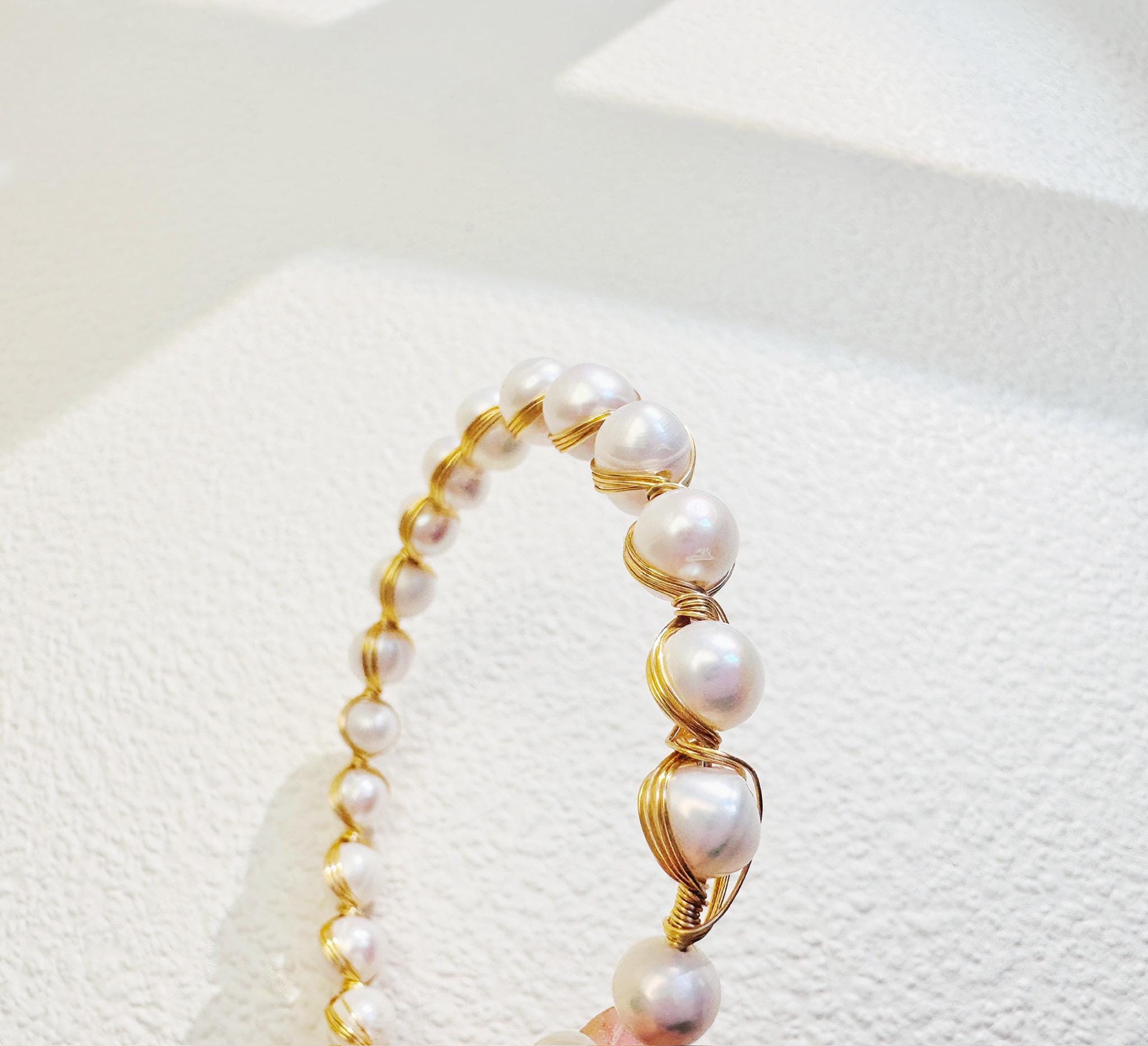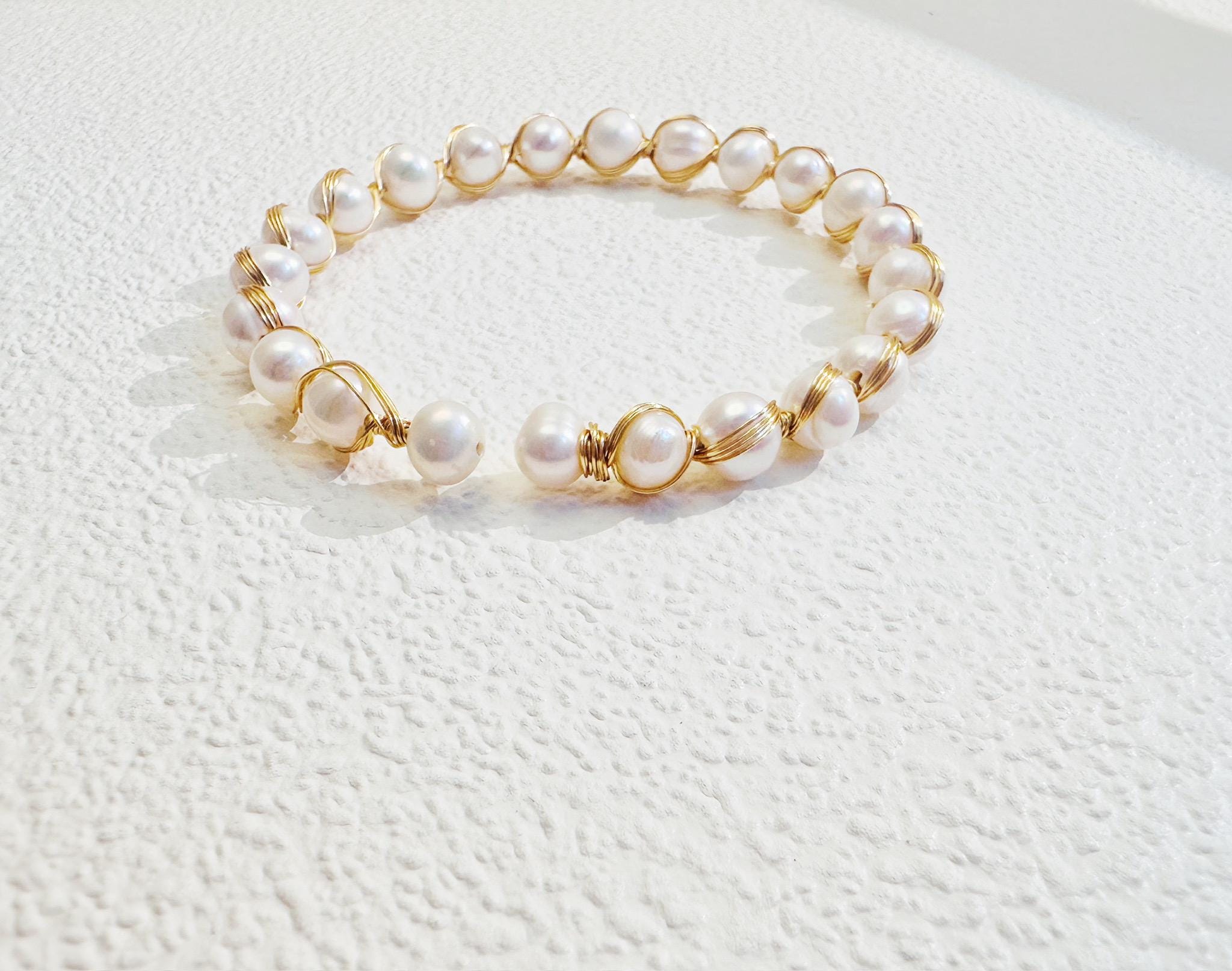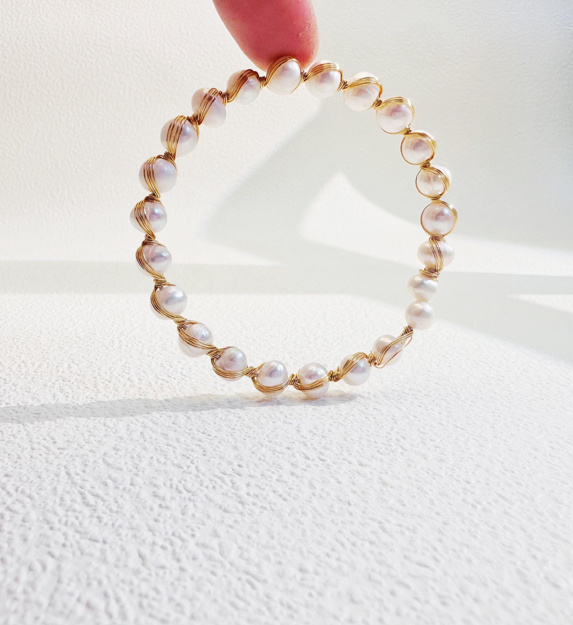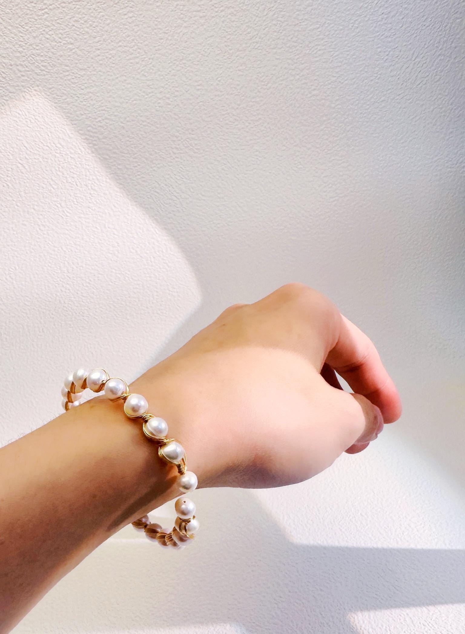 A flowing wave of glossy freshwater pearls, wrapped with durable 14k gold-plated wire. This bracelet blends modern minimalism with timeless elegance.