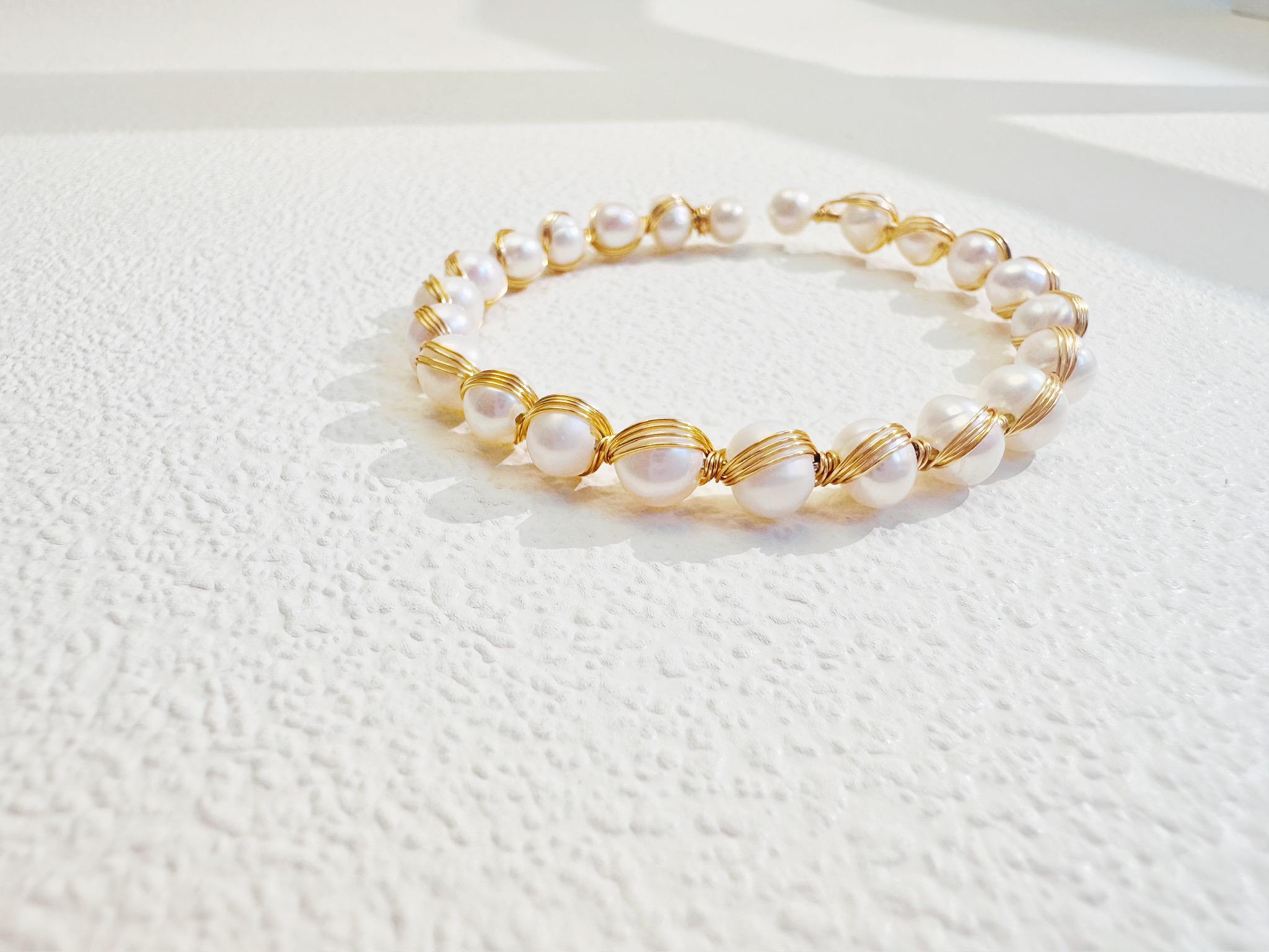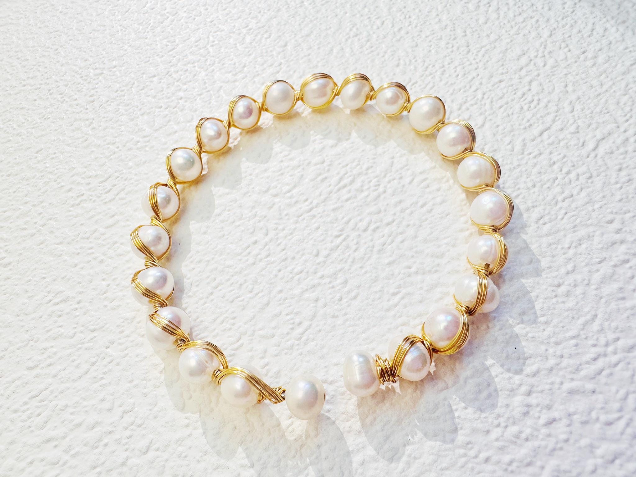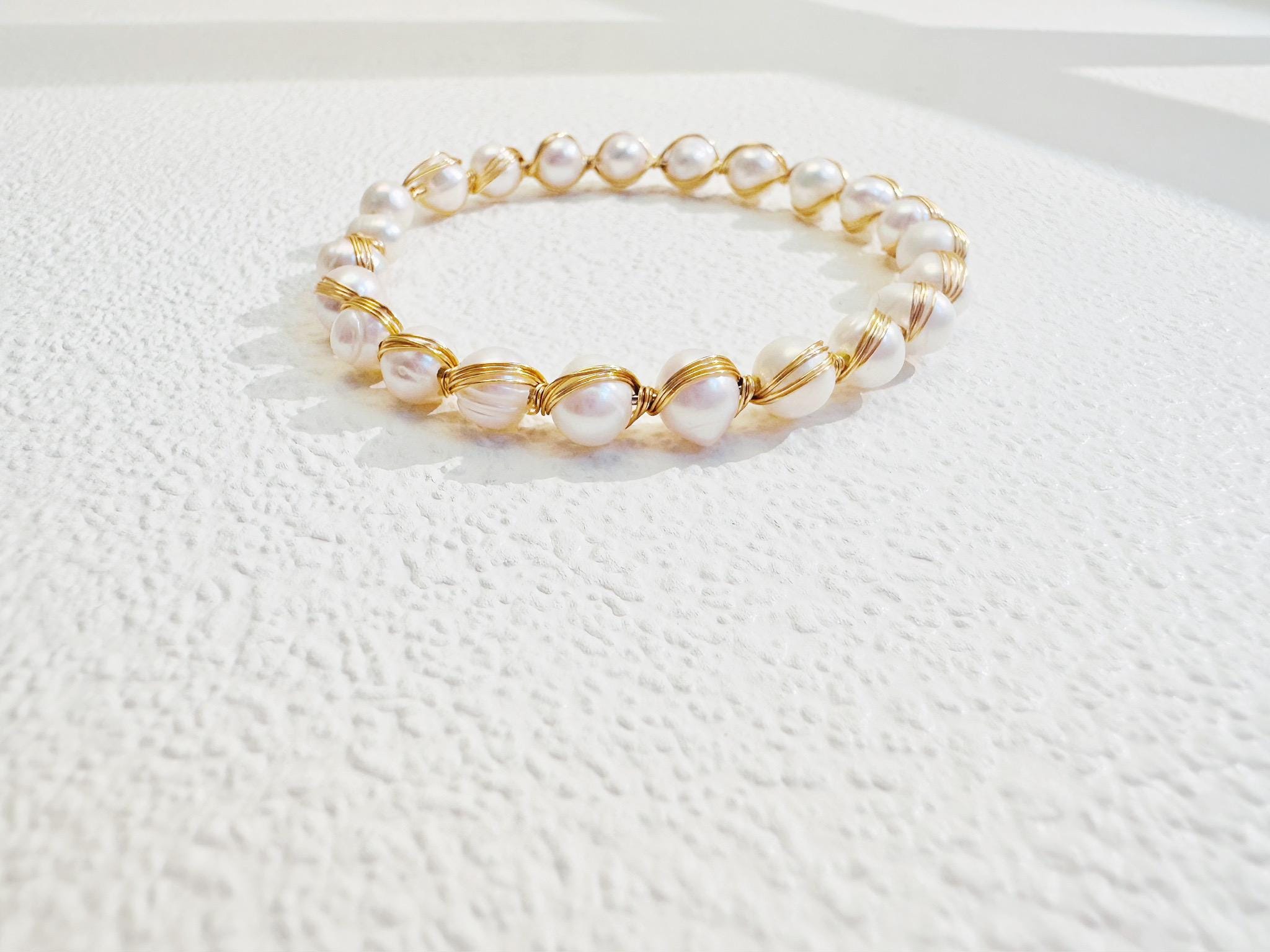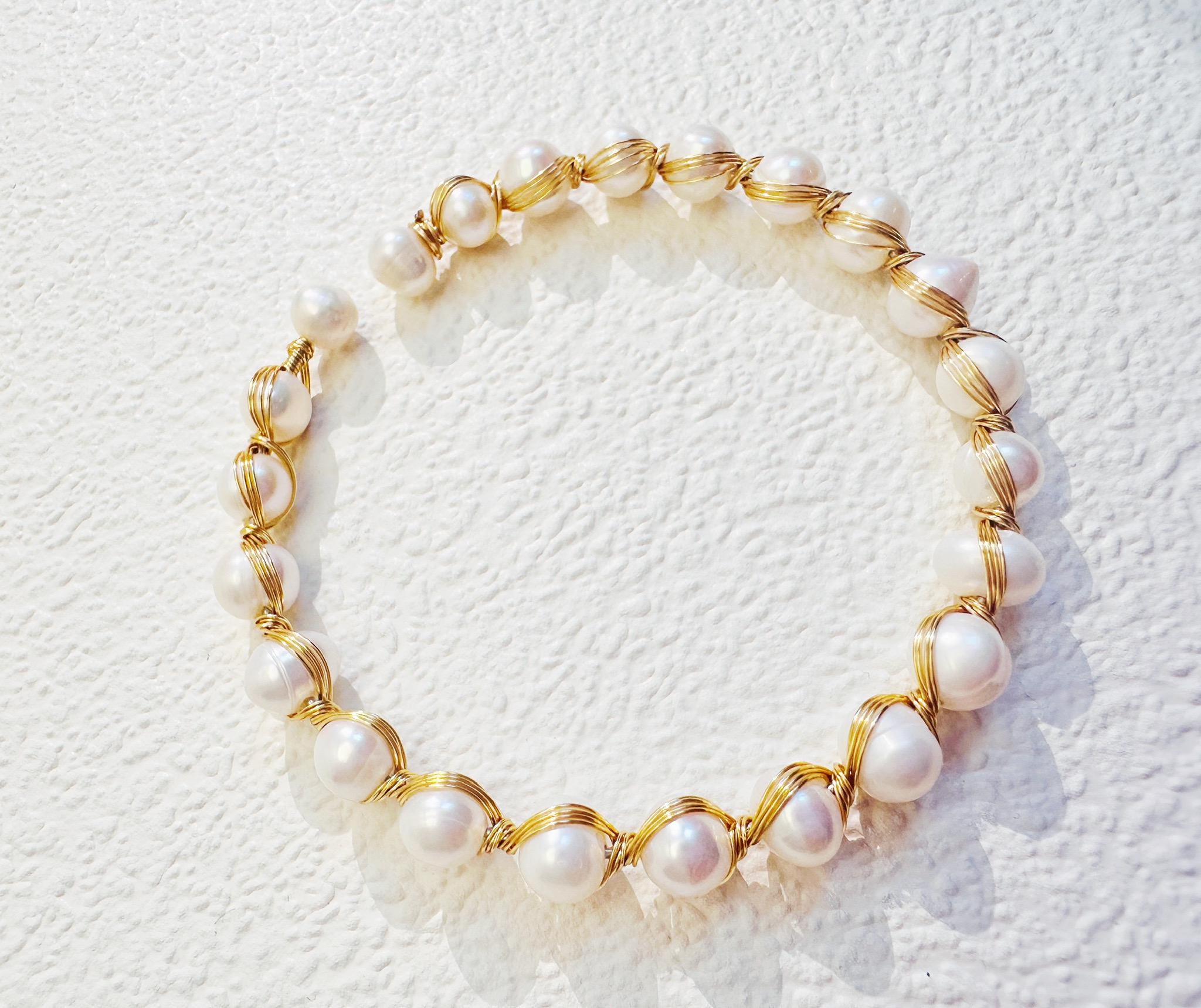 A flowing wave of glossy freshwater pearls, wrapped with durable 14k gold-plated wire. This bracelet blends modern minimalism with timeless elegance.