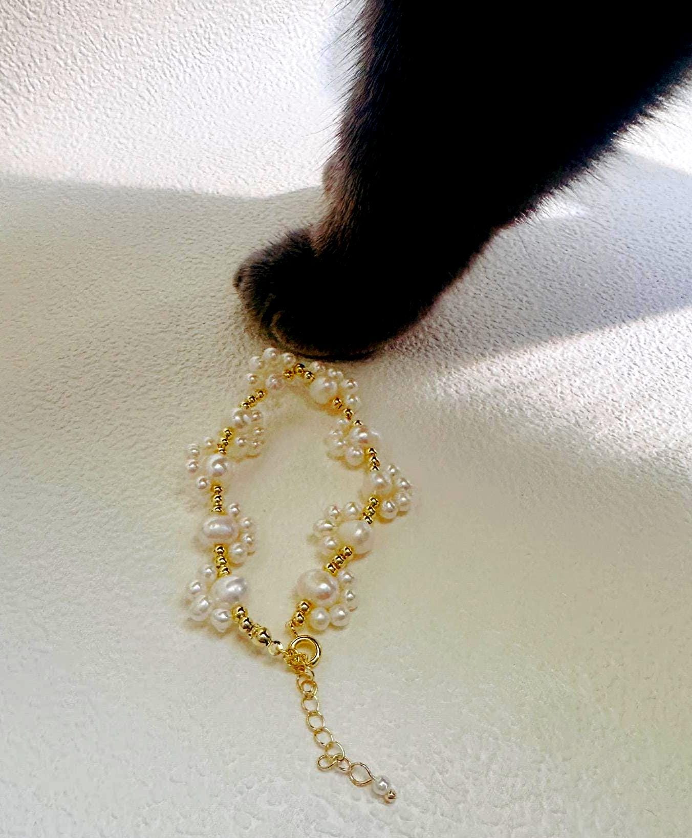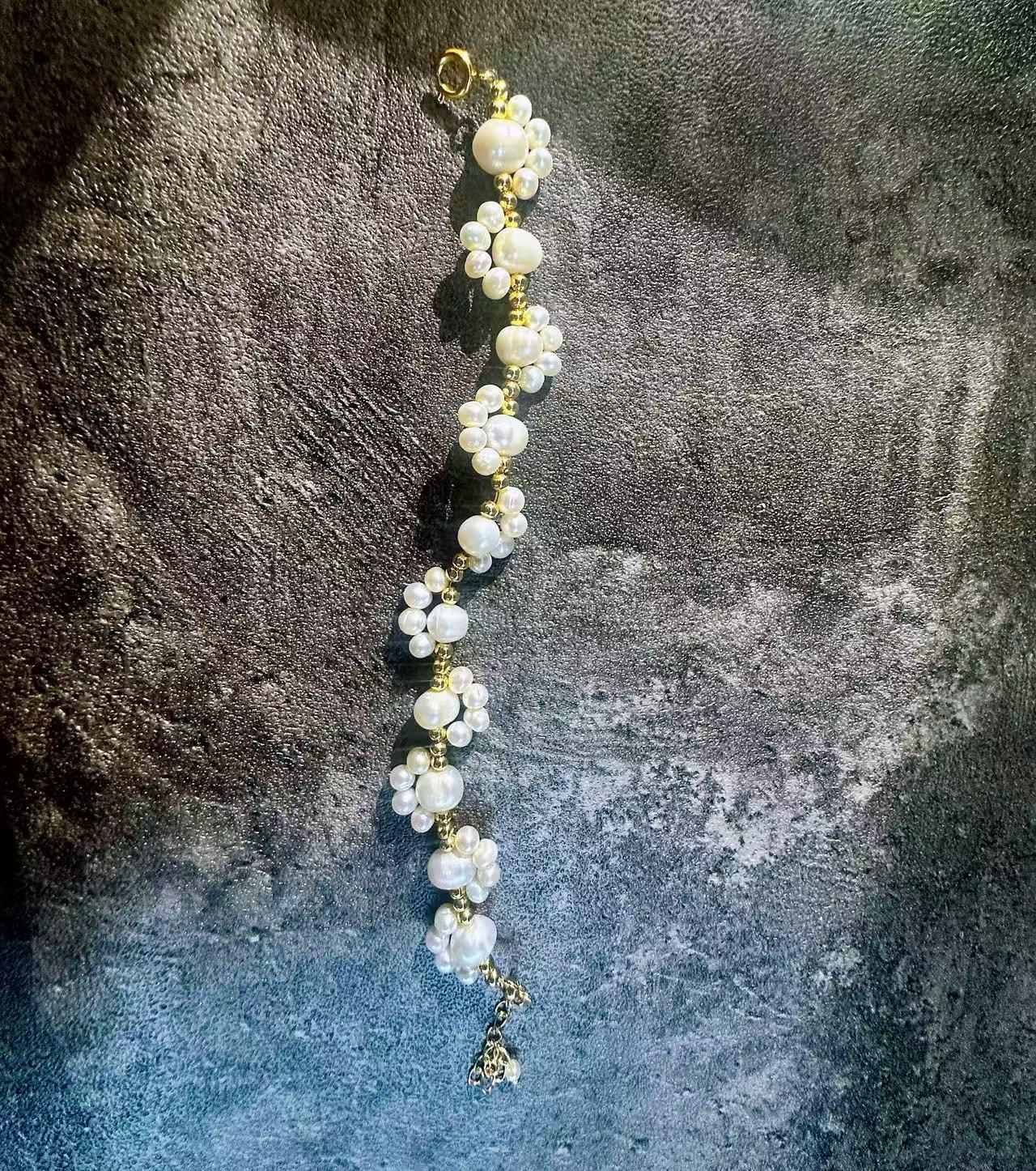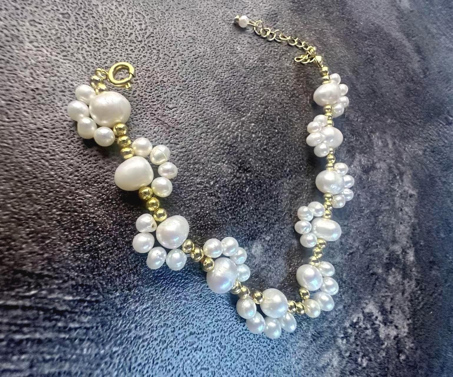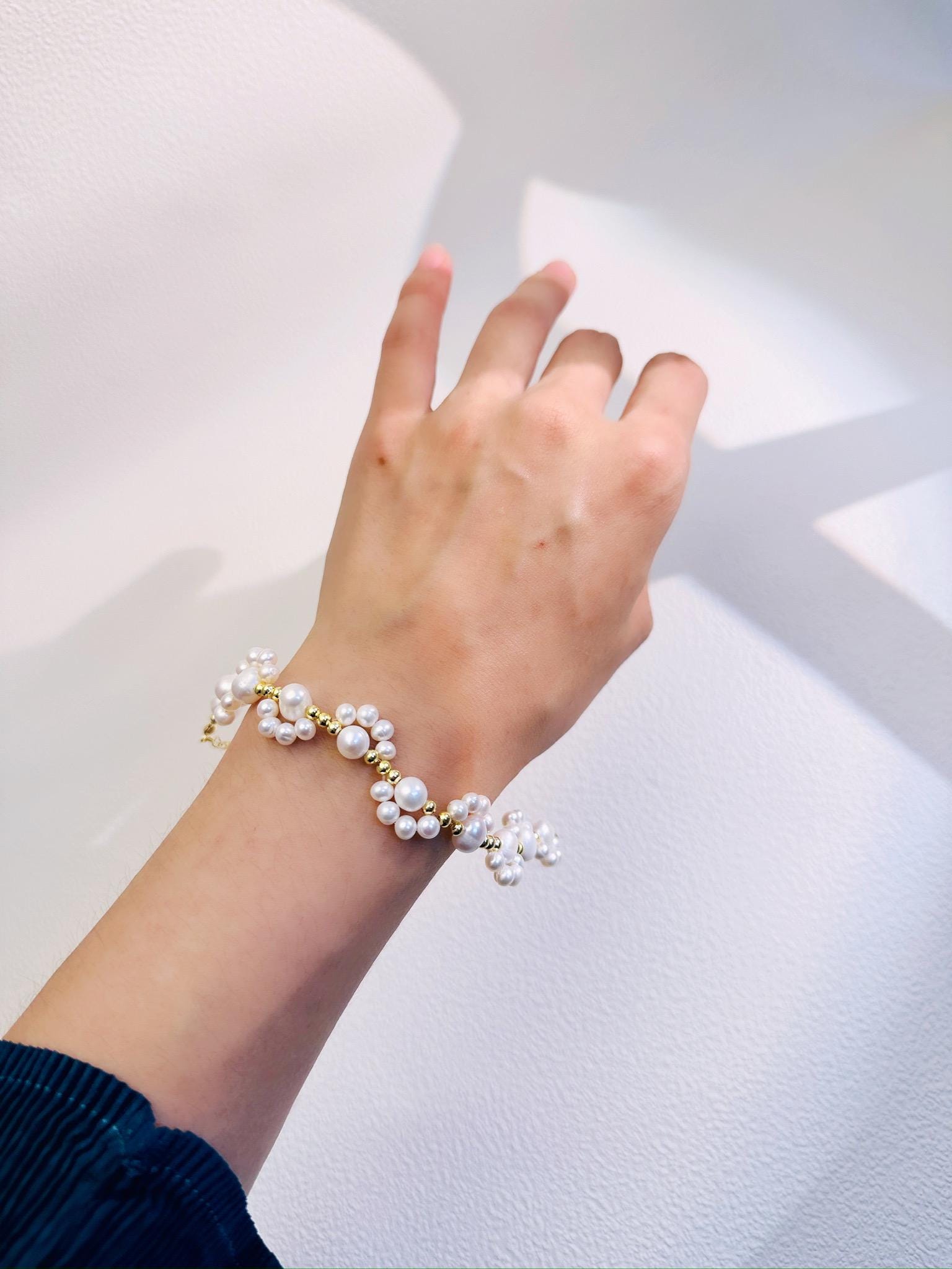 Handwoven with freshwater pearls and gold-plated beads, it’s light and comfortable while still looking elegant. The length is adjustable, making it perfect for everyday wear or stacking with other bracelets.