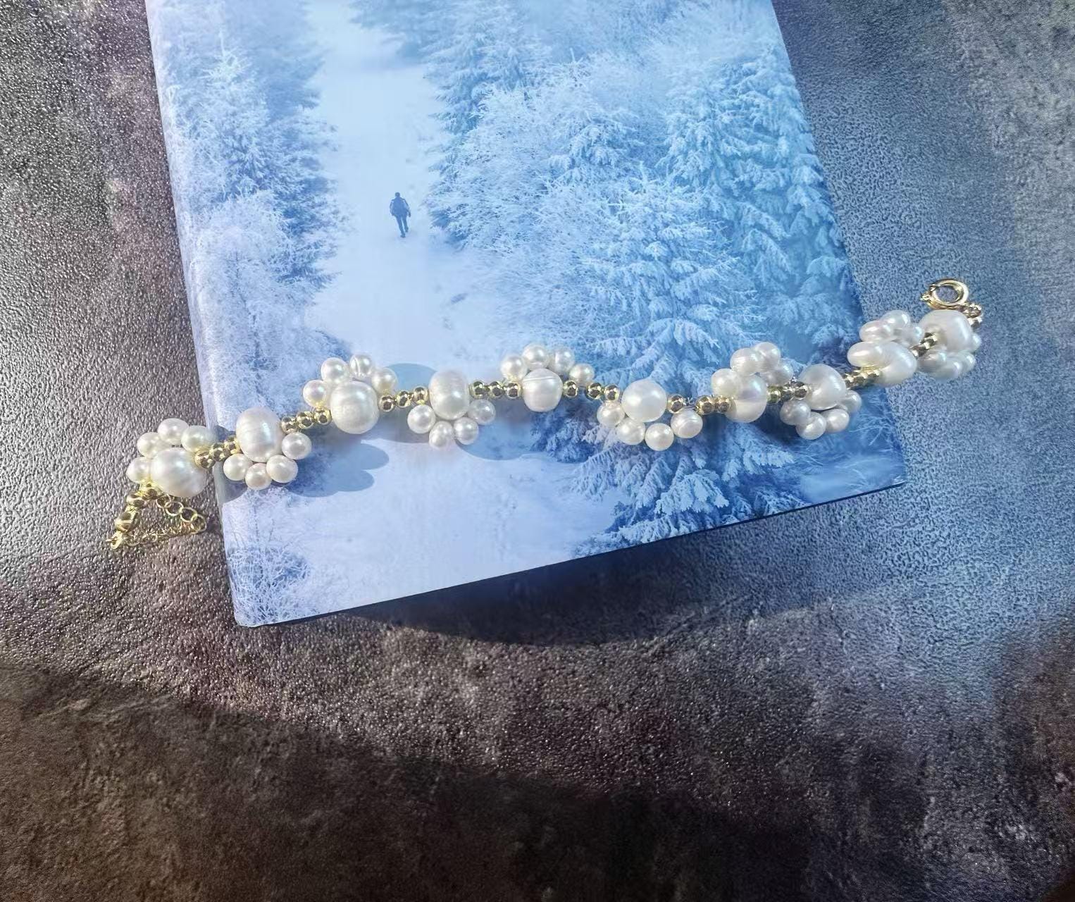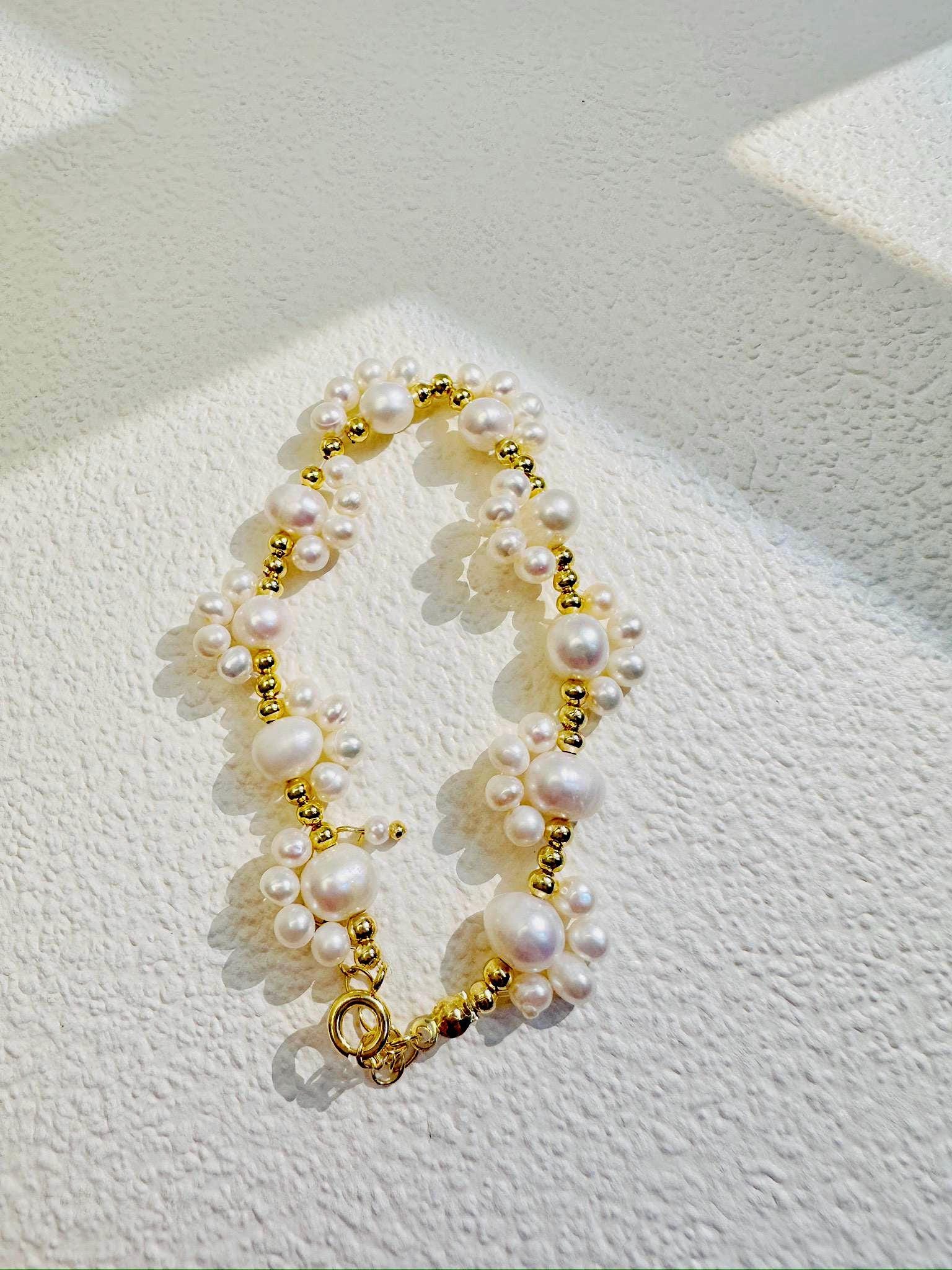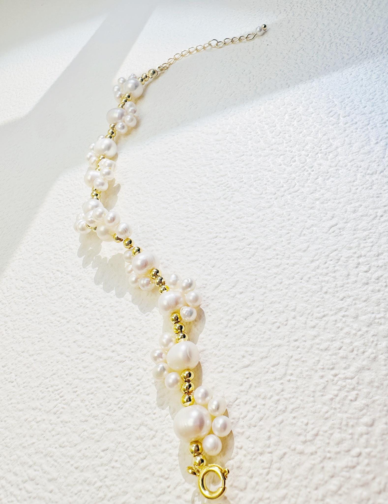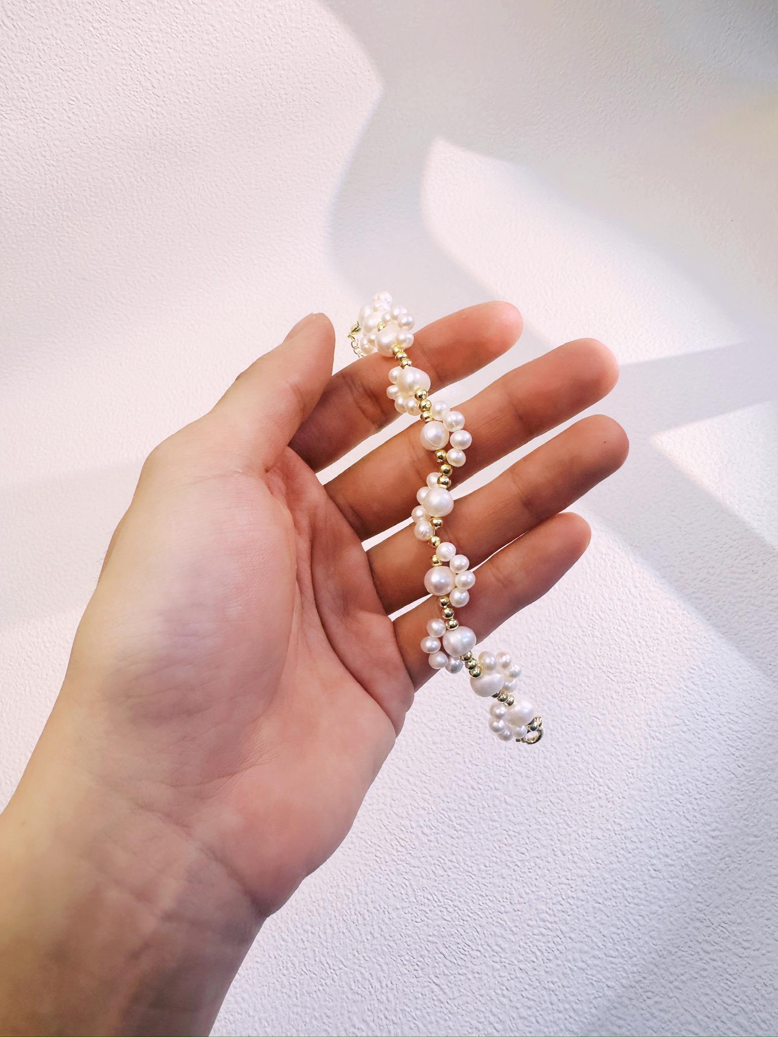 Handwoven with freshwater pearls and gold-plated beads, it’s light and comfortable while still looking elegant. The length is adjustable, making it perfect for everyday wear or stacking with other bracelets.