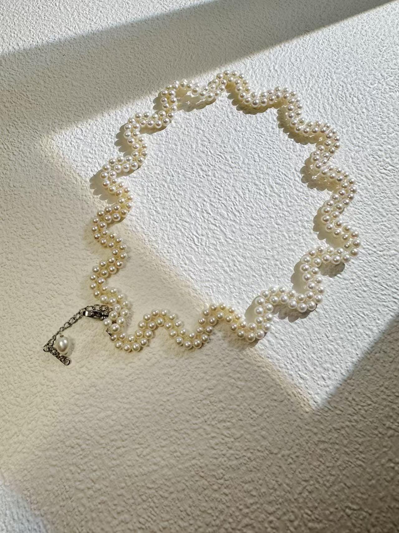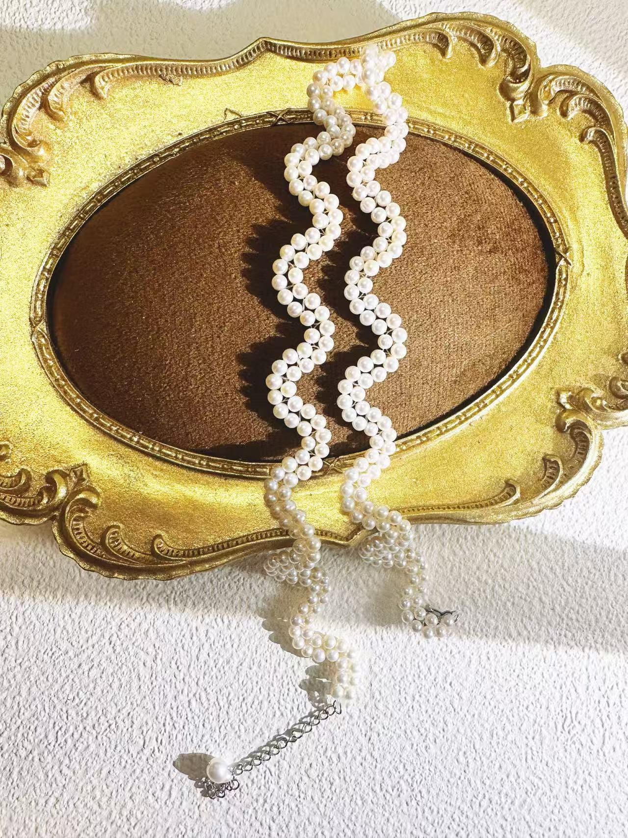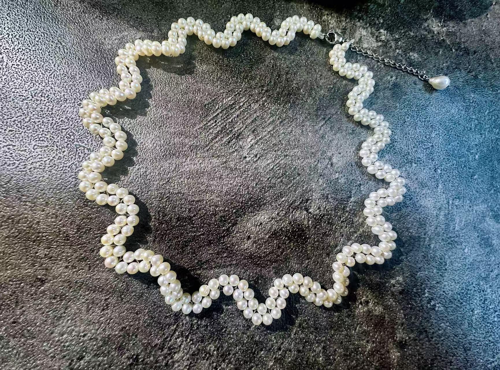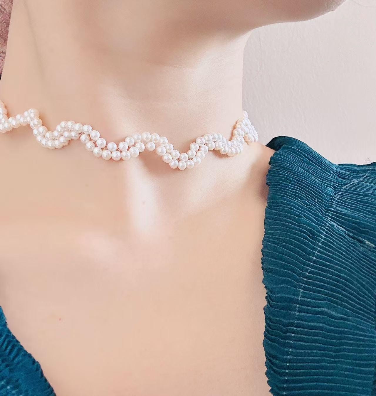 Hand-strung with lustrous 3–4mm freshwater pearls, this Pearl Wave Statement Choker blends vintage romance with whimsical fantasy. Each curve is patiently woven bead by bead on durable nylon cord — a delicate rhythm of pulling and releasing, where no two necklaces are ever exactly alike.