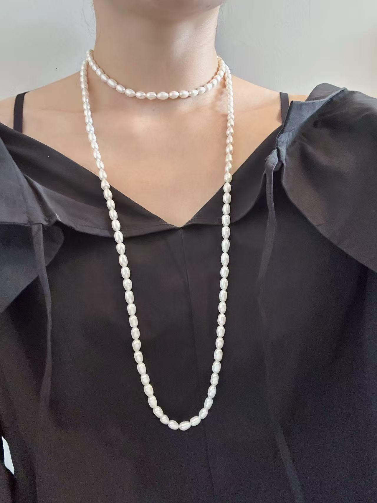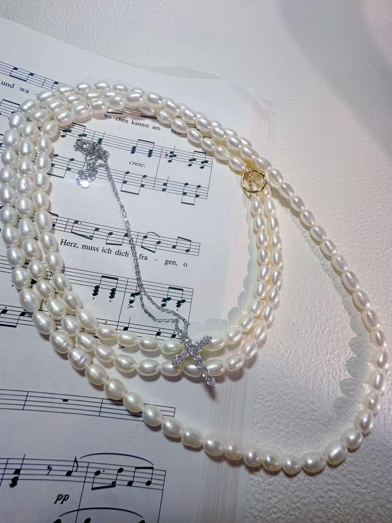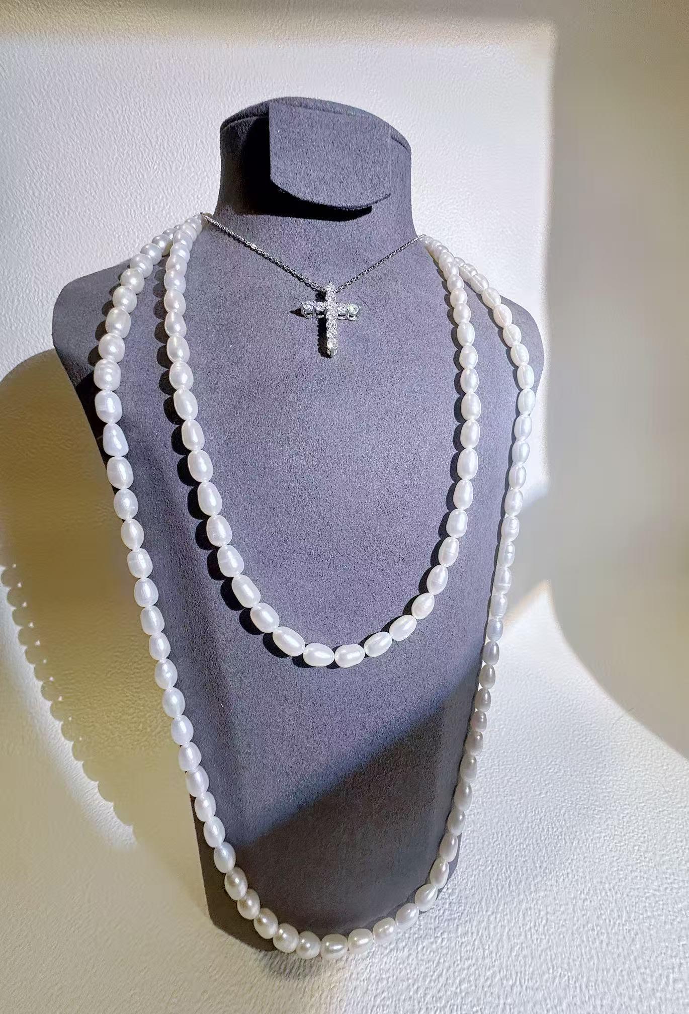β¨ Elegant faith-inspired jewelry made with rare rice-shaped freshwater pearls. Smooth surface, gentle luster, almost flawless β refined and elegant, elongating the neckline. Unlike common round or baroque pearls, rice pearls in long strands are rarely seen, making this piece especially unique.