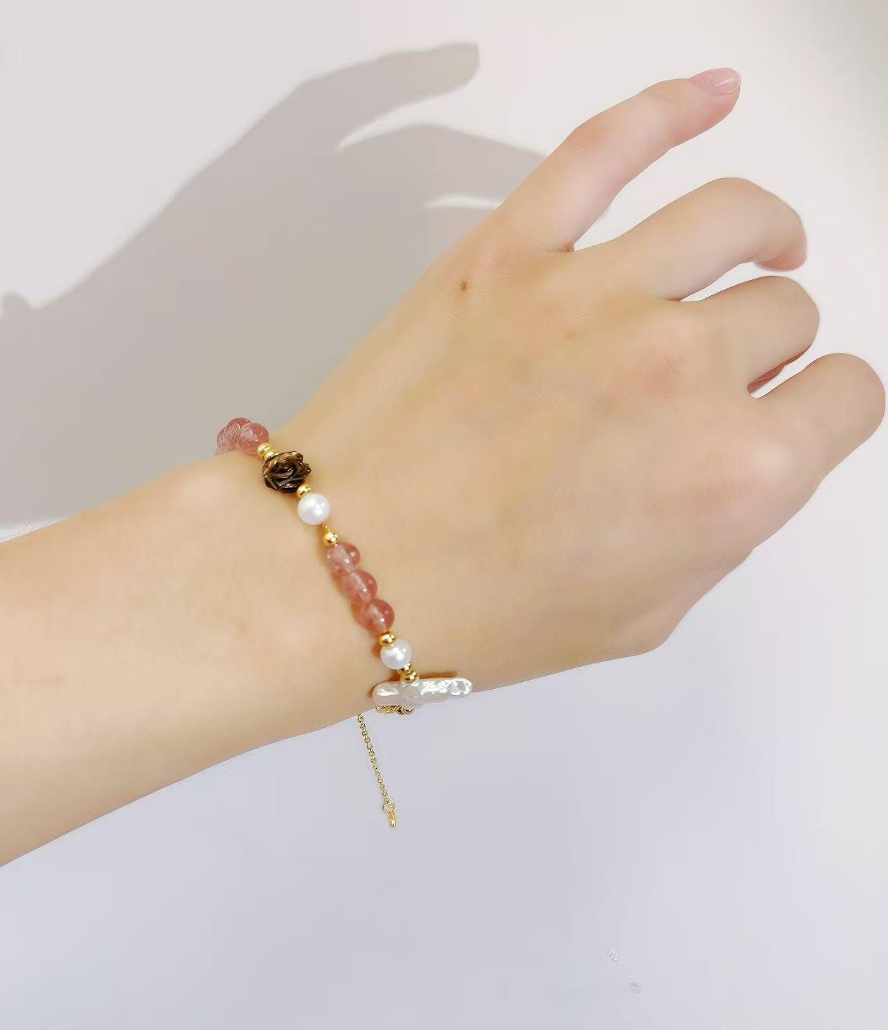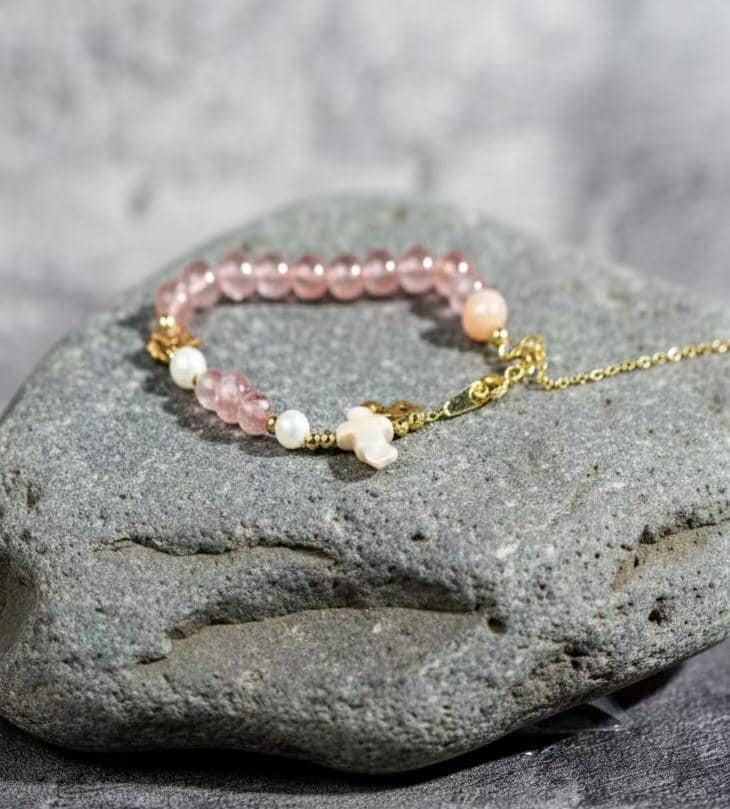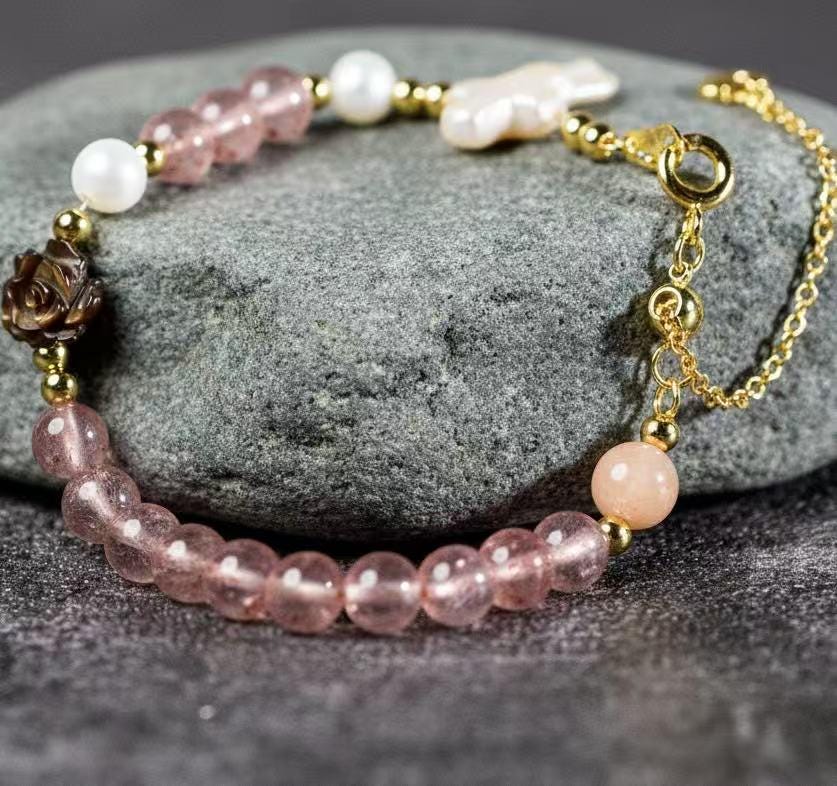 • Natural gemstones: strawberry quartz, freshwater pearls, moonstone, shell rose