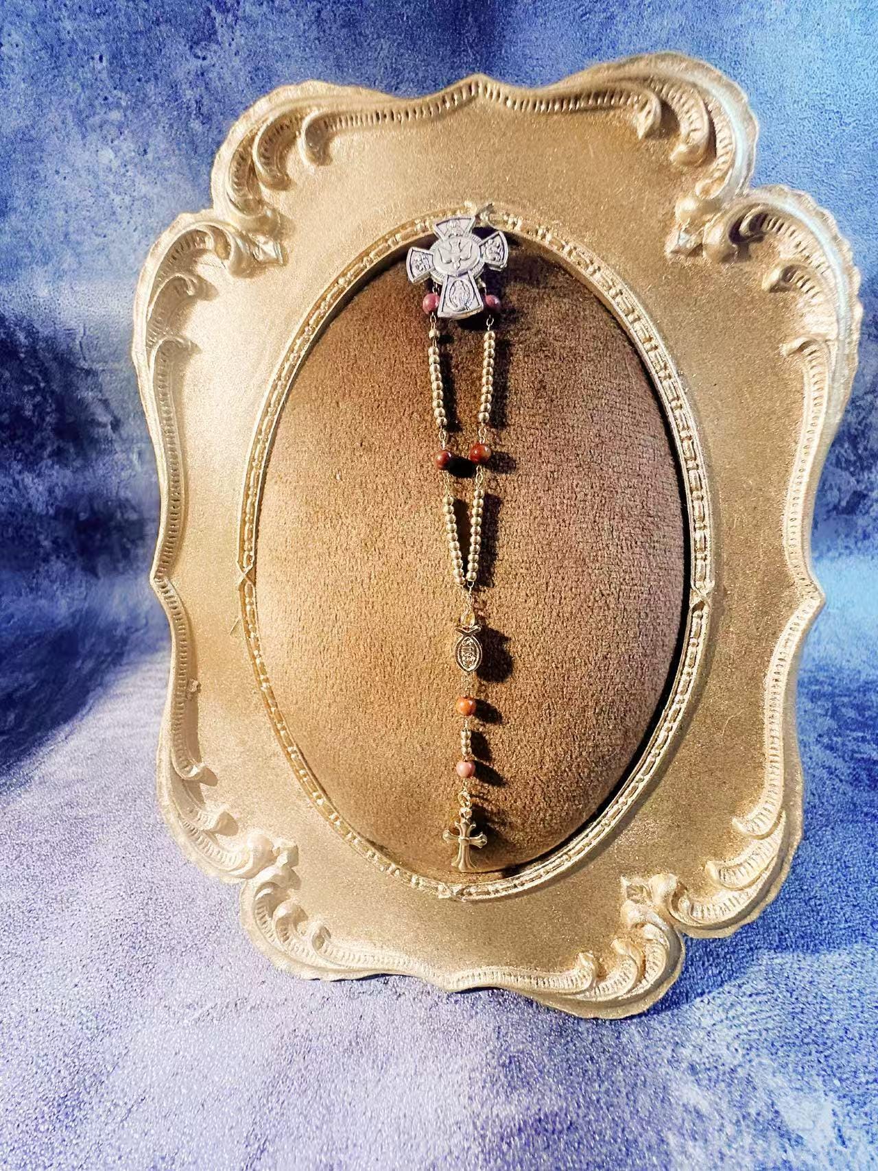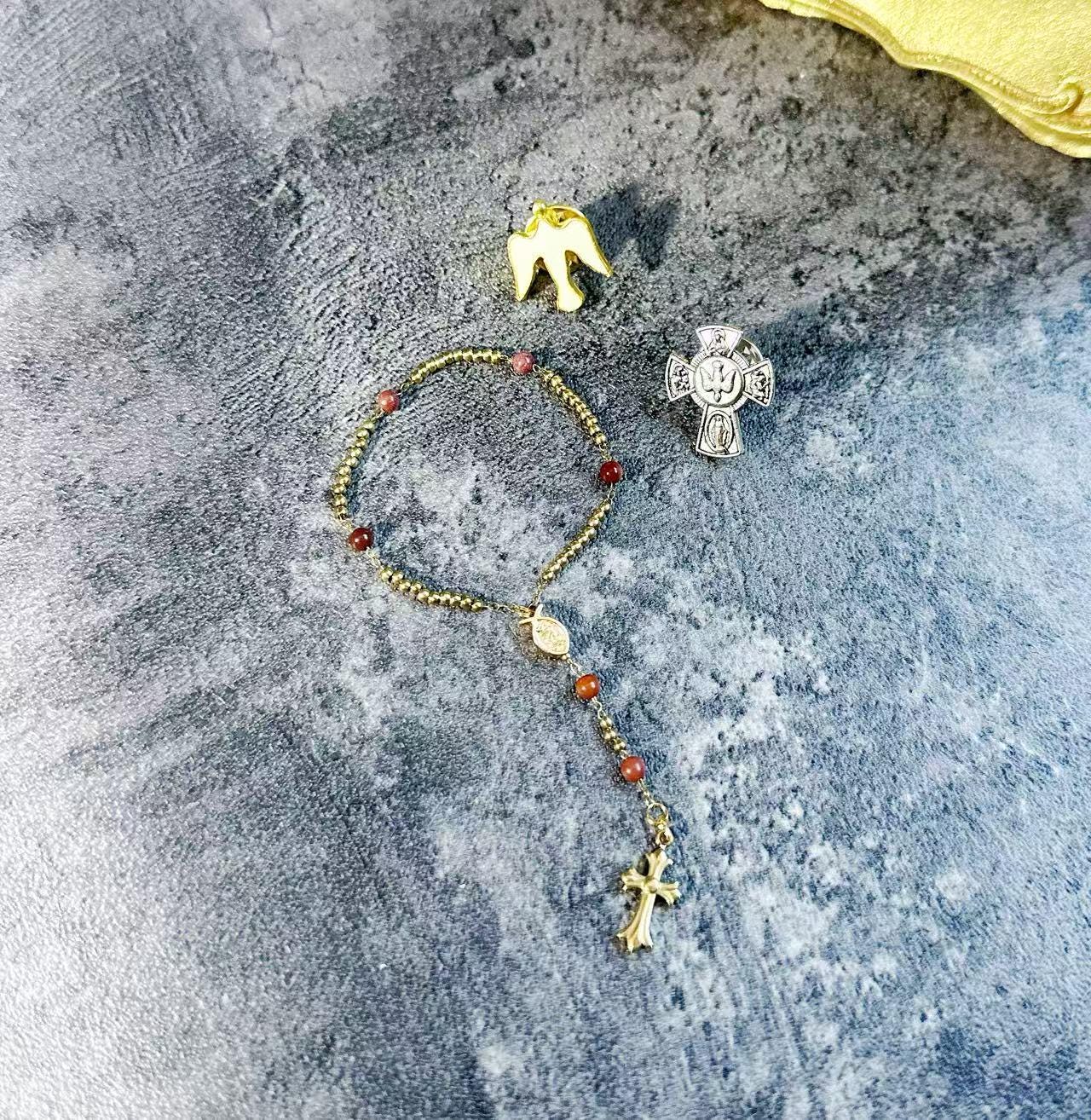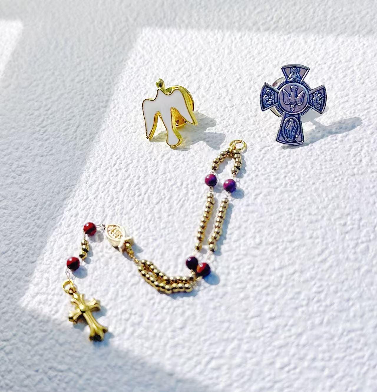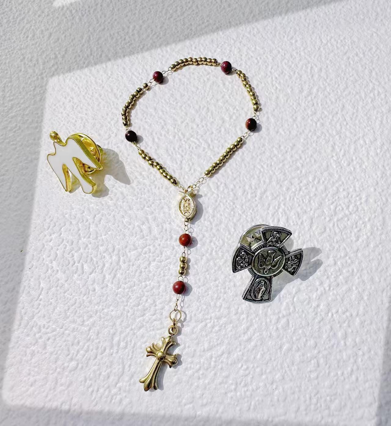 •This mini rosary brooch carries the full five-decade structure in miniature form, made with natural red stone beads (3.3–3.5 mm) and gold-plated titanium-steel chain.