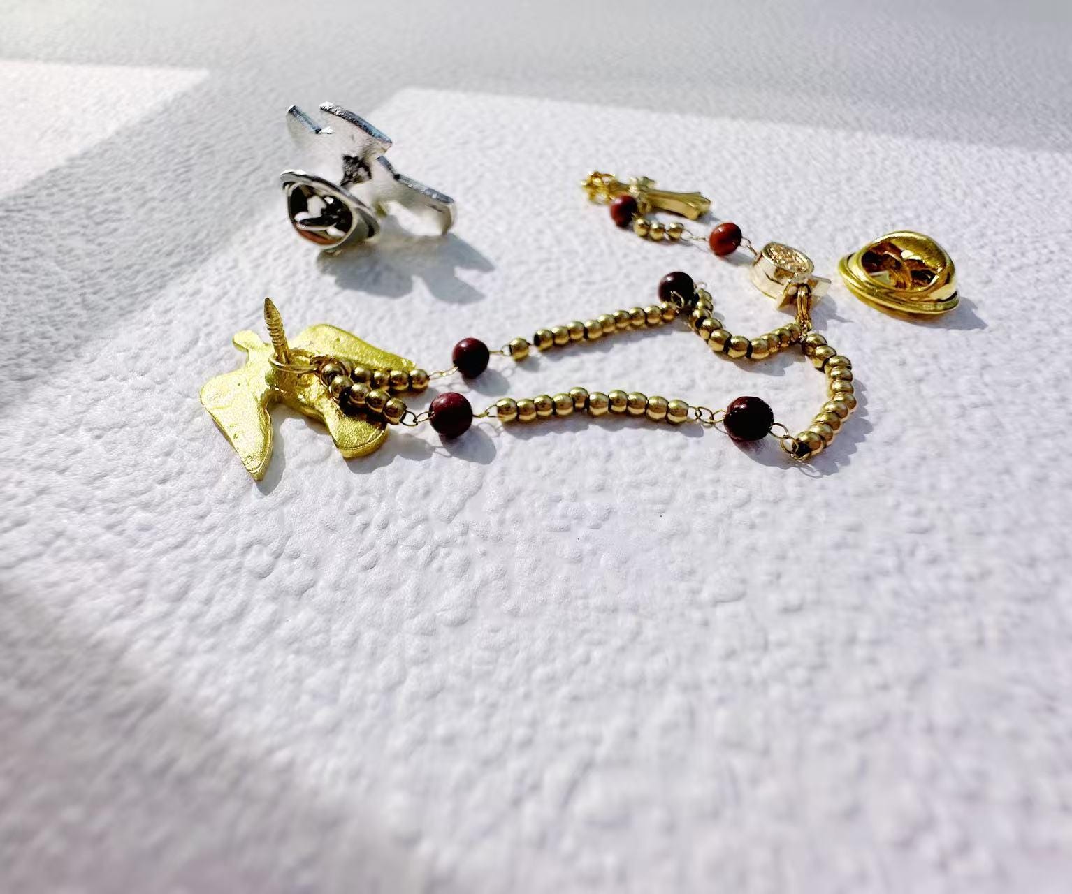• Weight: Rosary ≈ 2.38 g | Dove pin ≈ 1.8 g | Scapular pin ≈ 2.3 g