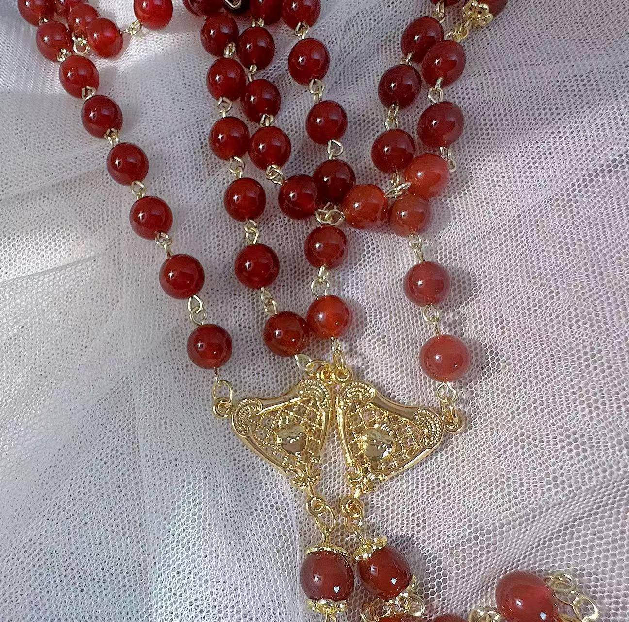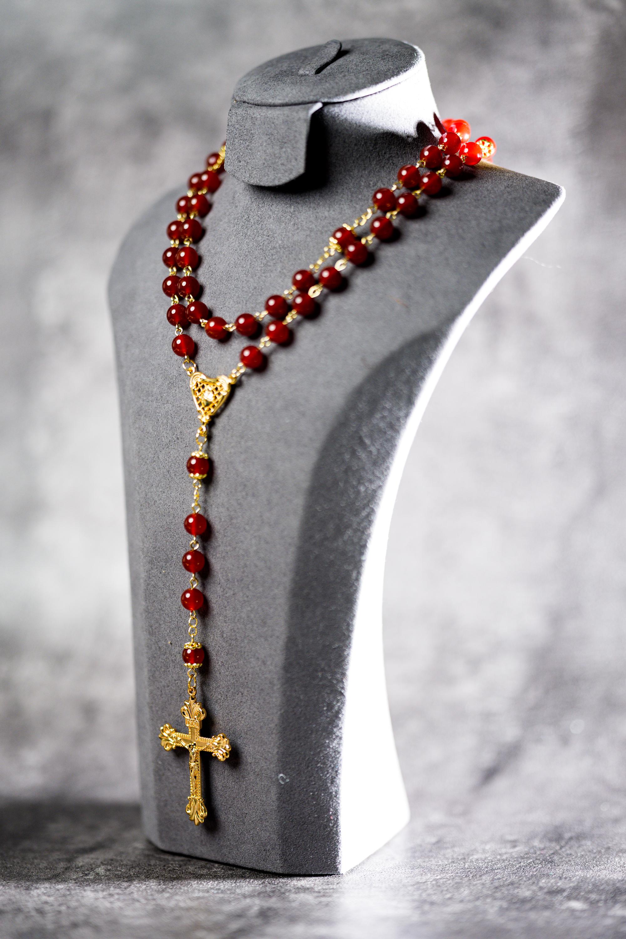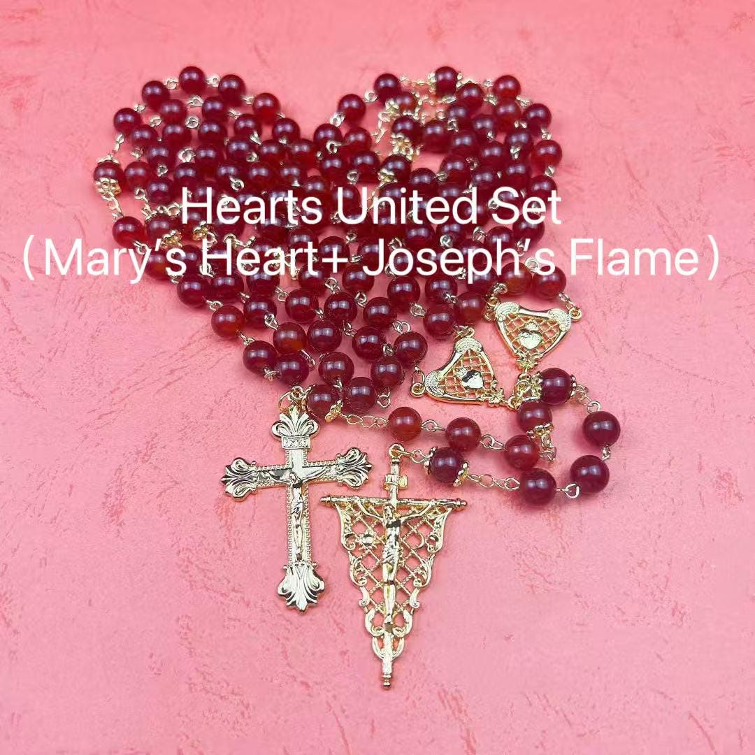 8mm Natural Red Agate Rosary Set with Mary’s Heart and Joseph’s Flame, Christmas Gift for Couples (Add Pouch – see description)