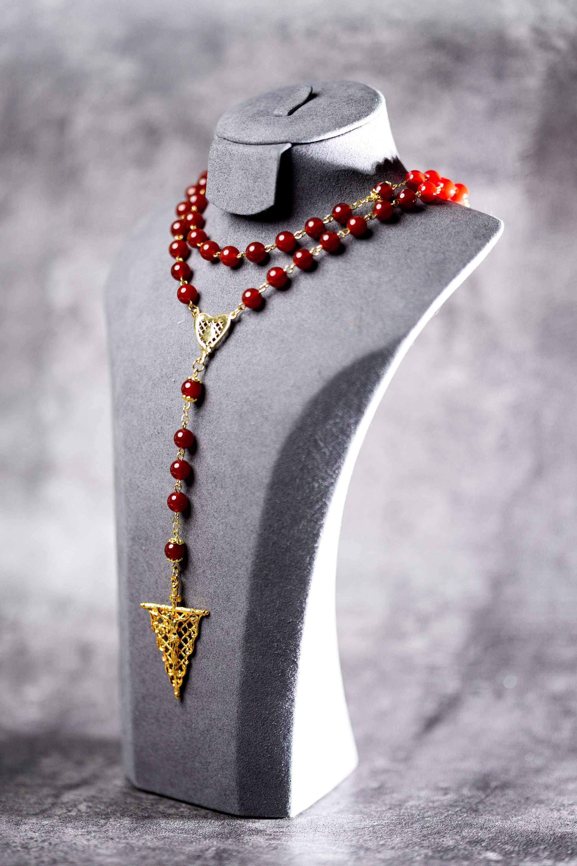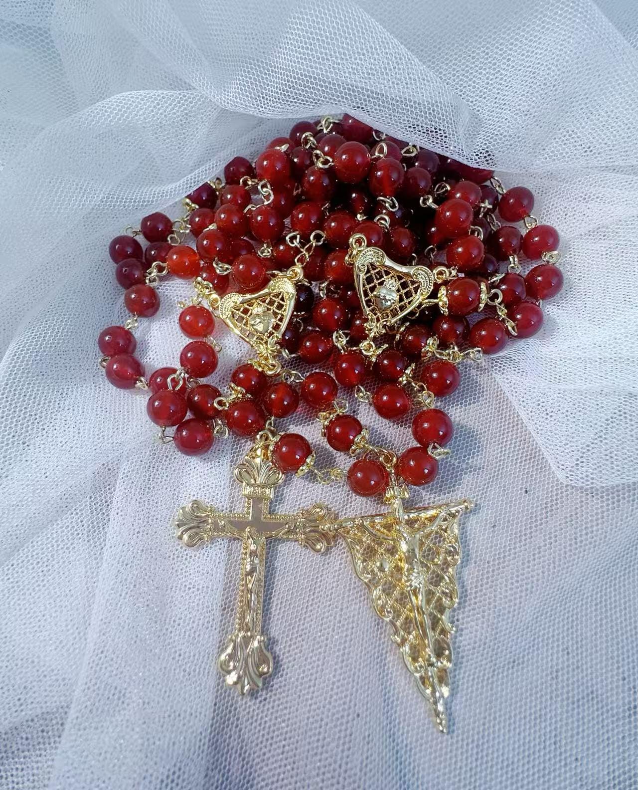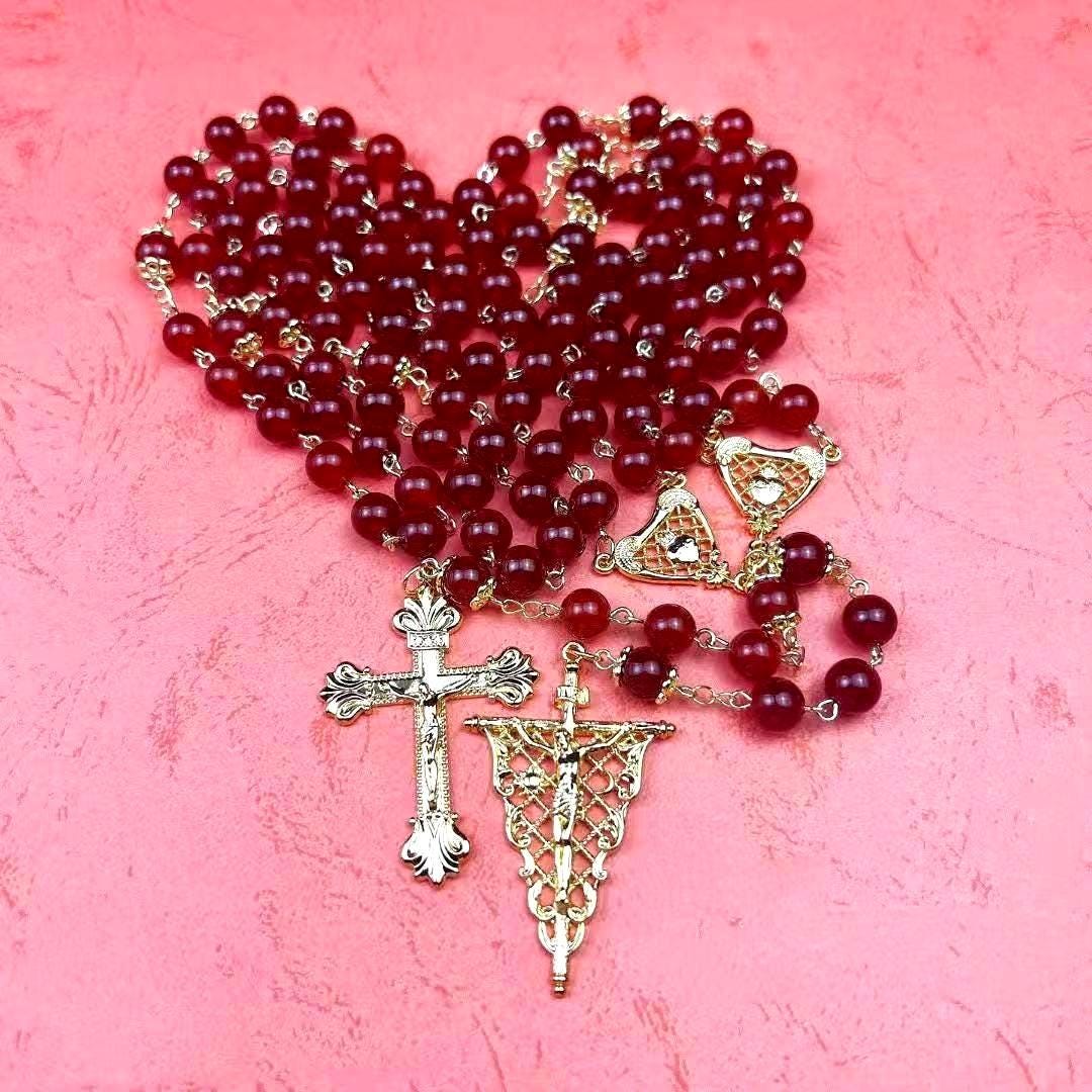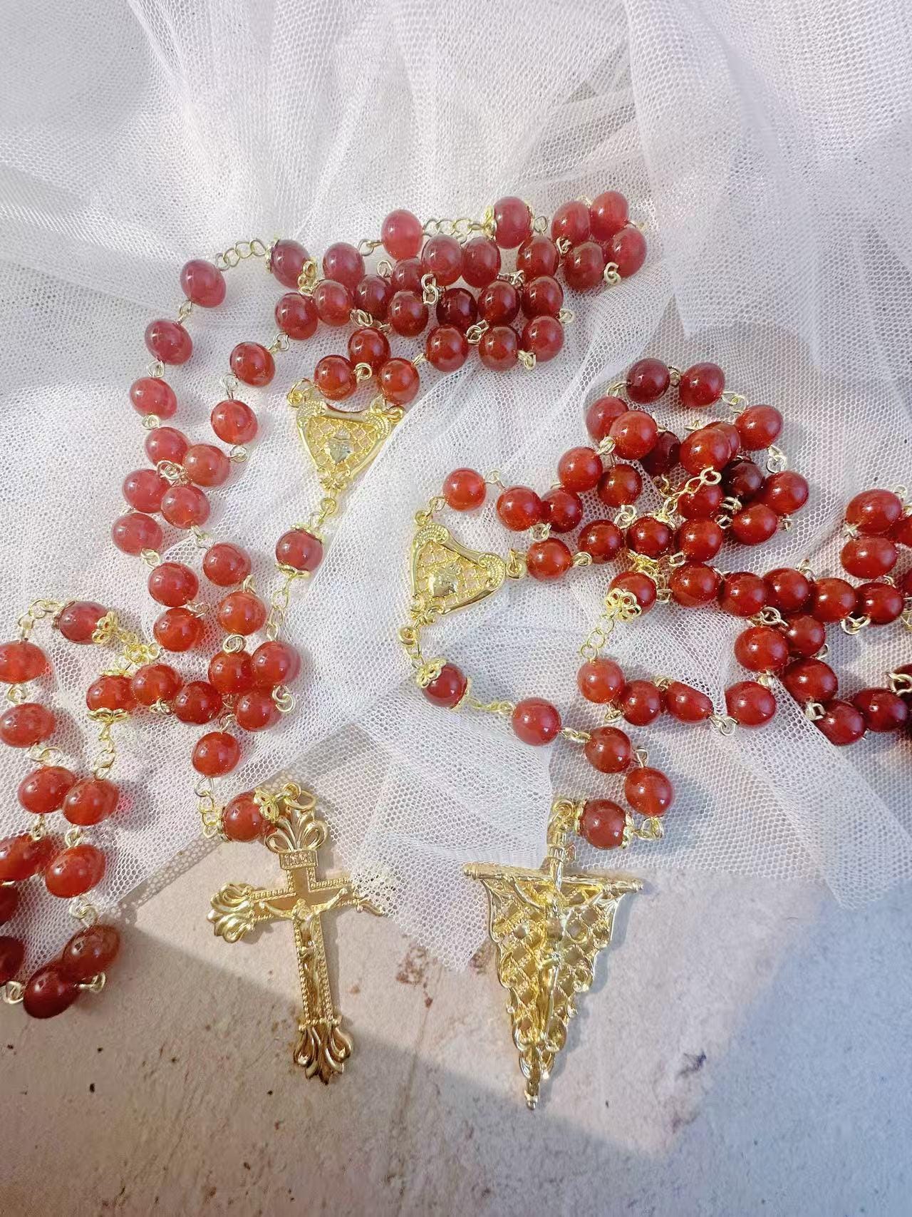 8mm Natural Red Agate Rosary Set with Mary’s Heart and Joseph’s Flame, Christmas Gift for Couples (Add Pouch – see description)