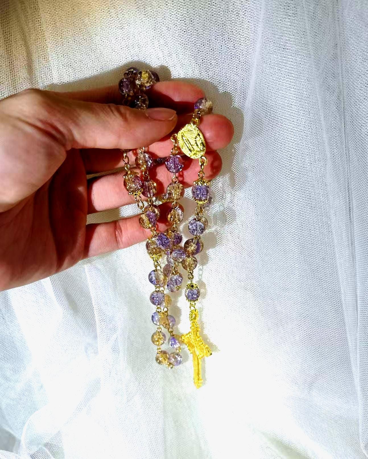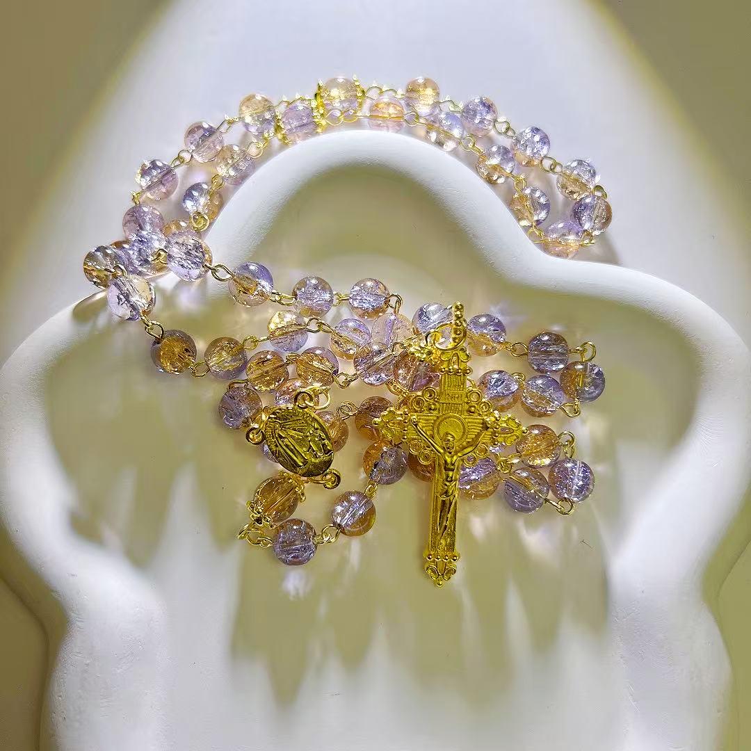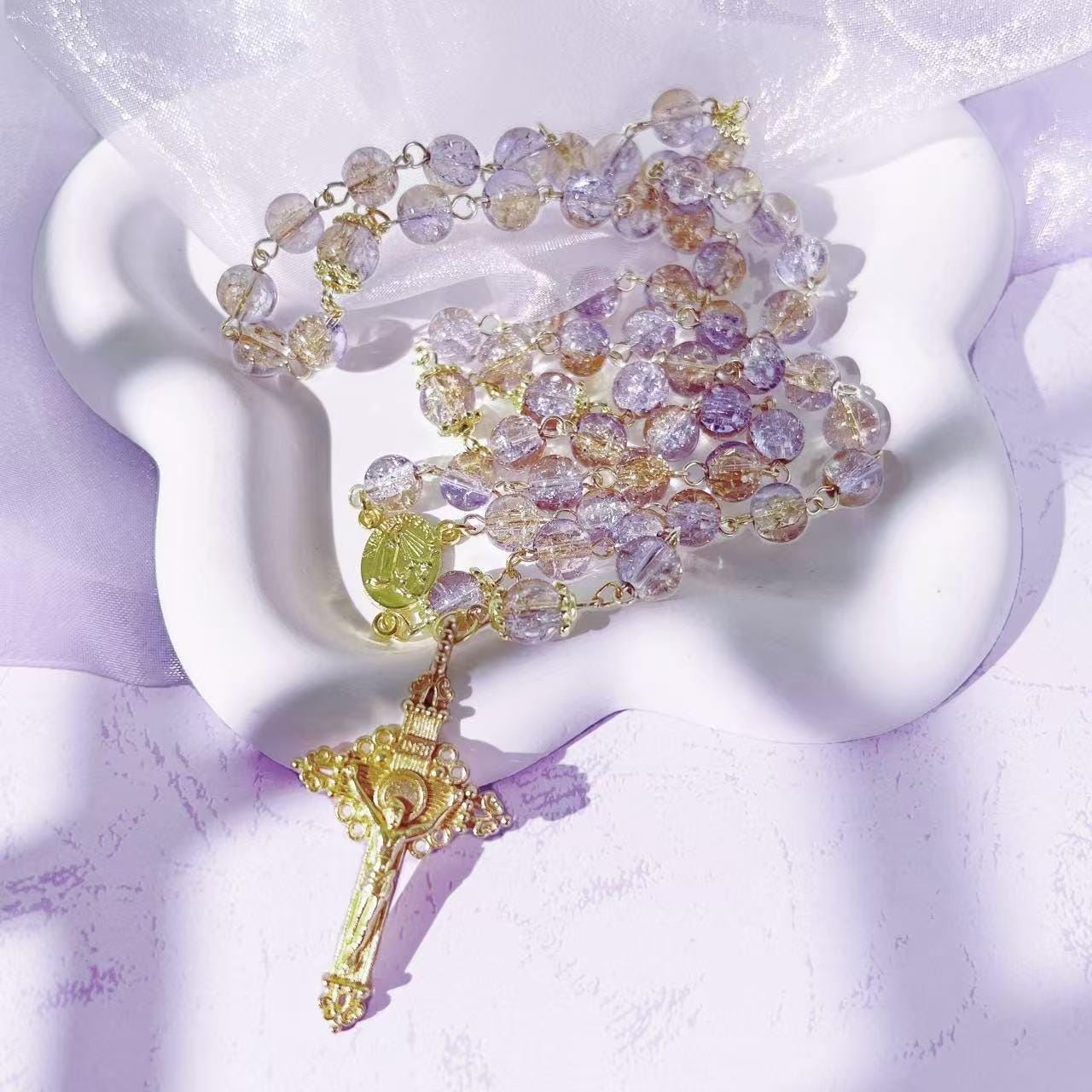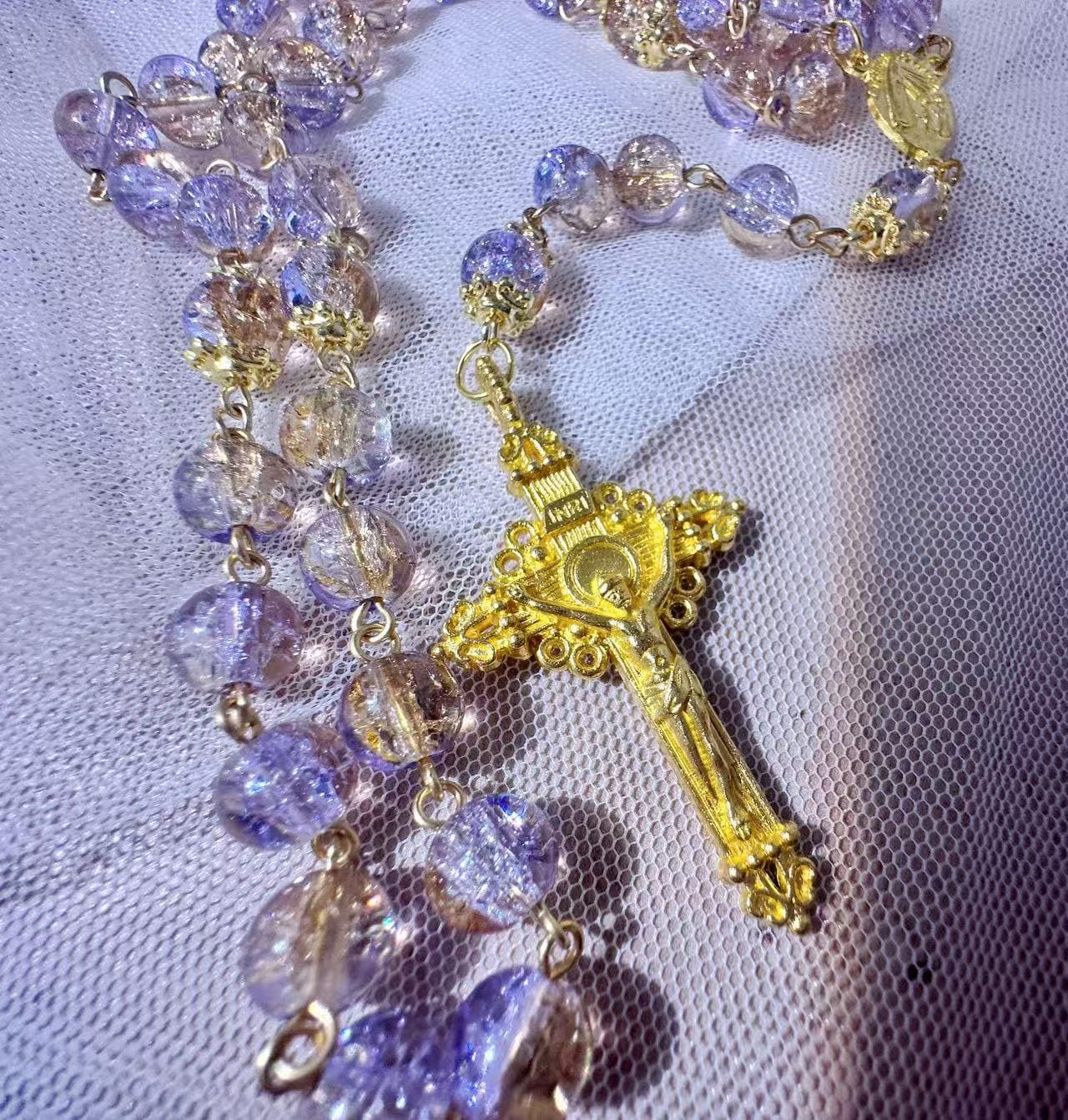 •This rosary features 8 mm pink-to-purple ombre crackle glass beads, shimmering softly like frosted petals in candlelight.