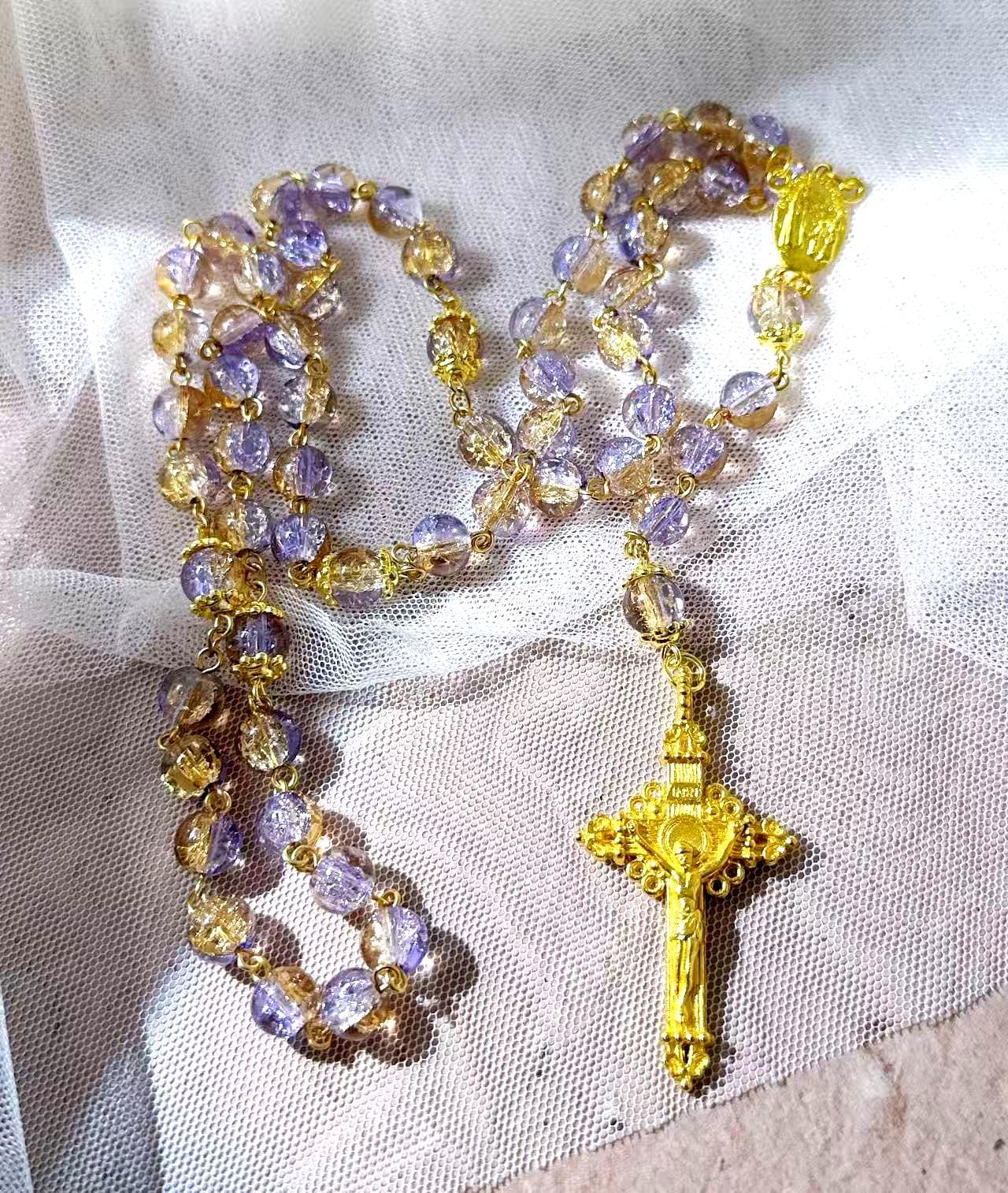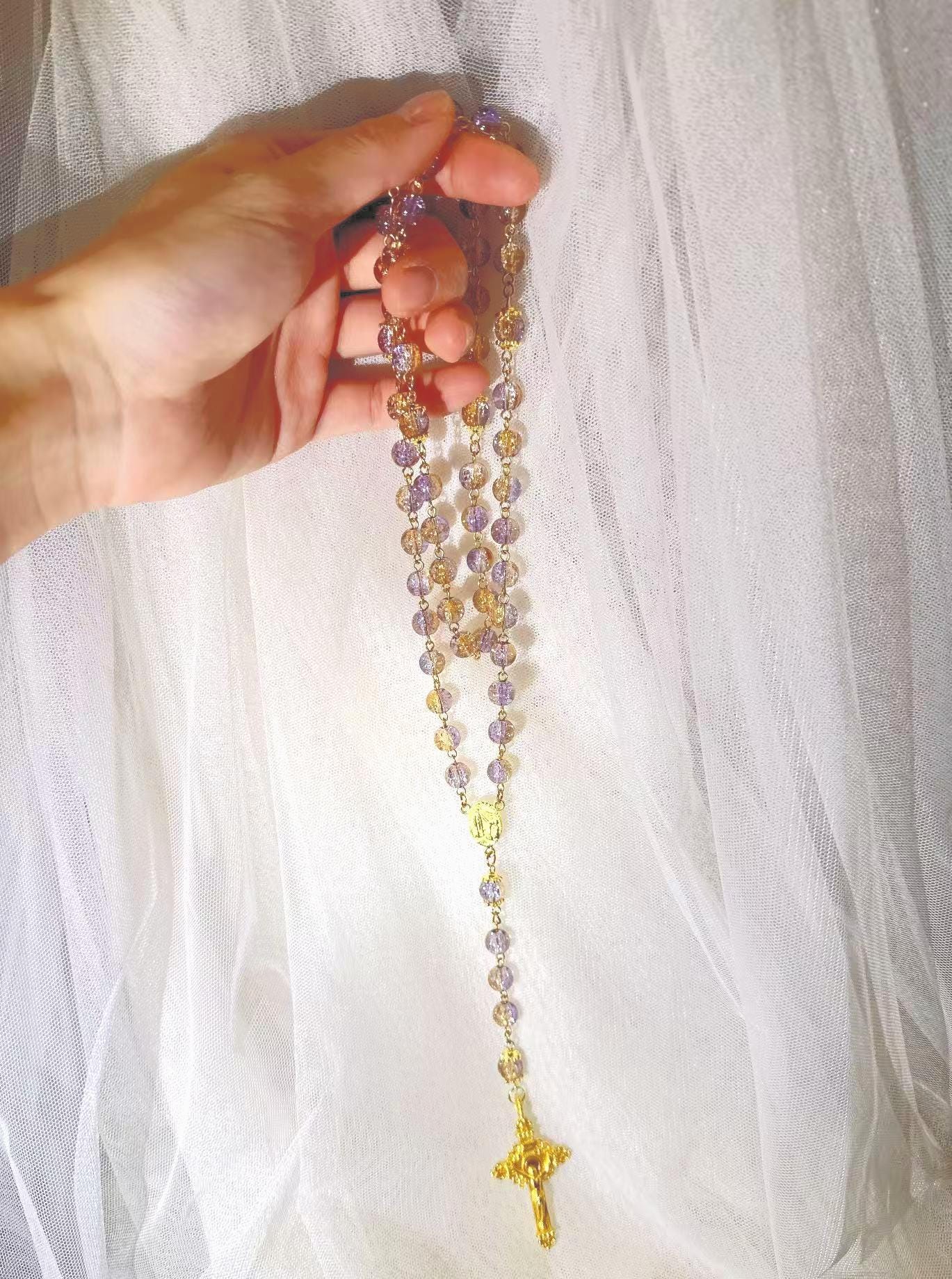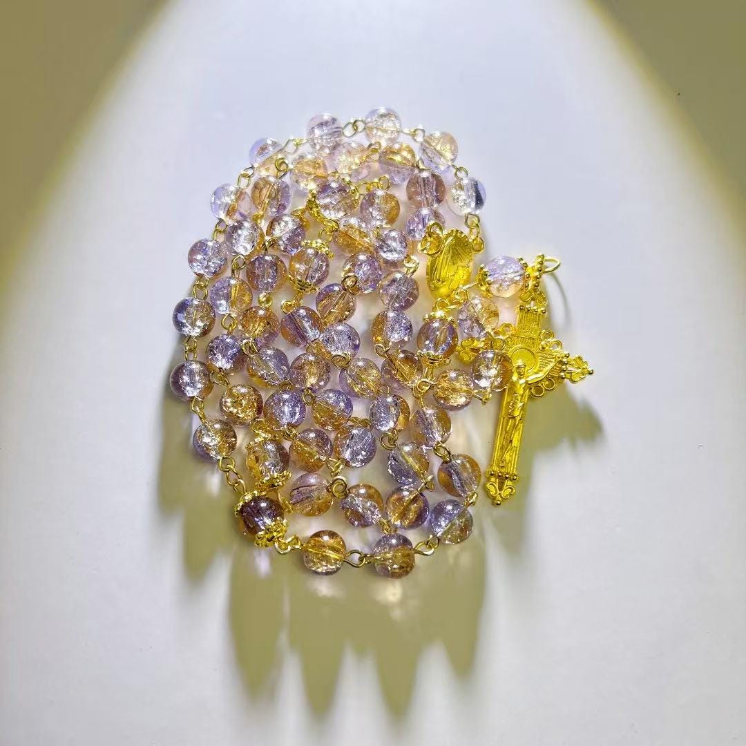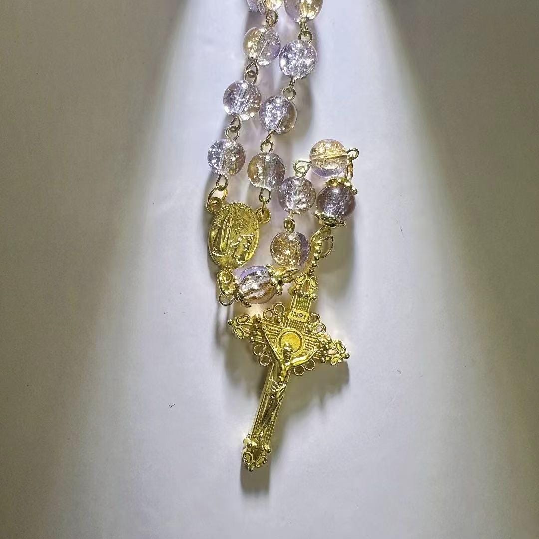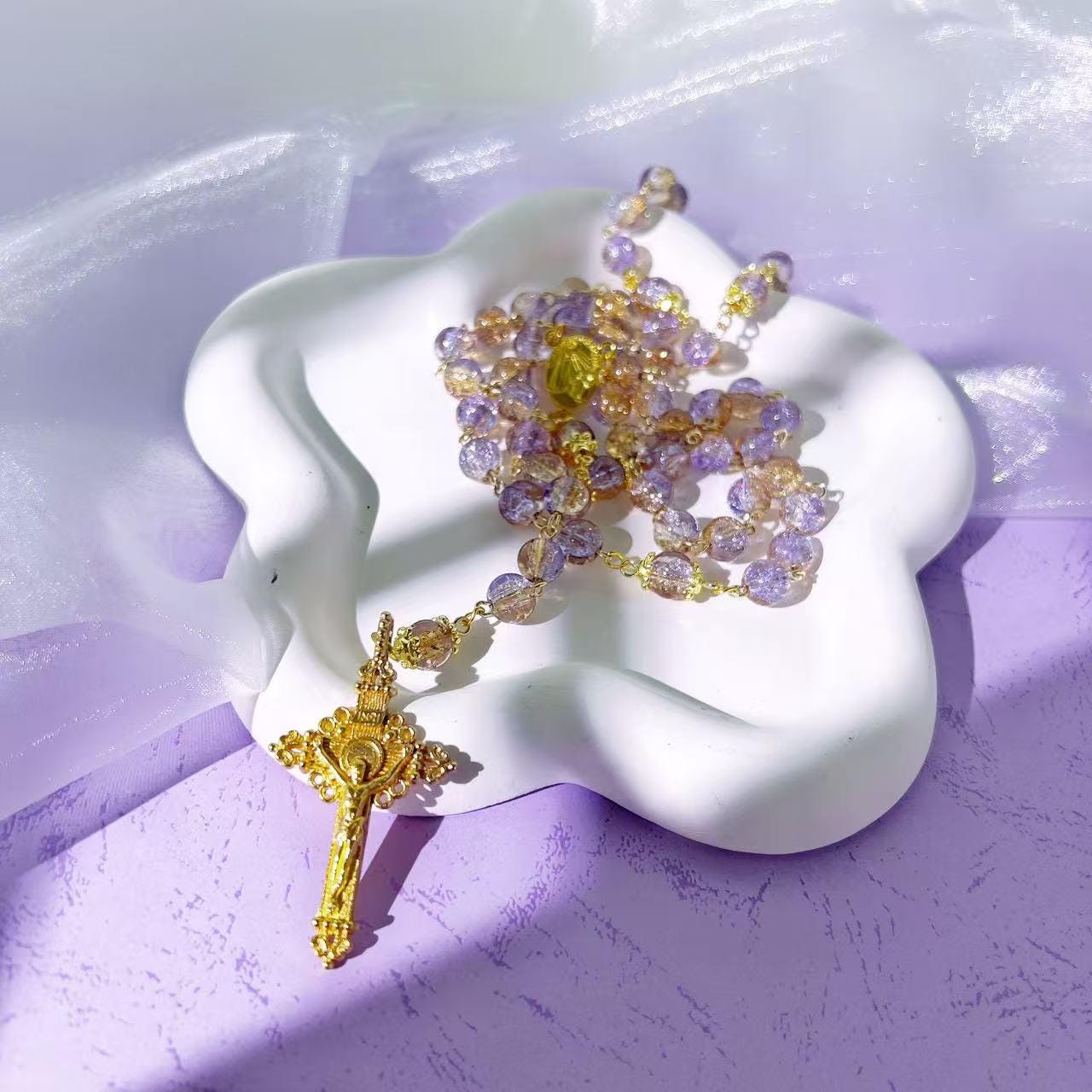 •This rosary features 8 mm pink-to-purple ombre crackle glass beads, shimmering softly like frosted petals in candlelight.