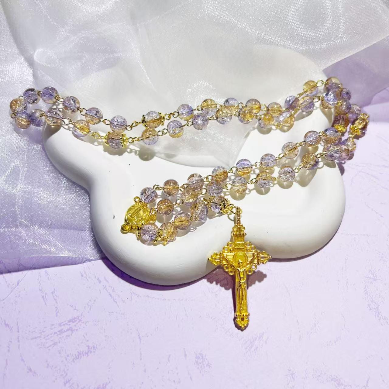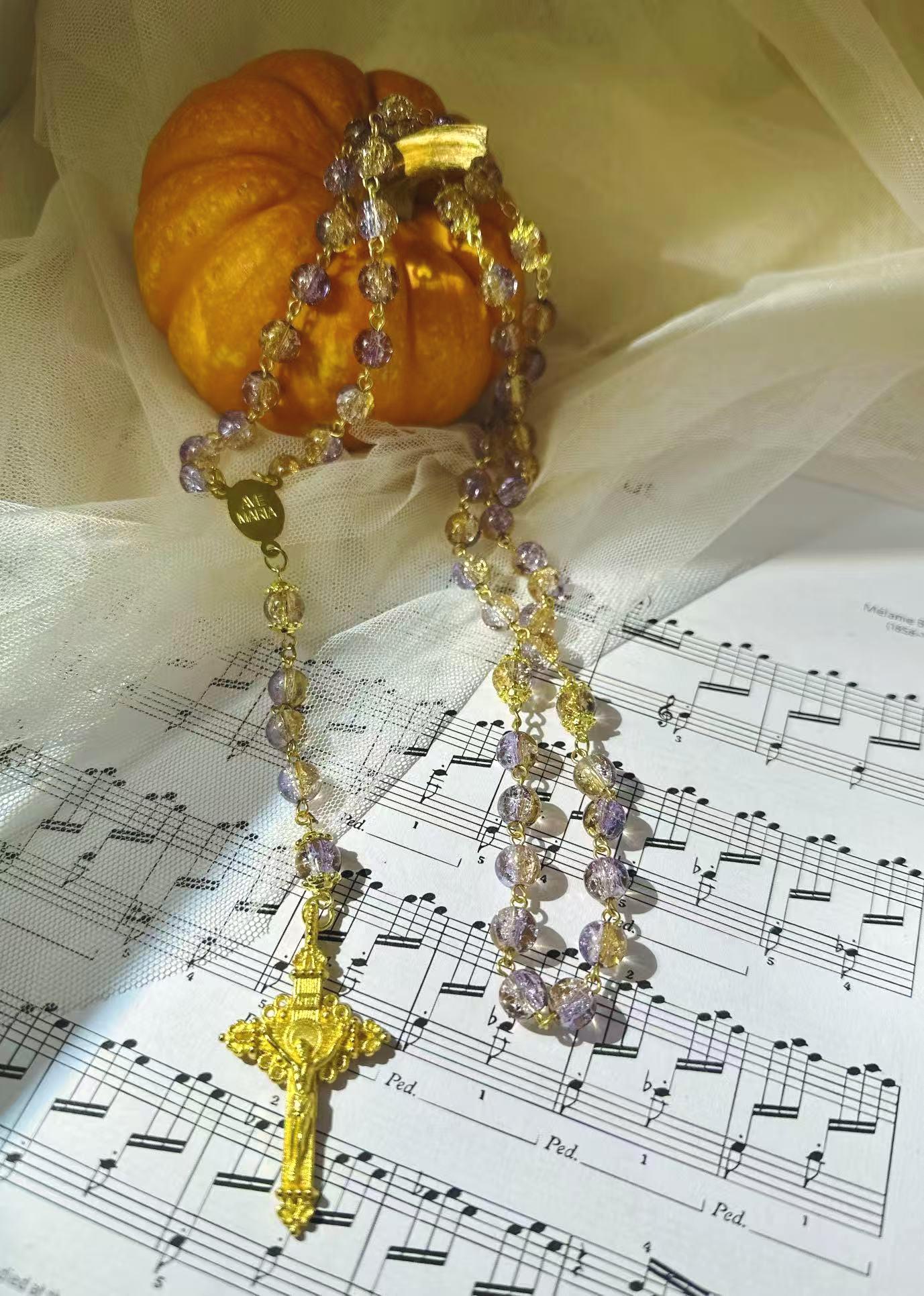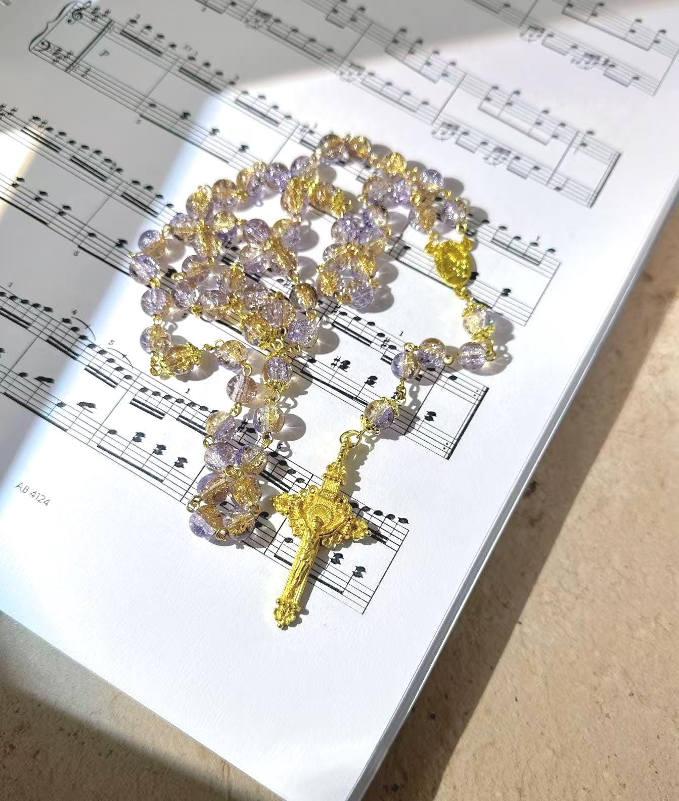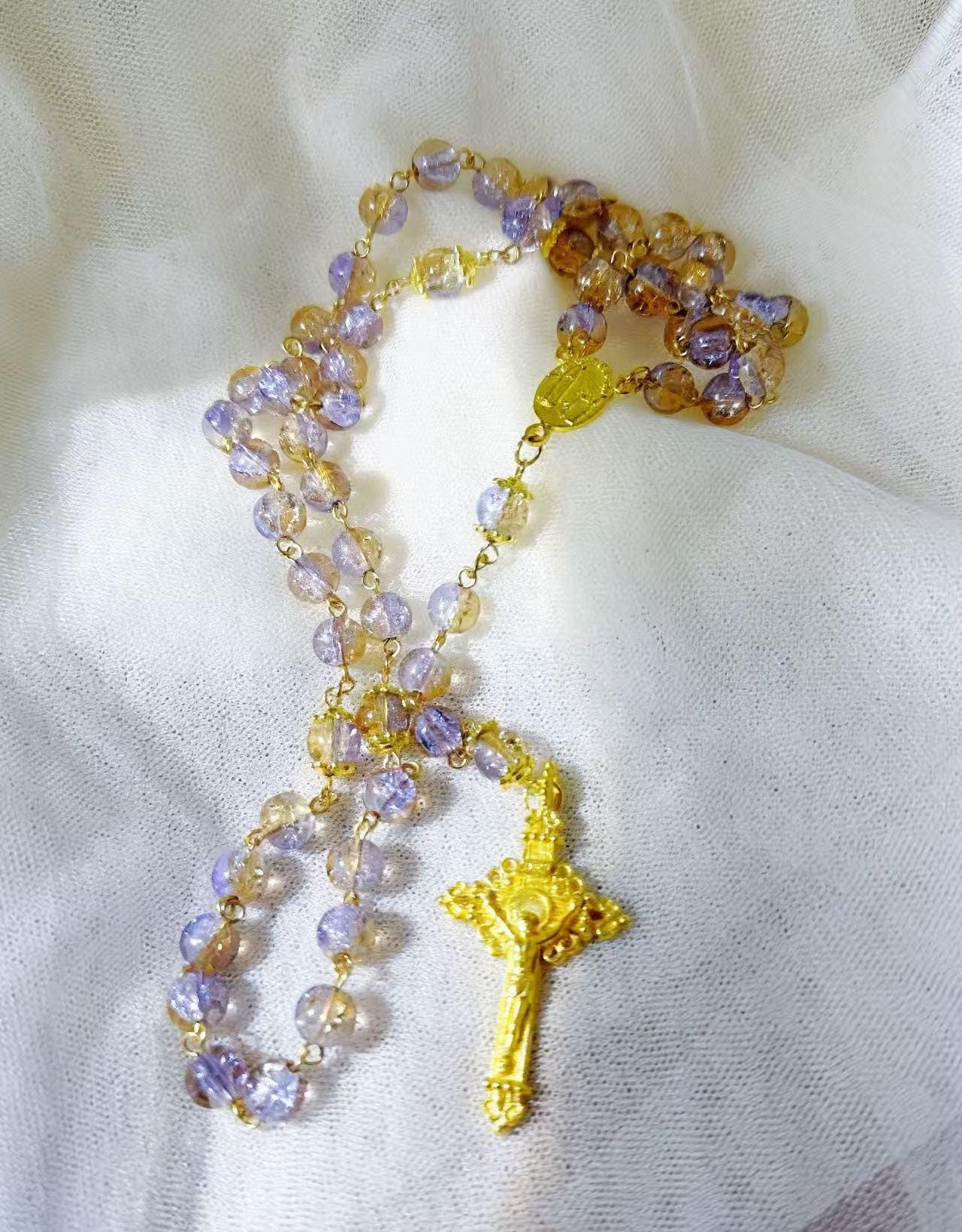 •This rosary features 8 mm pink-to-purple ombre crackle glass beads, shimmering softly like frosted petals in candlelight.