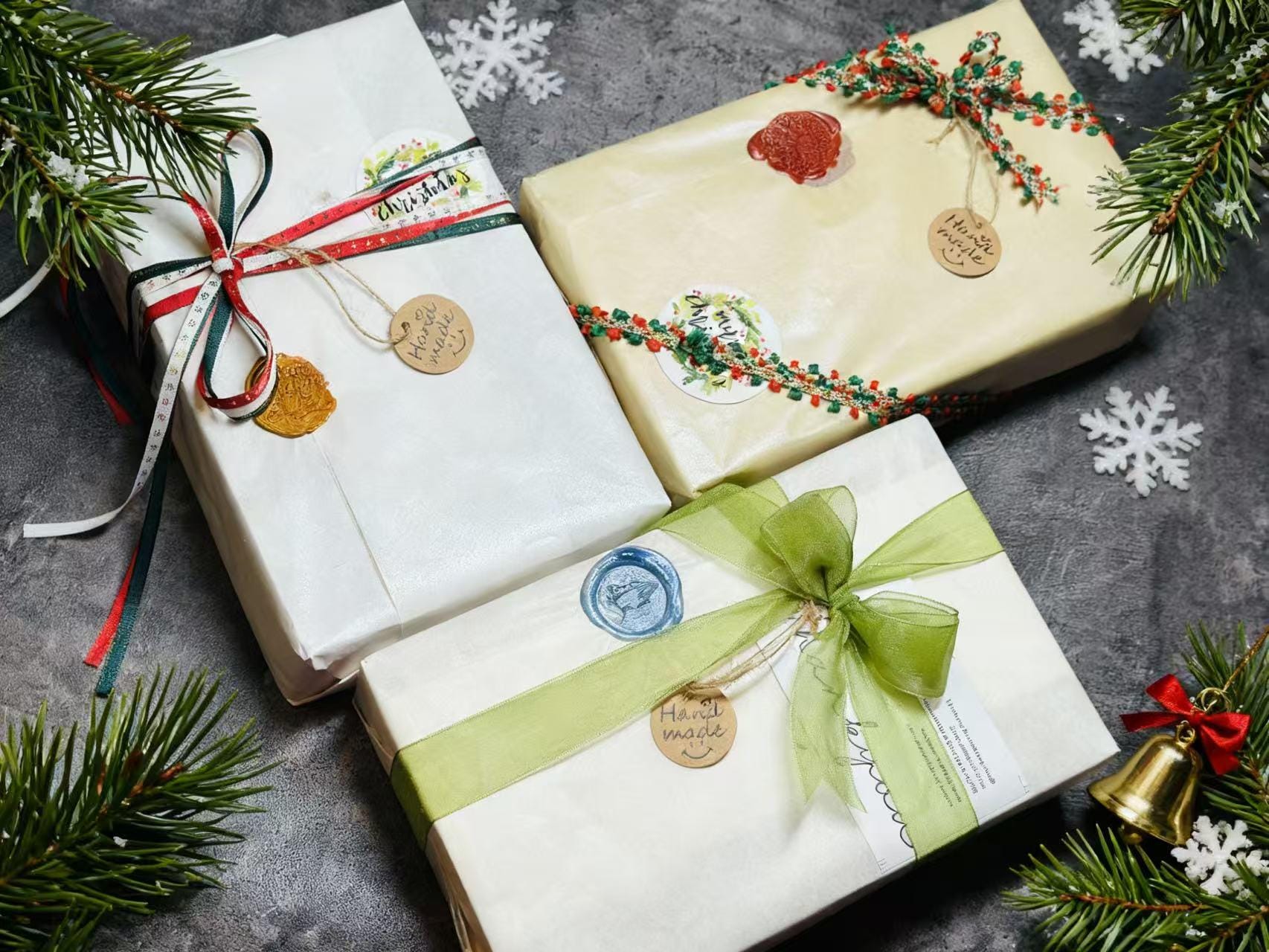 Free Christmas tissue (5 patterns) and complimentary wax seals — Praying Hands, Sacred Heart, Christmas Blessings, or Reindeer — in red, gold, or blue.