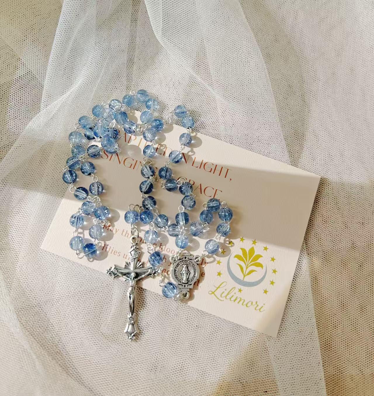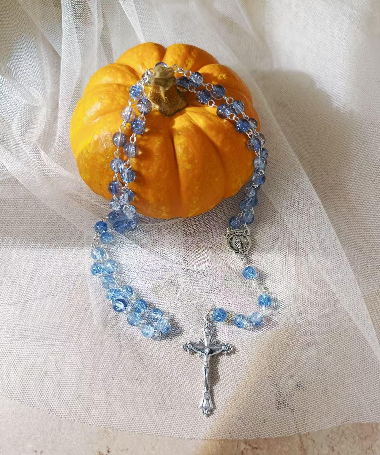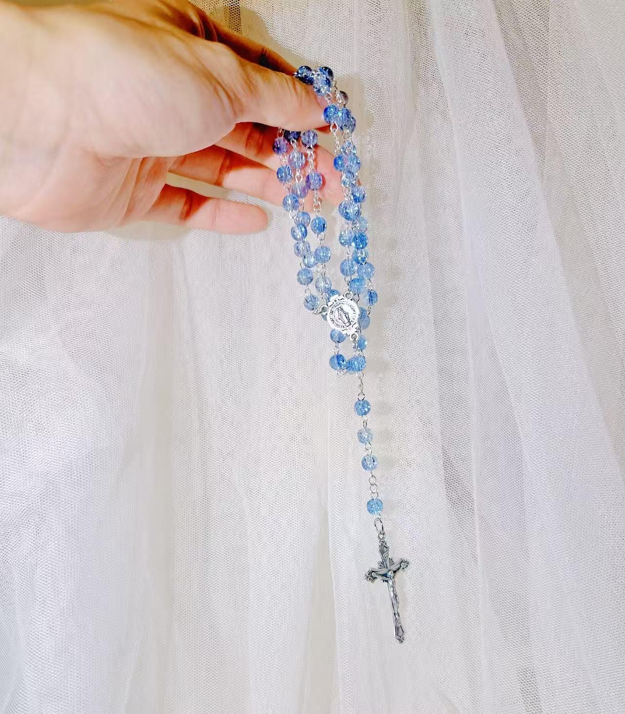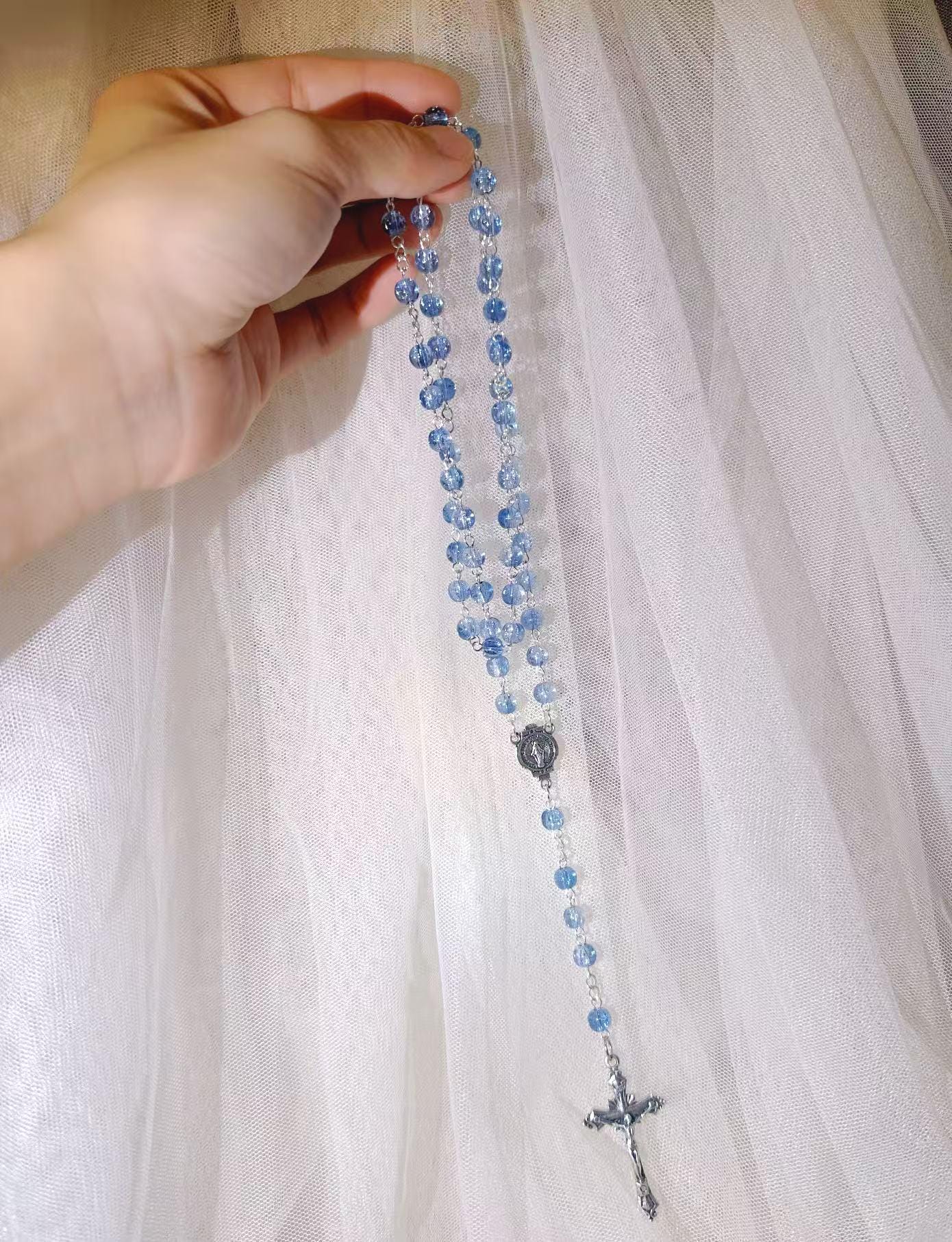 6mm Blue Crackle Glass Rosary Necklace with Marian Medal and Italian Crucifix, Christmas Catholic Gift (Add Pouch – see description)