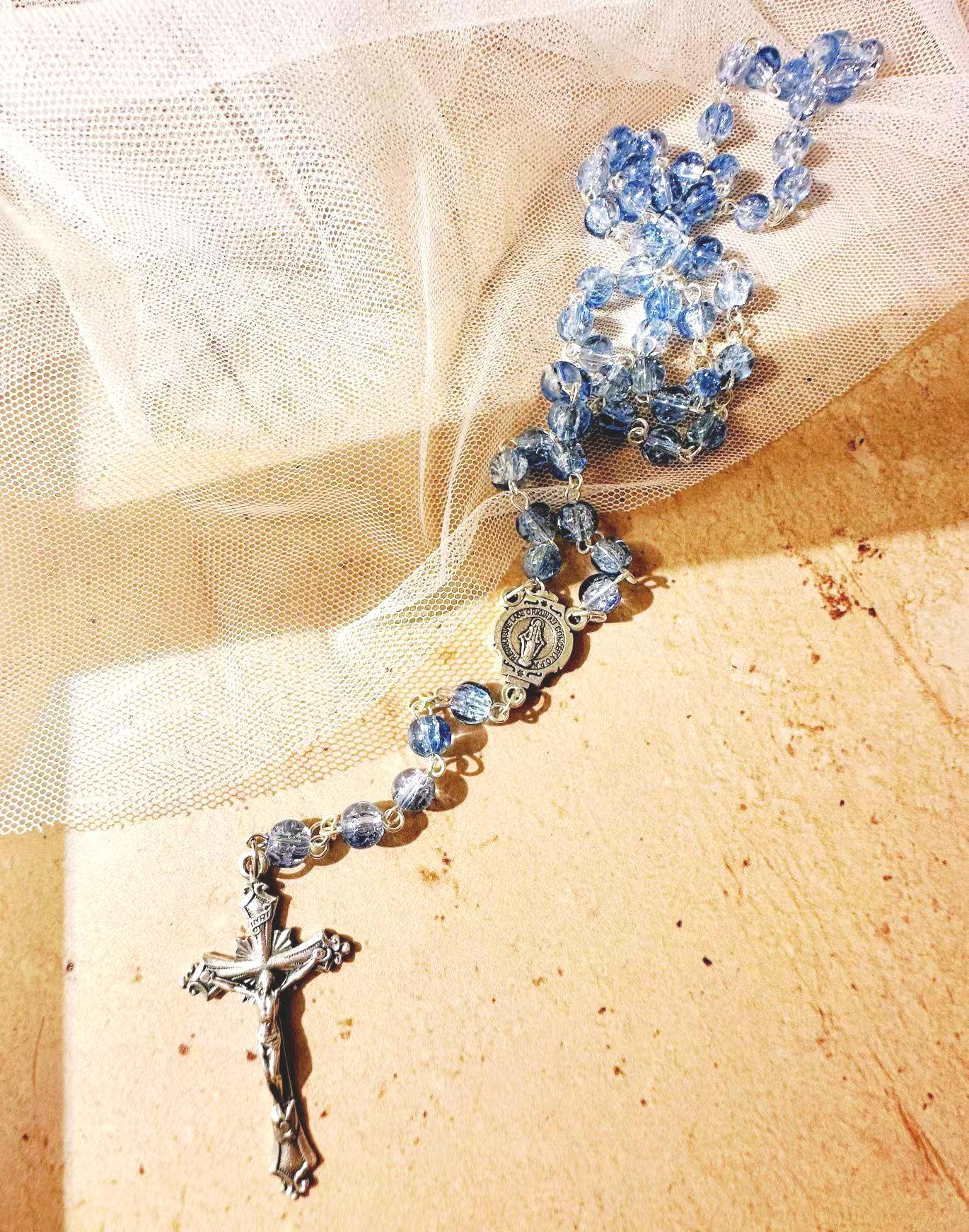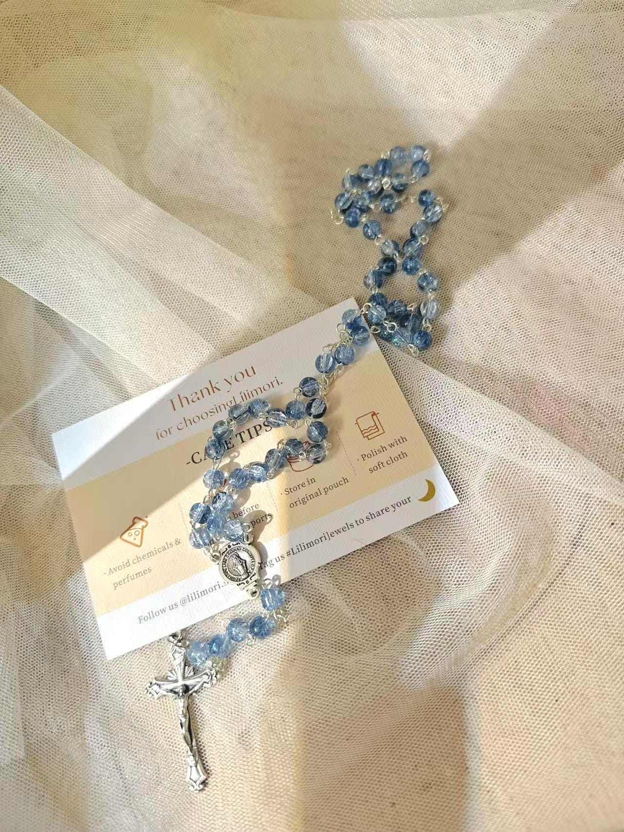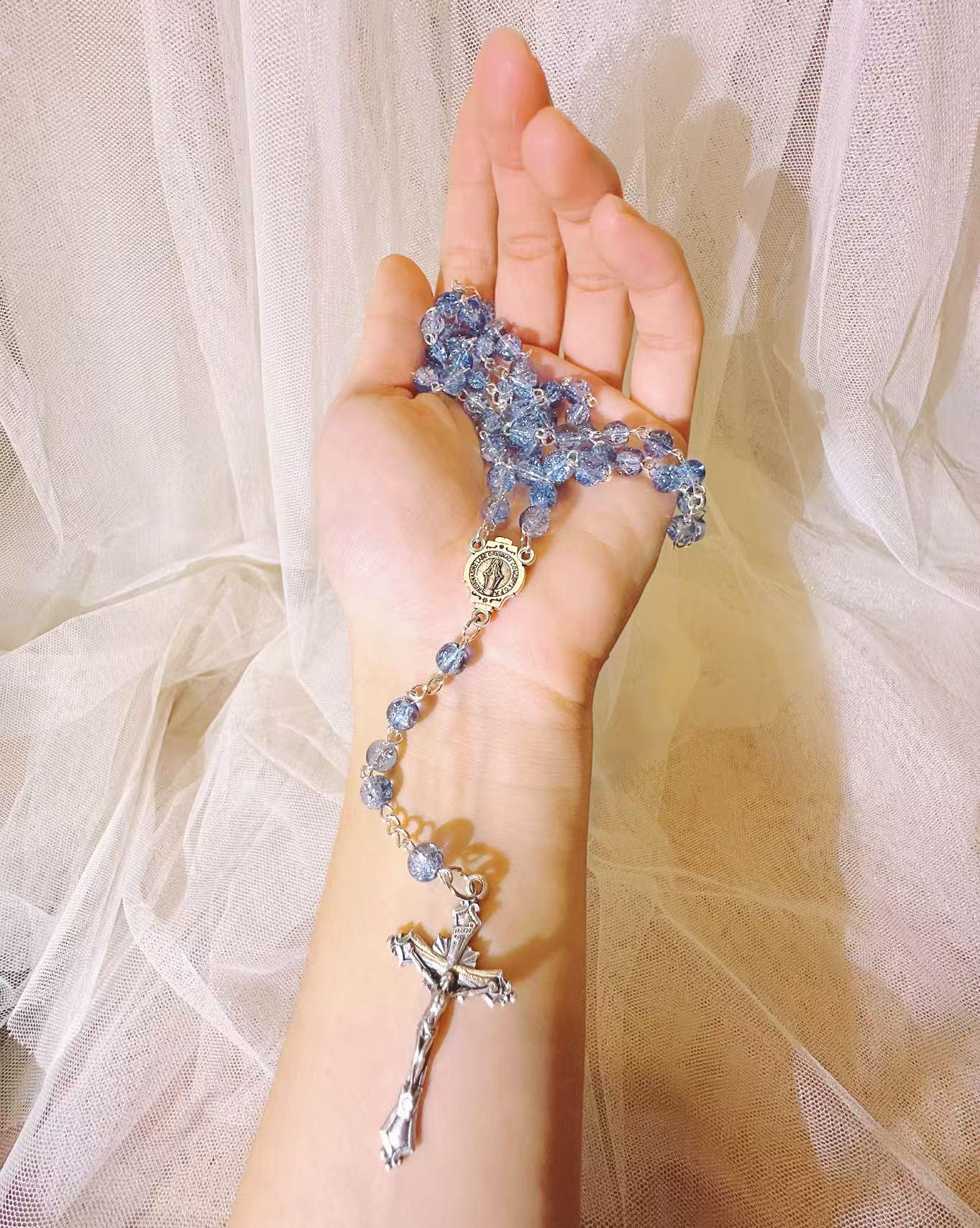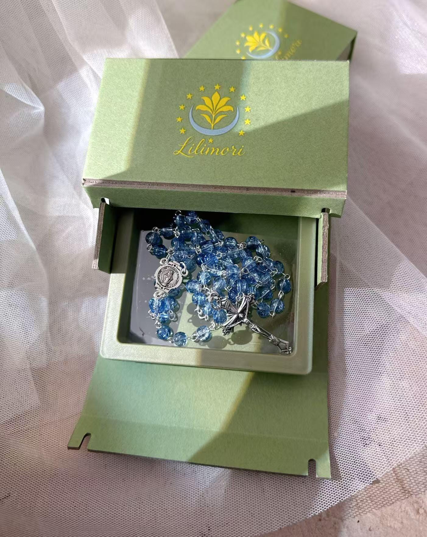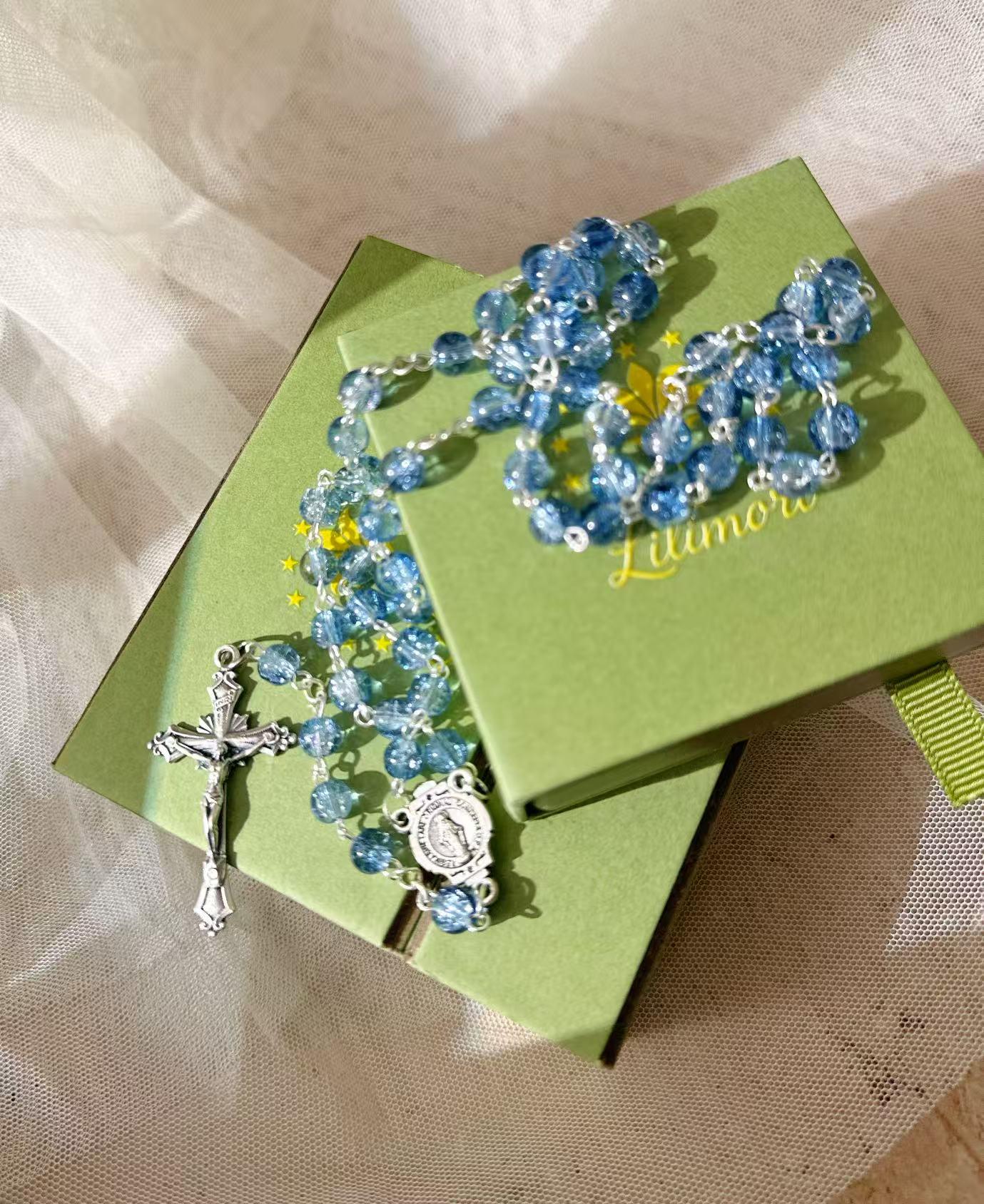 6mm Blue Crackle Glass Rosary Necklace with Marian Medal and Italian Crucifix, Christmas Catholic Gift (Add Pouch – see description)