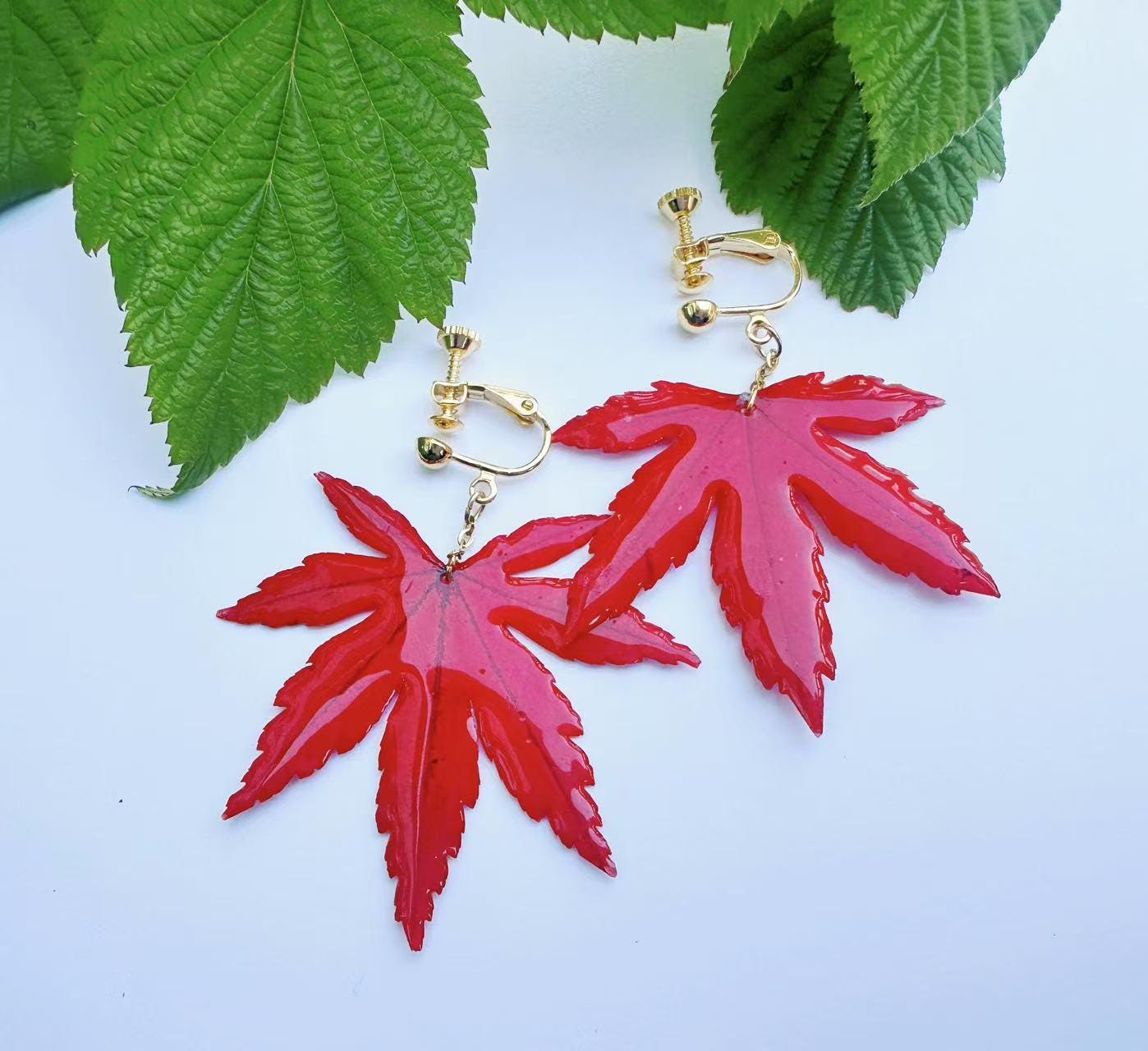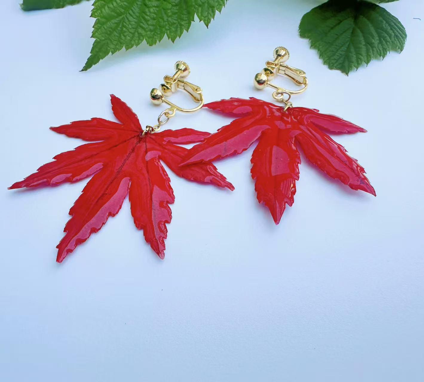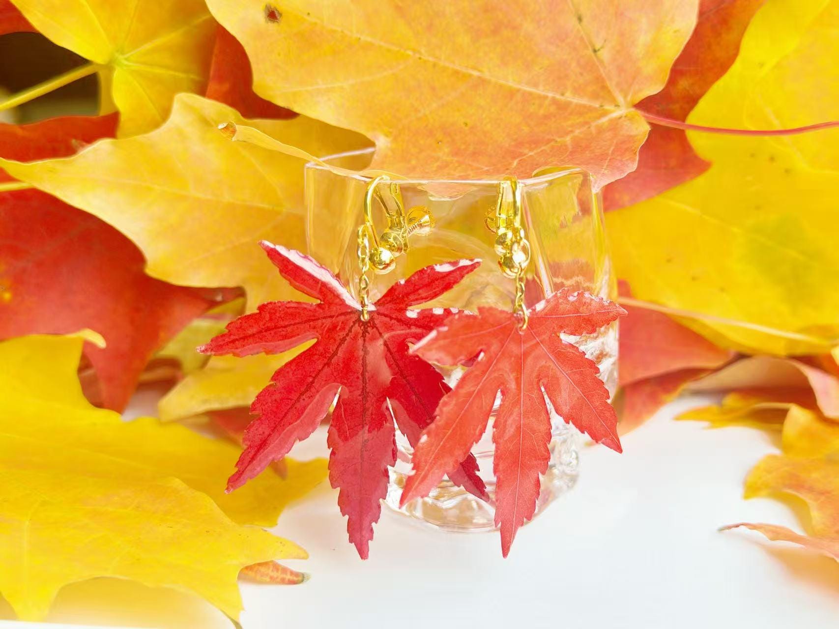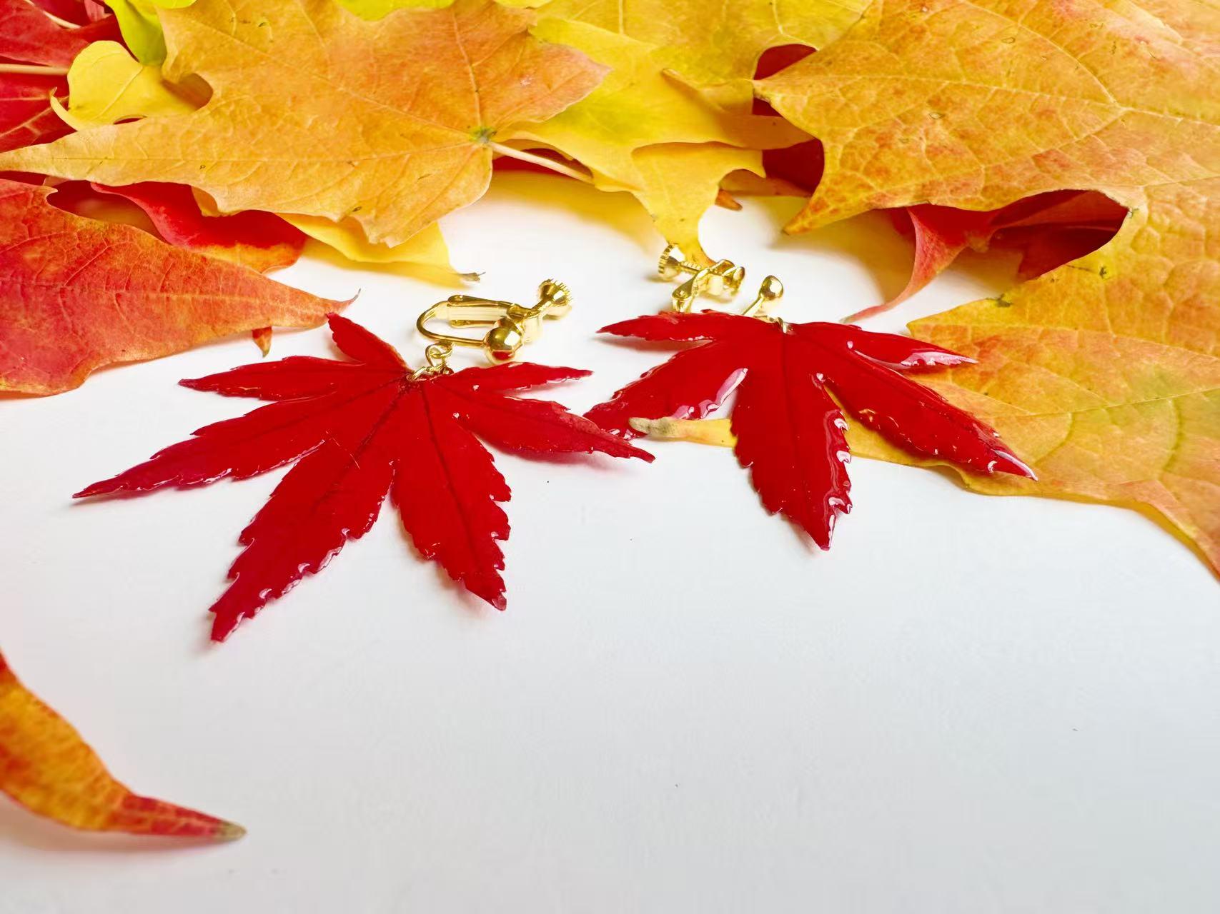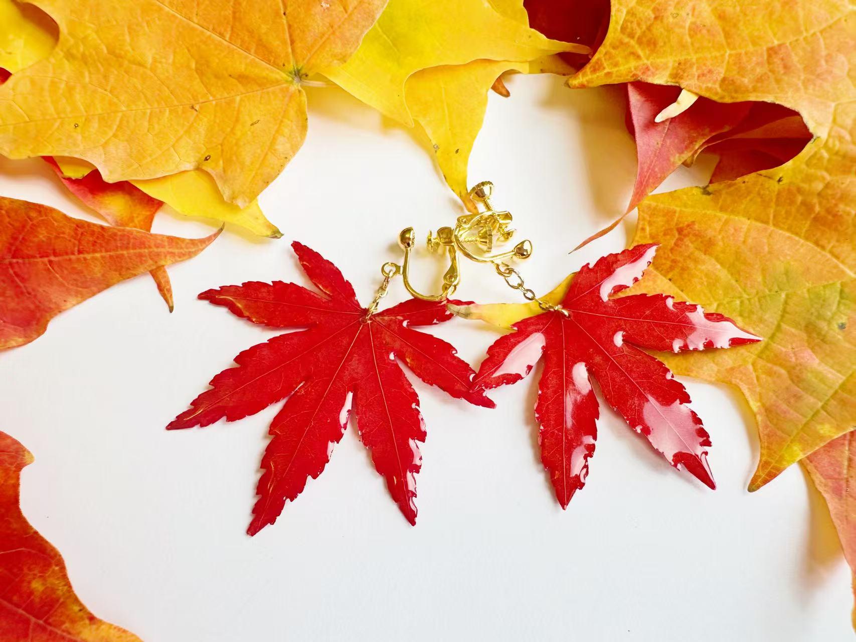 A real piece of autumn—each earring features an authentic Japanese maple leaf preserved in clear resin to capture its natural veins and shape. Despite its glossy finish, it remains a true leaf, so please handle gently.