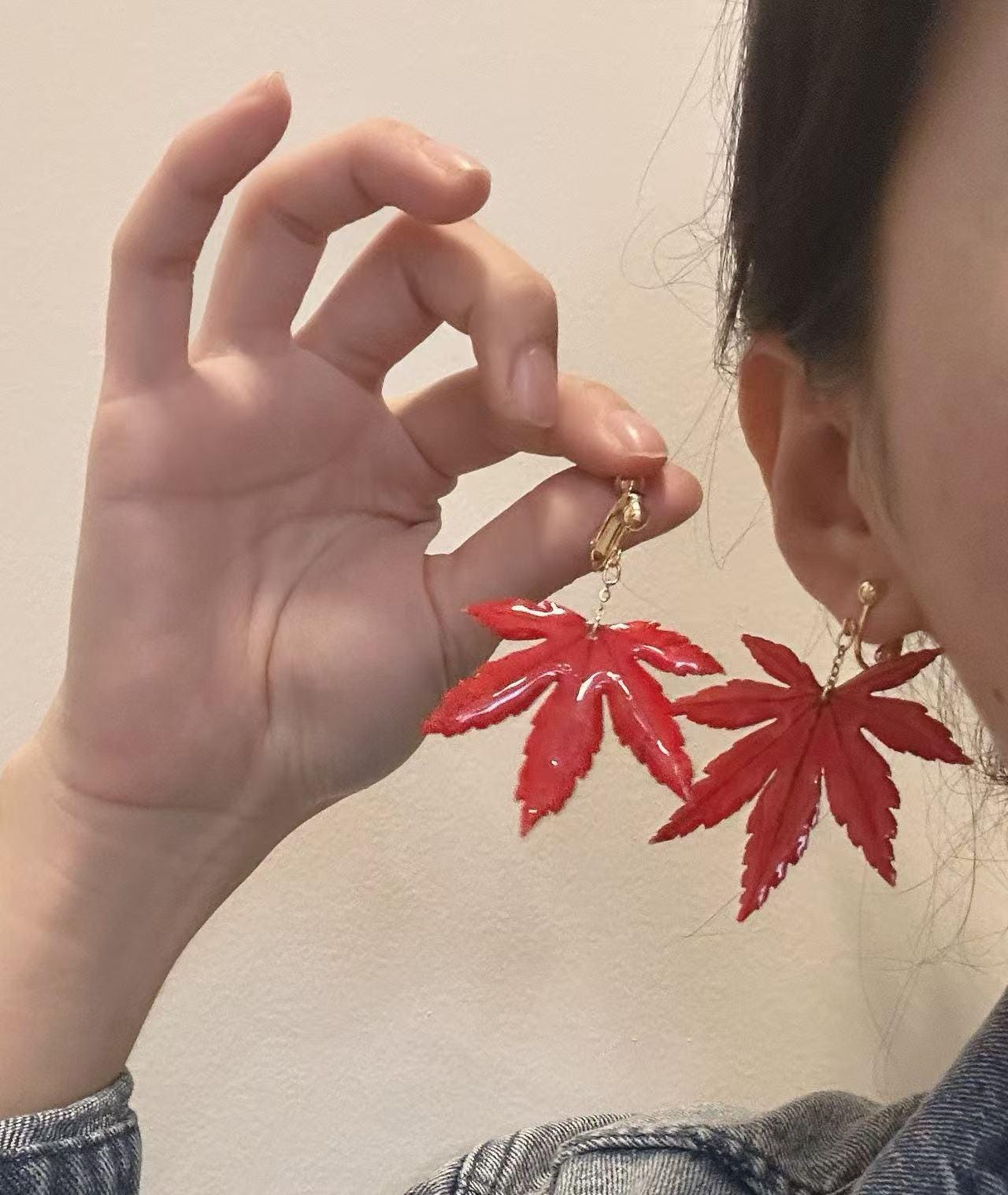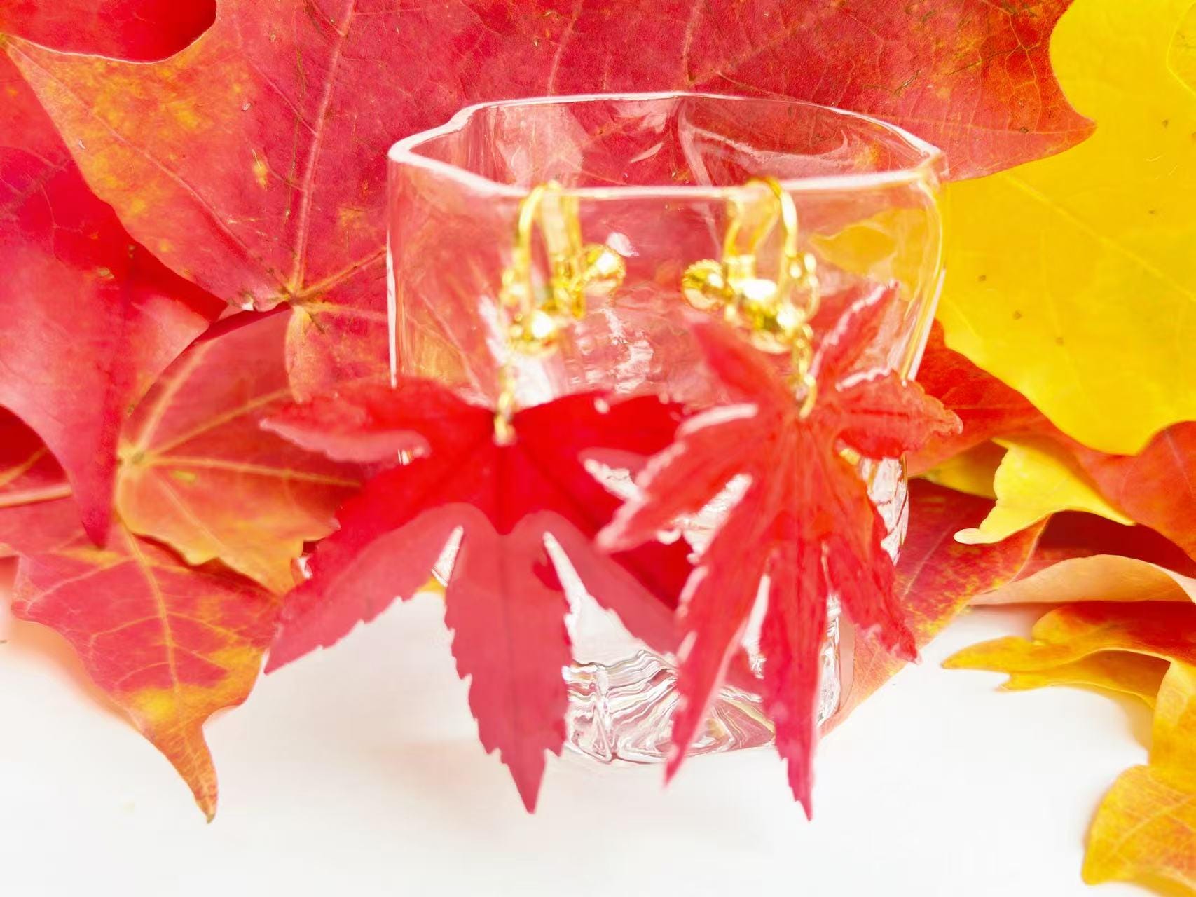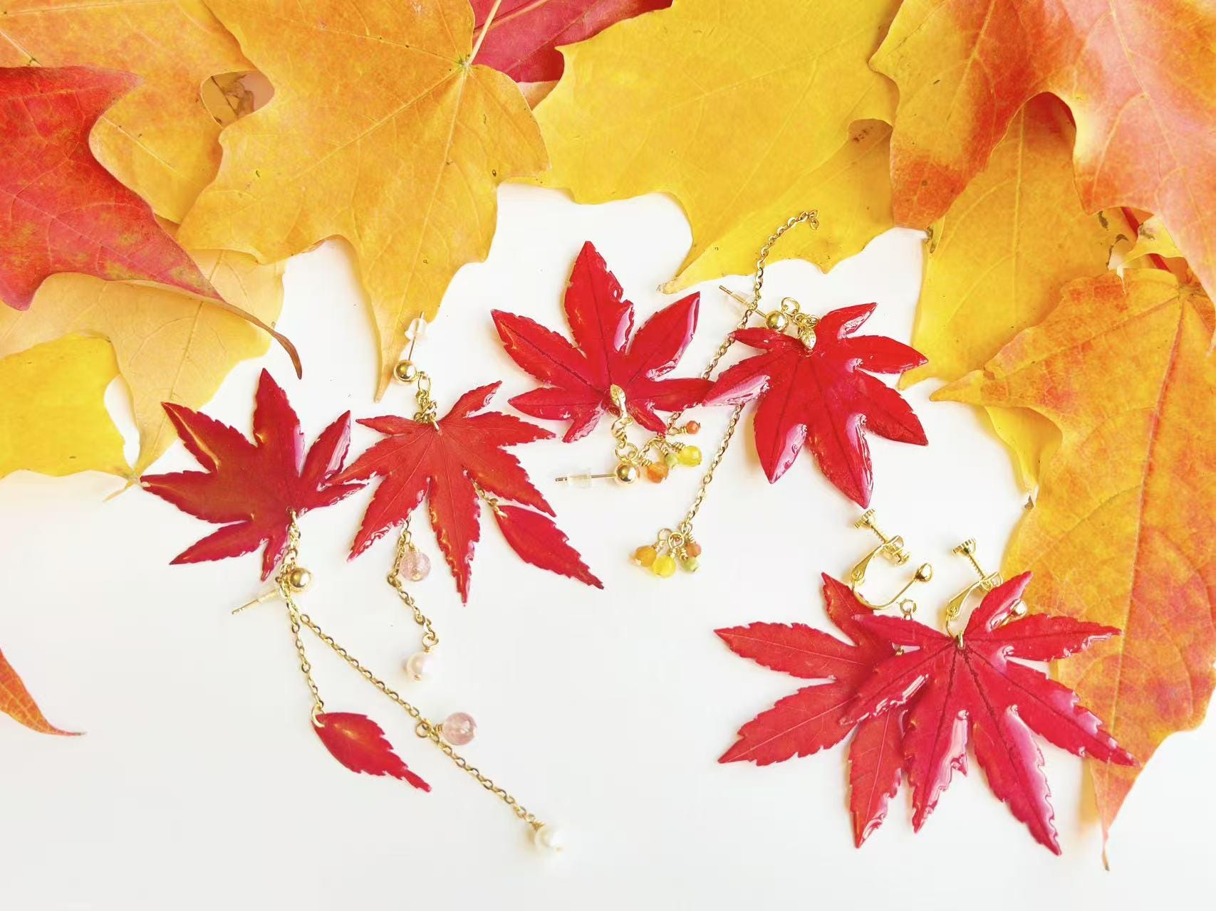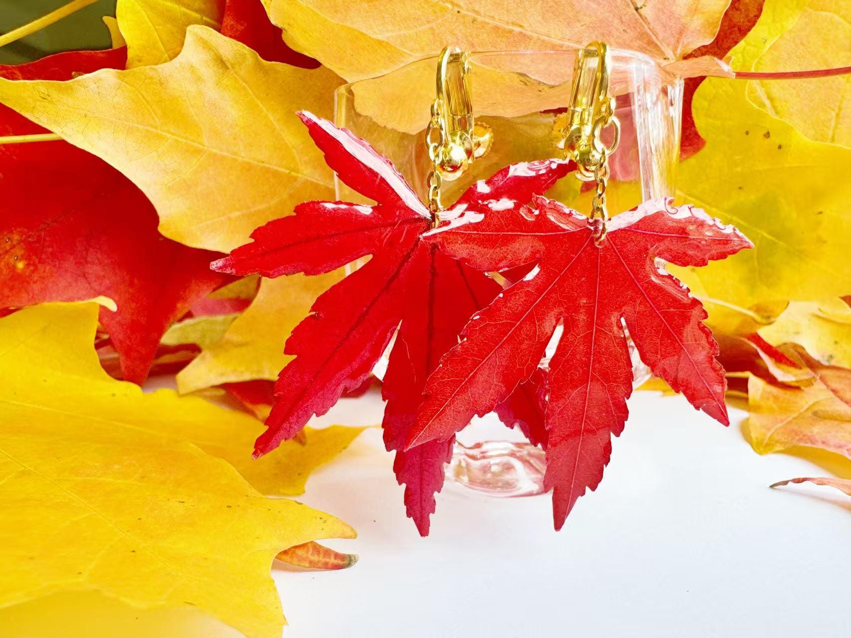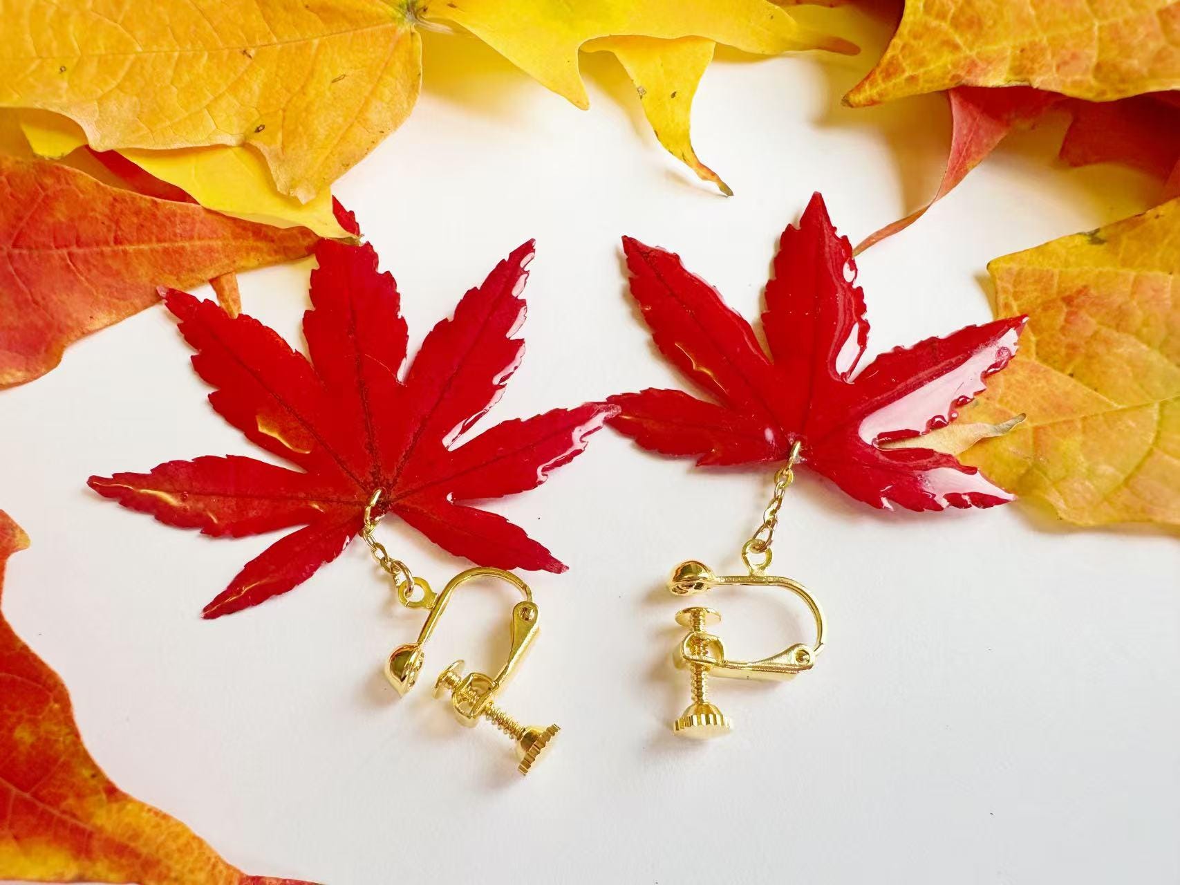 A real piece of autumn—each earring features an authentic Japanese maple leaf preserved in clear resin to capture its natural veins and shape. Despite its glossy finish, it remains a true leaf, so please handle gently.