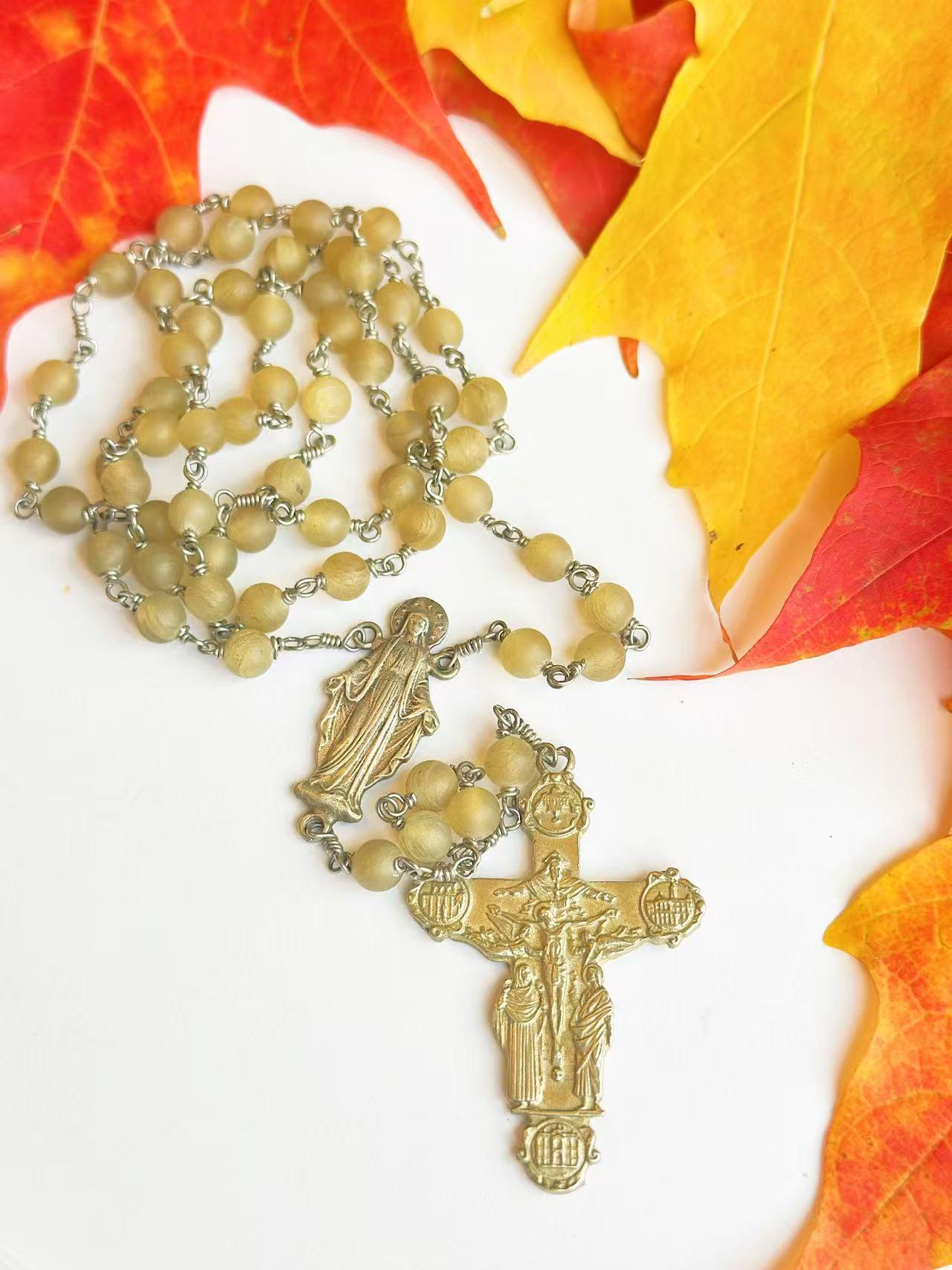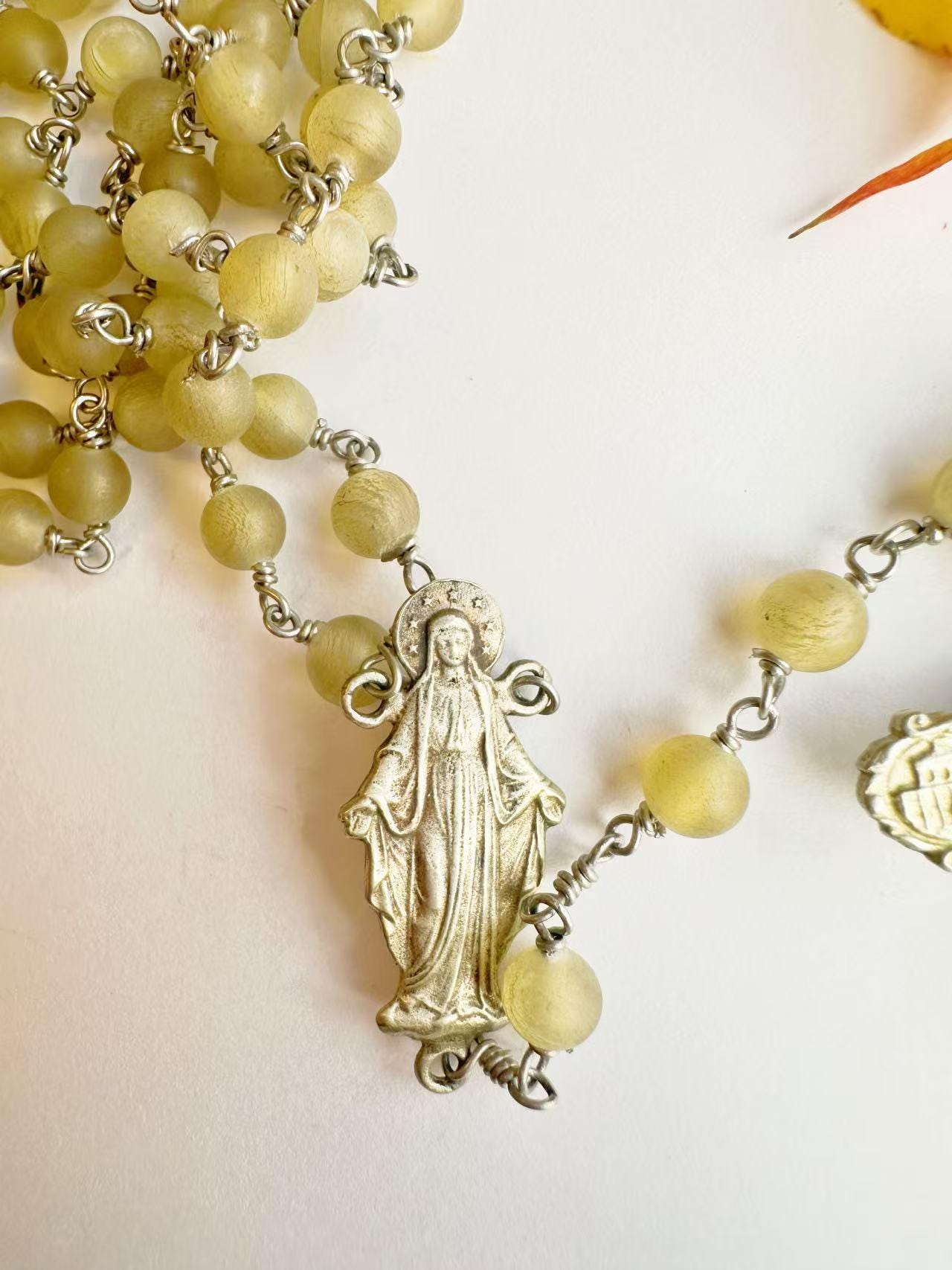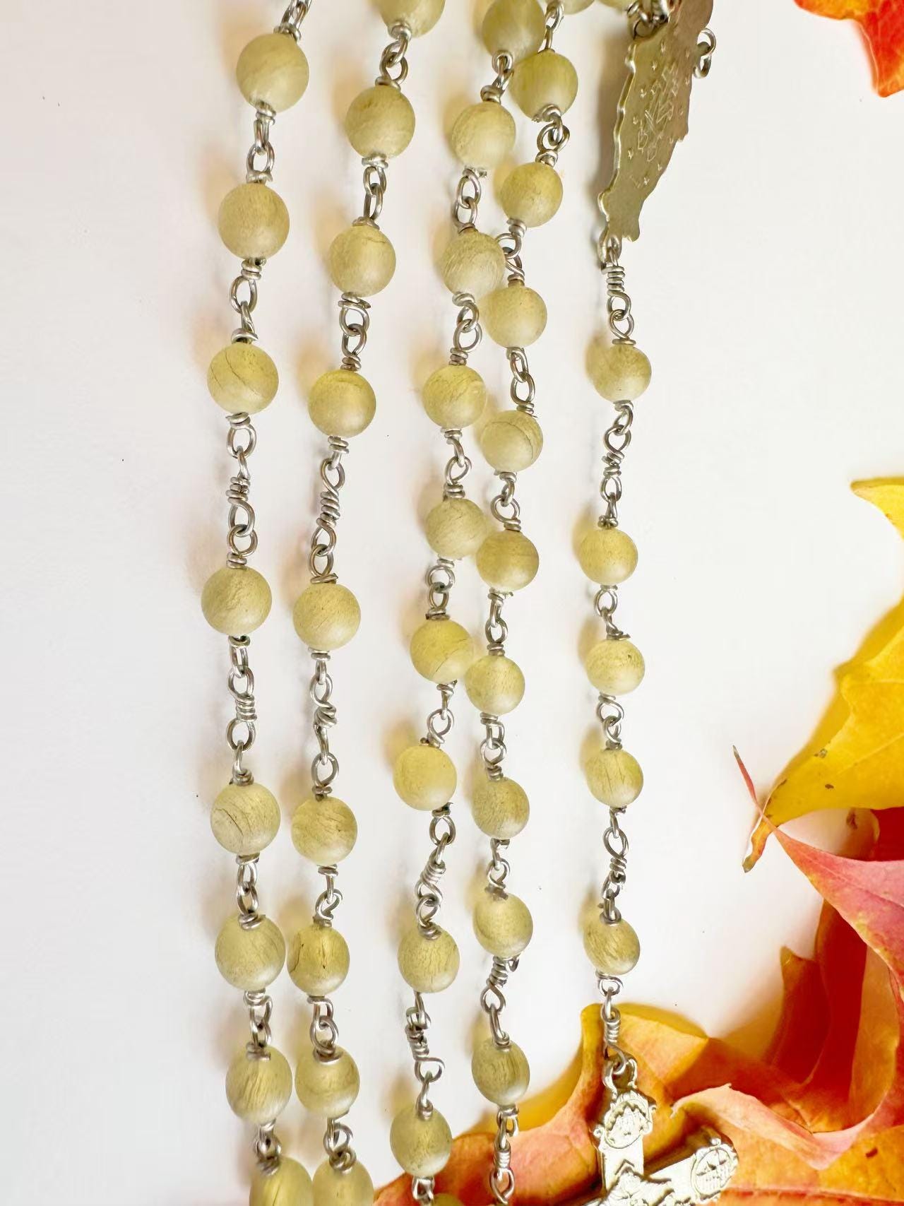 This rosary is crafted from real horn beads, joined with durable figure-8 wrapped wire for lasting strength. The antique bronze crucifix and center medal show fine detailing that gives the piece a timeless, heirloom quality.