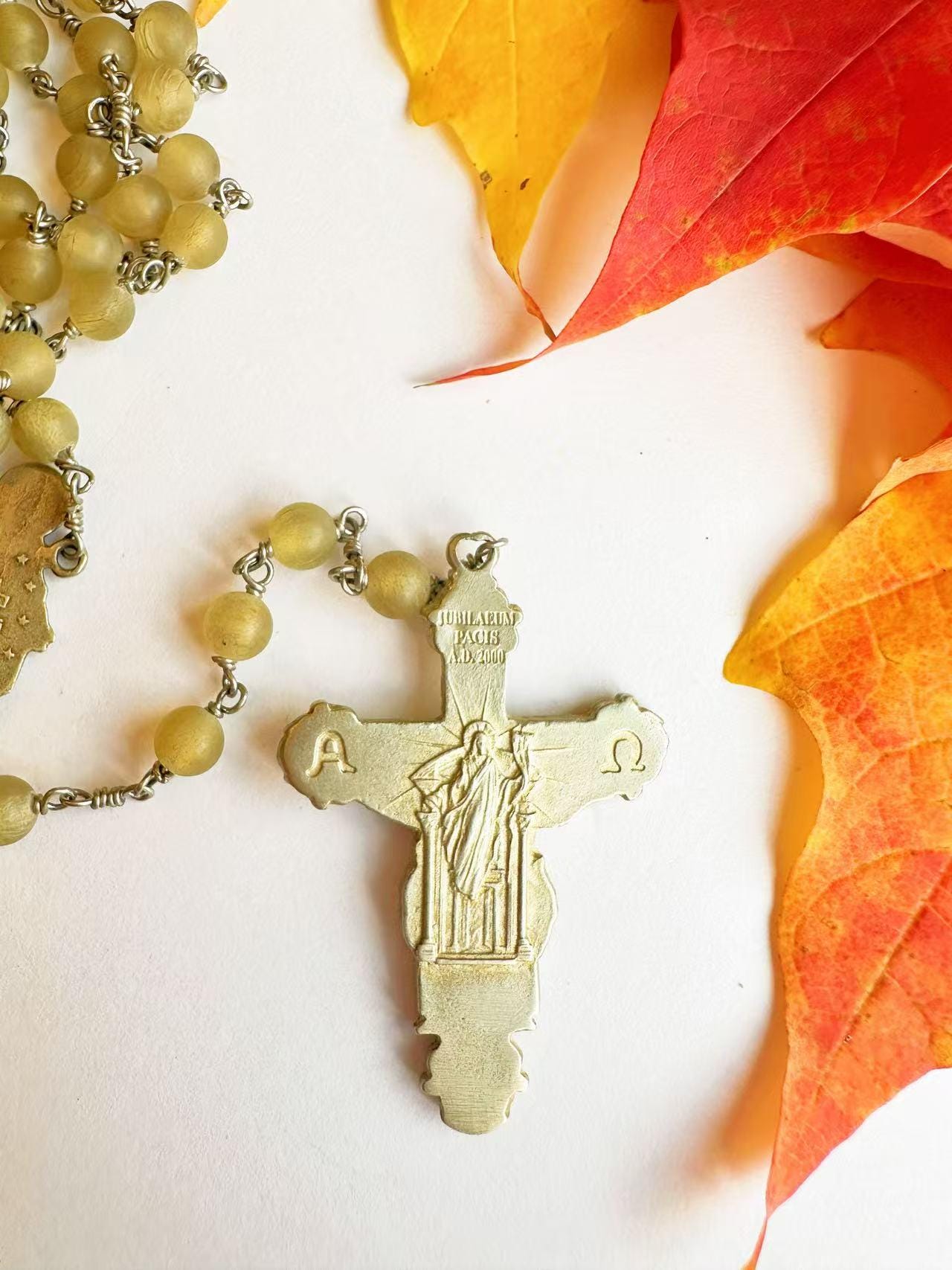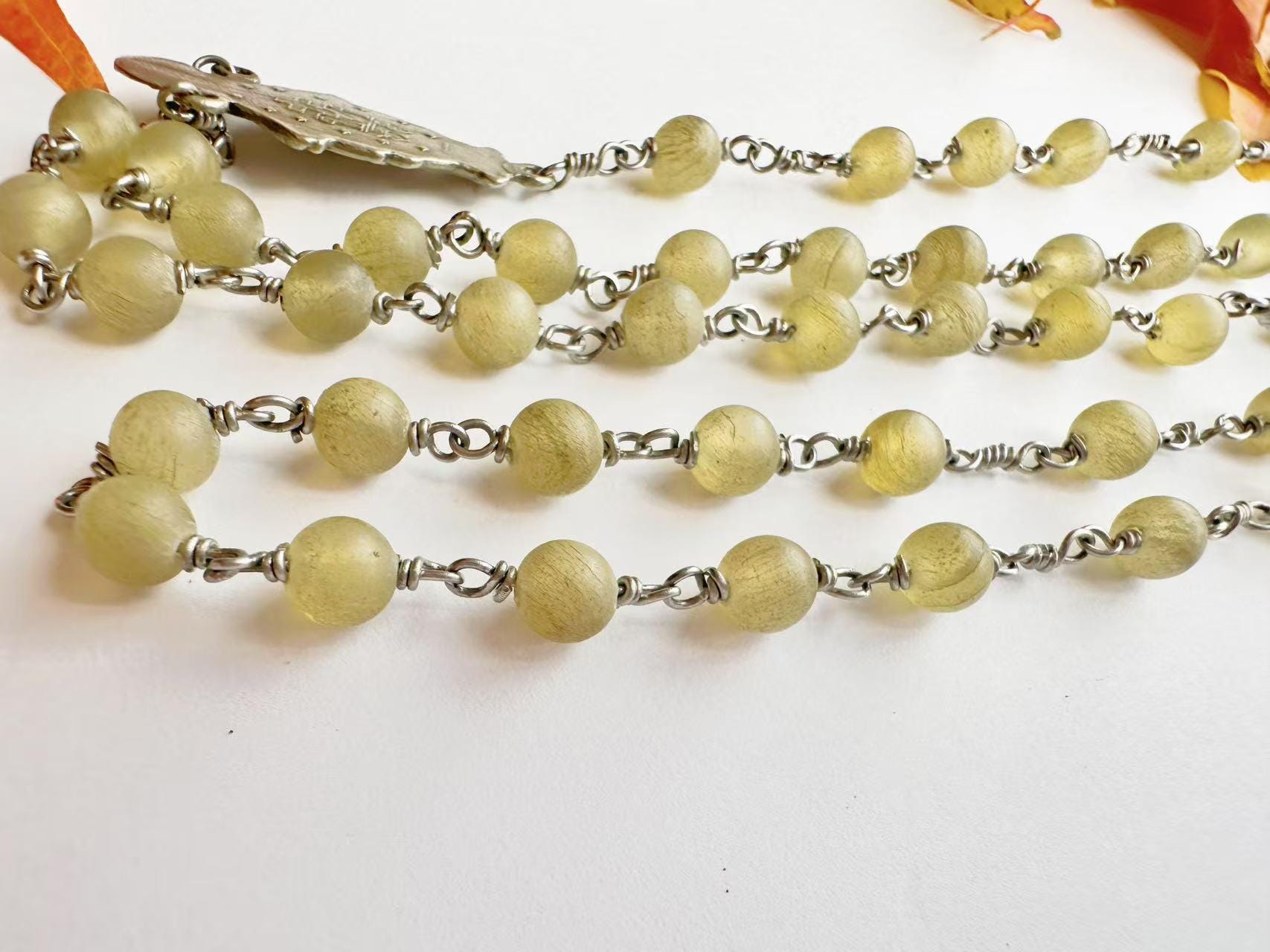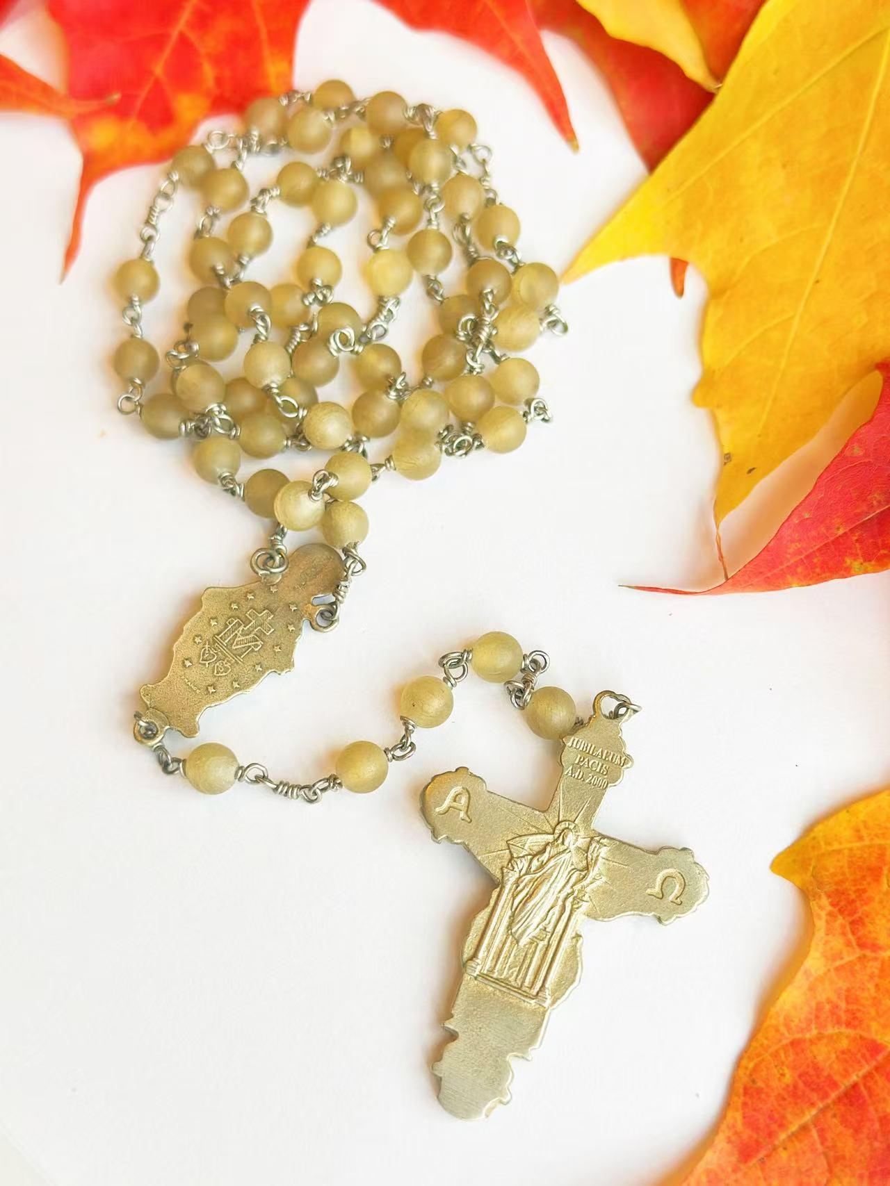 This rosary is crafted from real horn beads, joined with durable figure-8 wrapped wire for lasting strength. The antique bronze crucifix and center medal show fine detailing that gives the piece a timeless, heirloom quality.