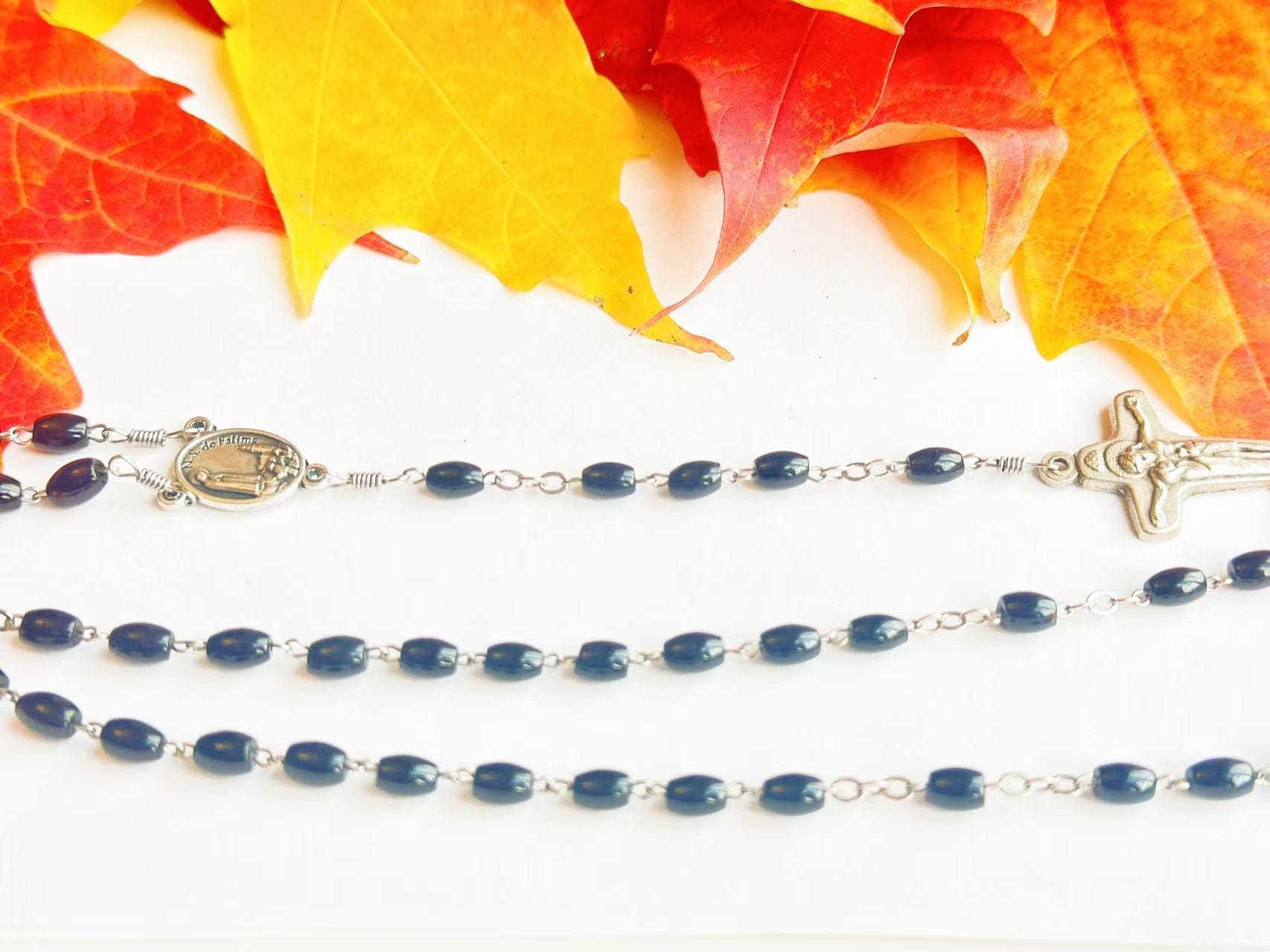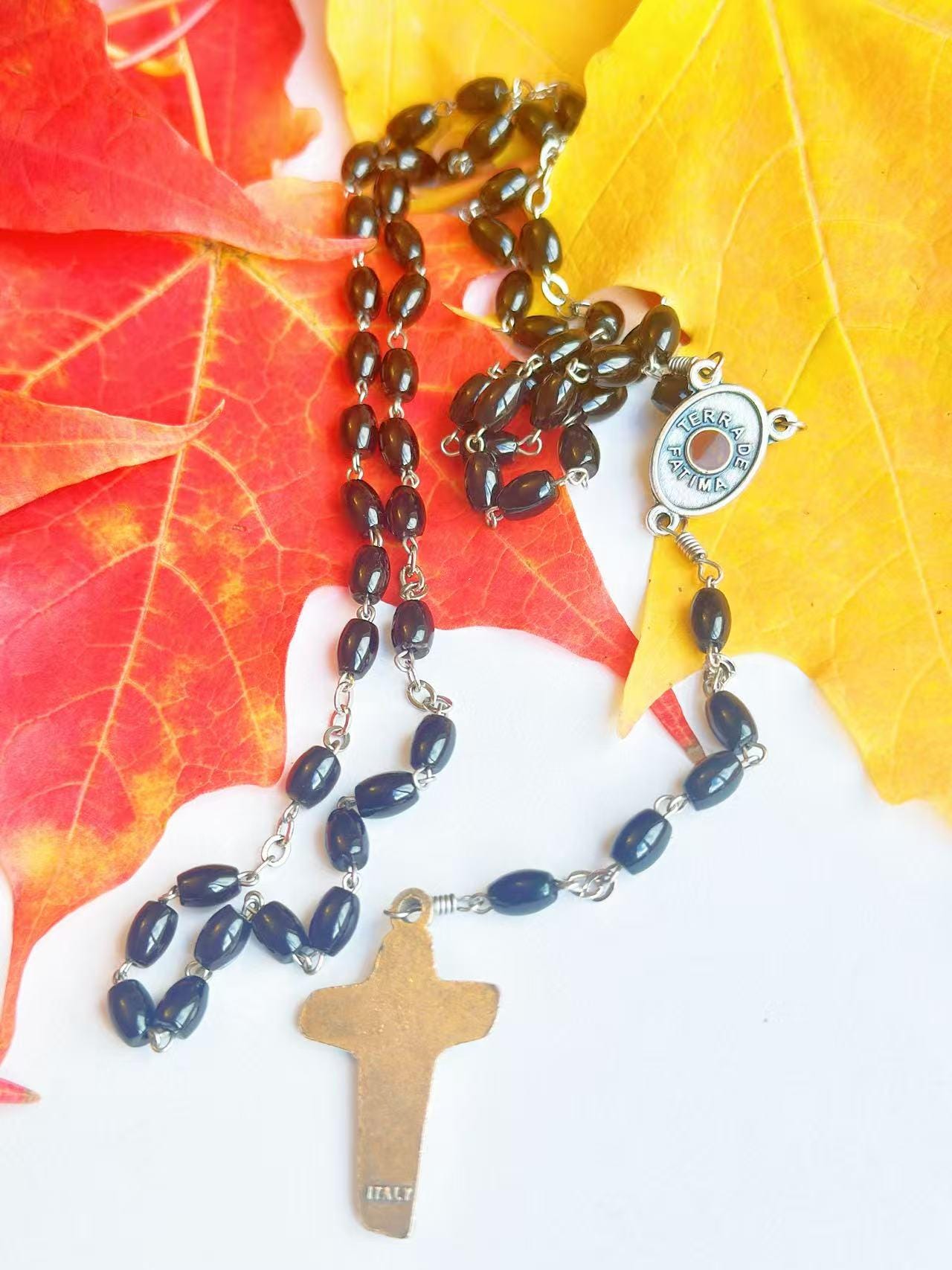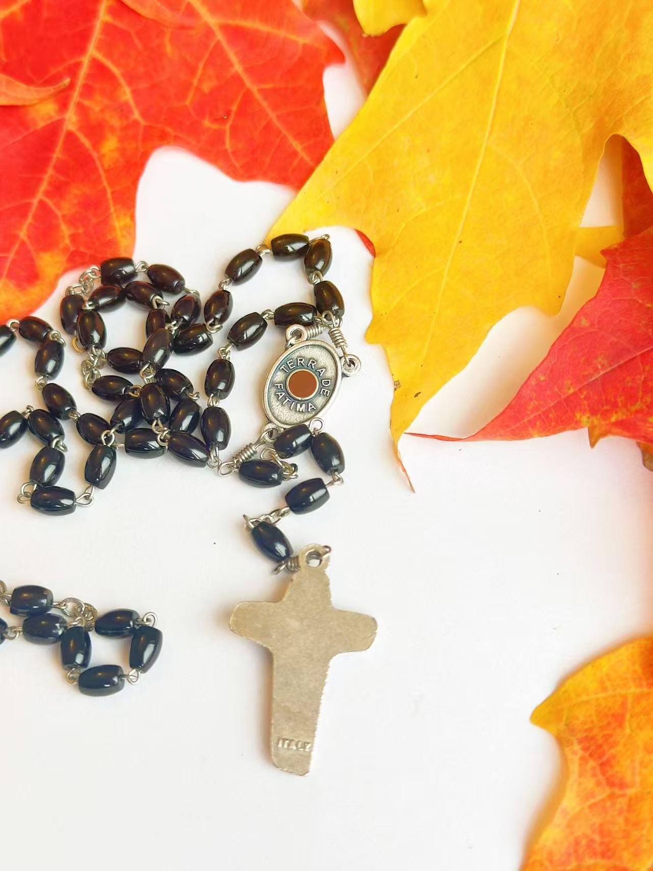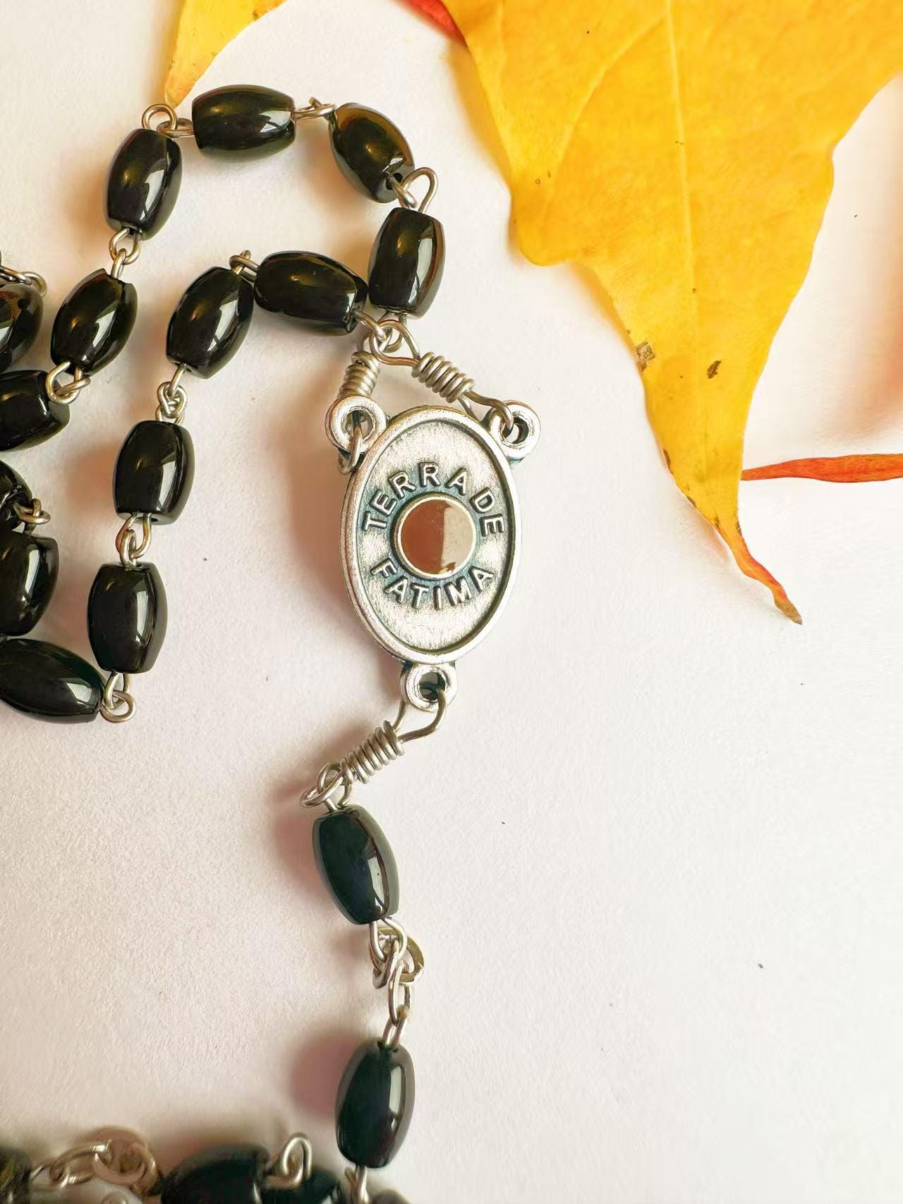 This black glass rosary with a Fatima Holy-land Soil center medal is handmade by Franciscan Sisters during prayer. It is not mass-produced; the Sisters create these pieces only occasionally, with quiet devotion and care.