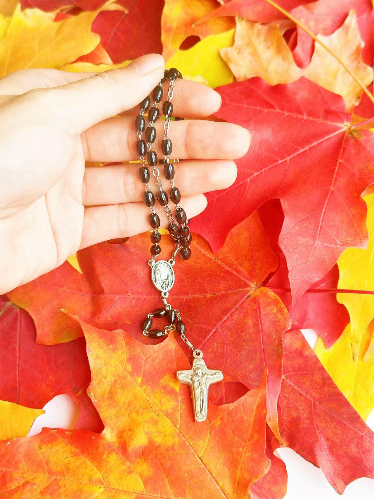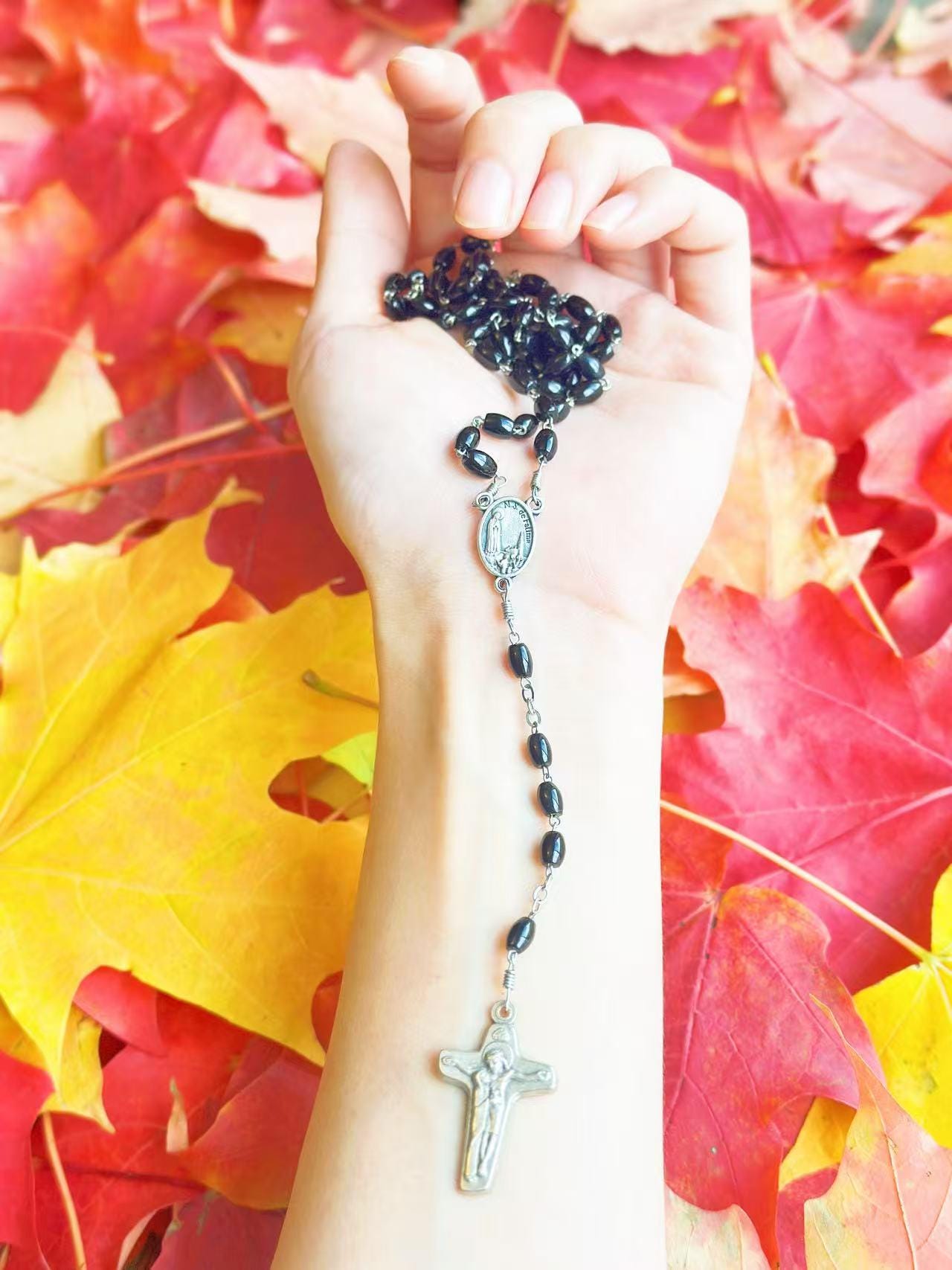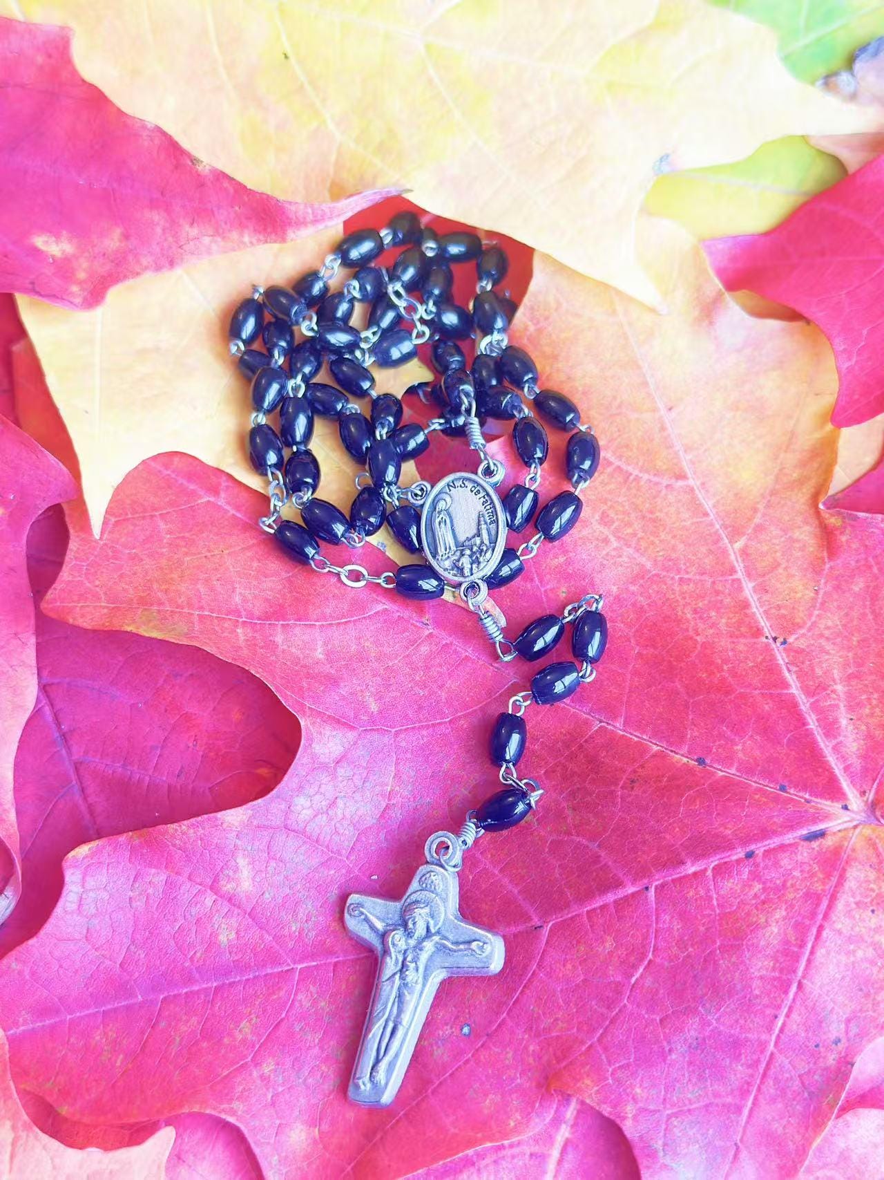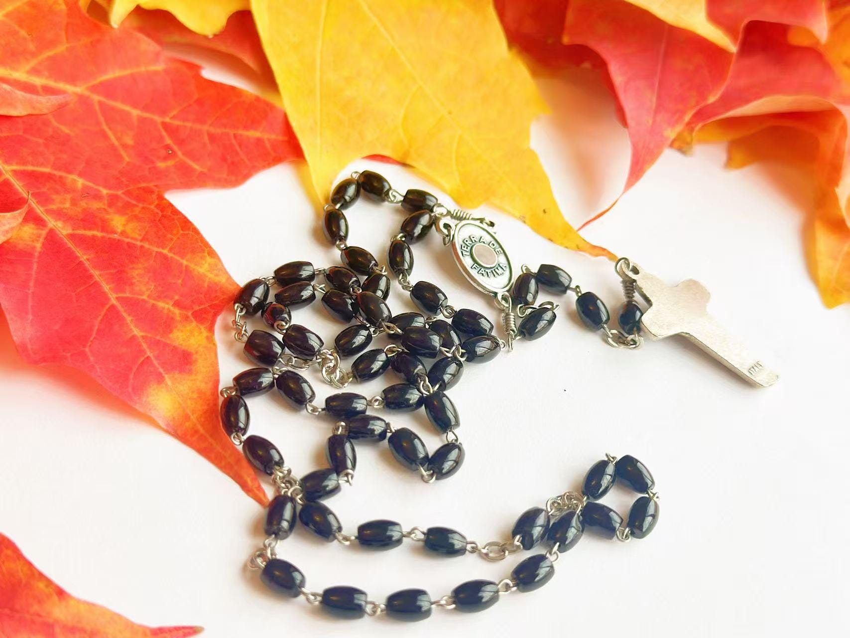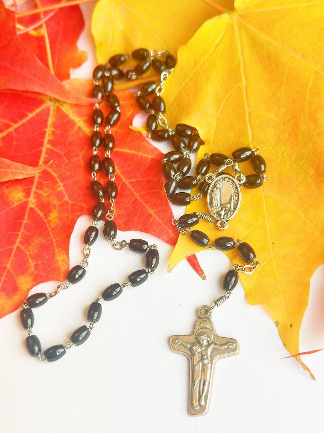 This black glass rosary with a Fatima Holy-land Soil center medal is handmade by Franciscan Sisters during prayer. It is not mass-produced; the Sisters create these pieces only occasionally, with quiet devotion and care.