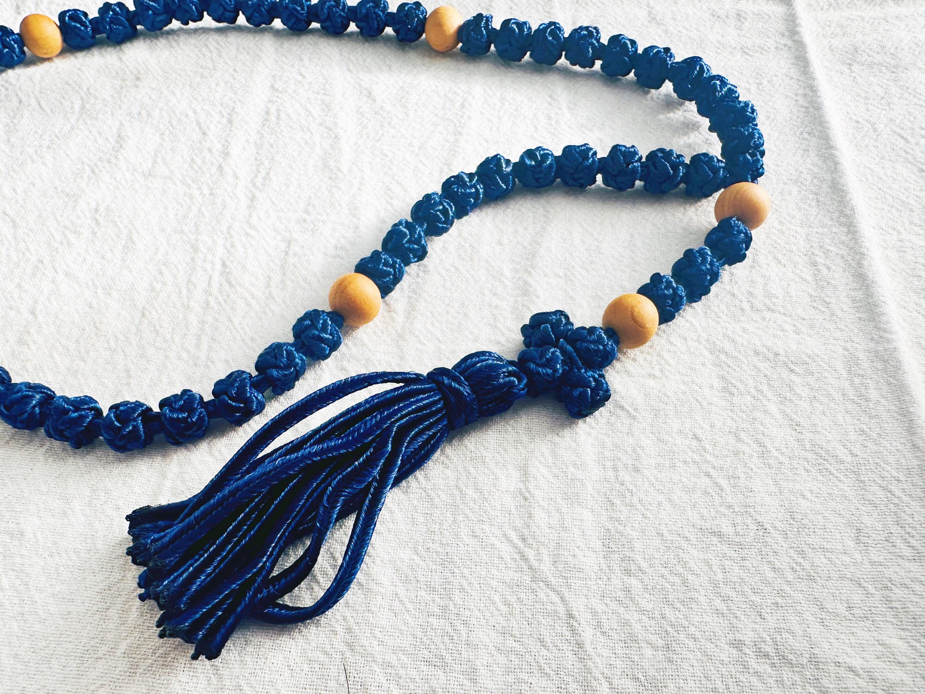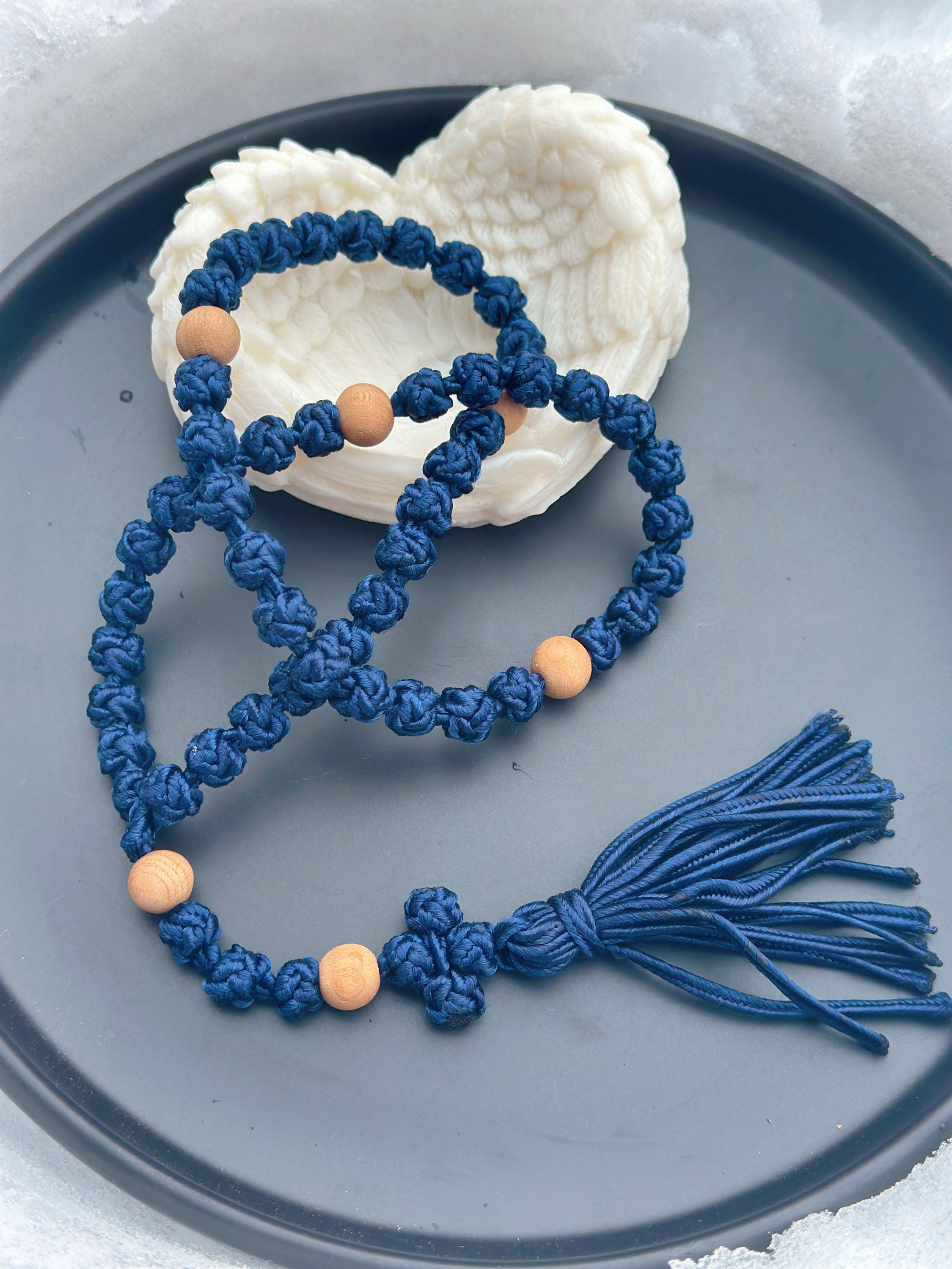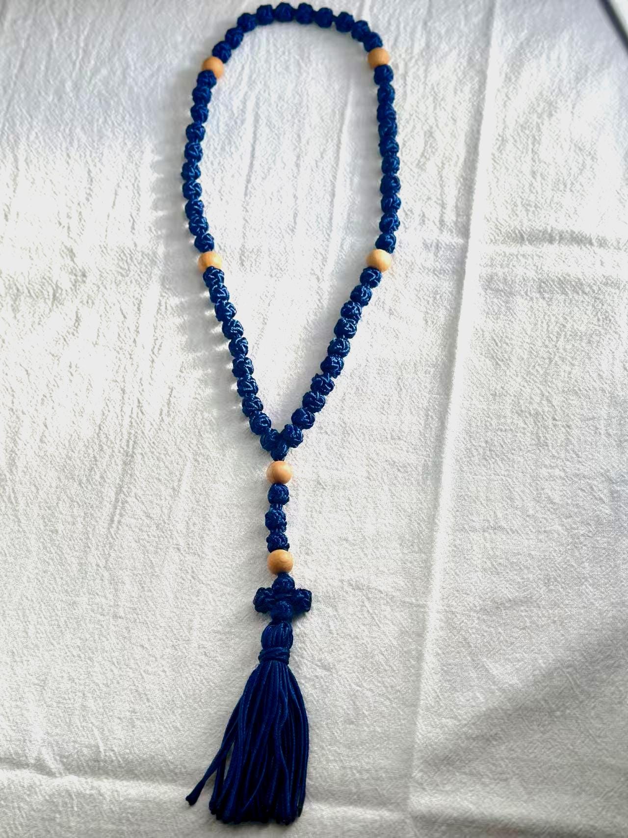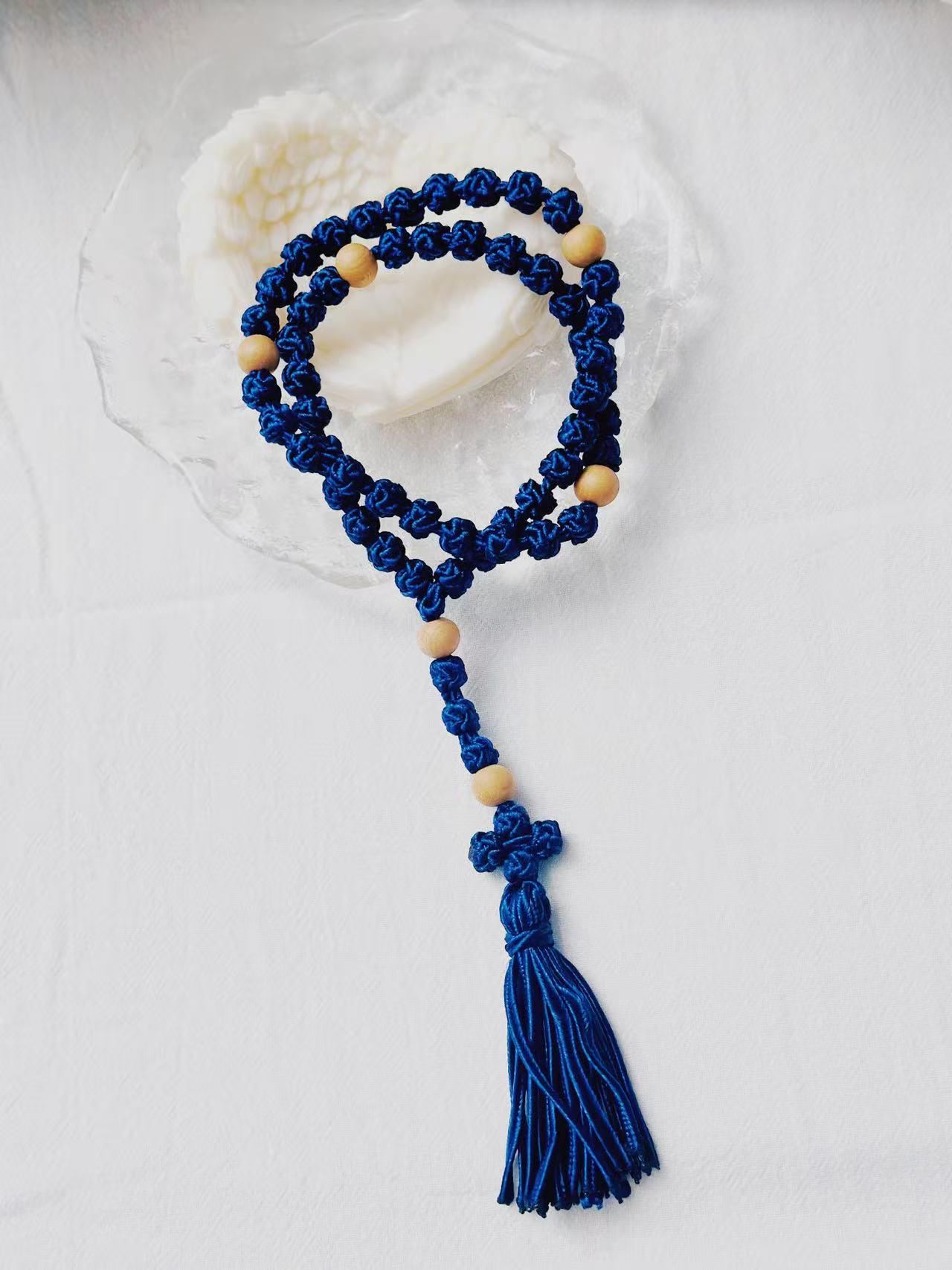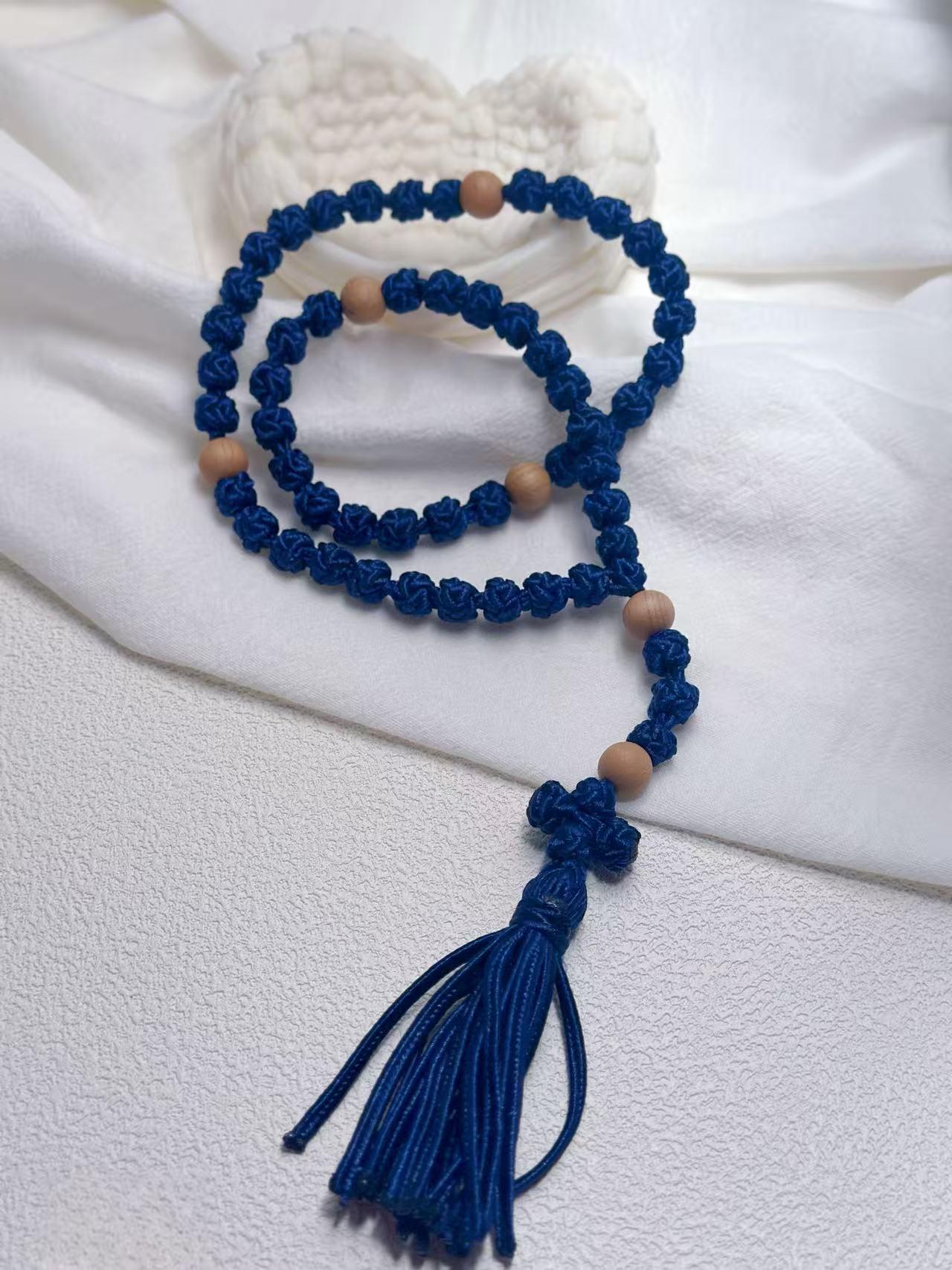 Marian Blue Hand-Knotted Cord Rosary • Wood Beads Tassel Rosary • Christmas & Daily Prayer Gift (Add Pouch – see description)