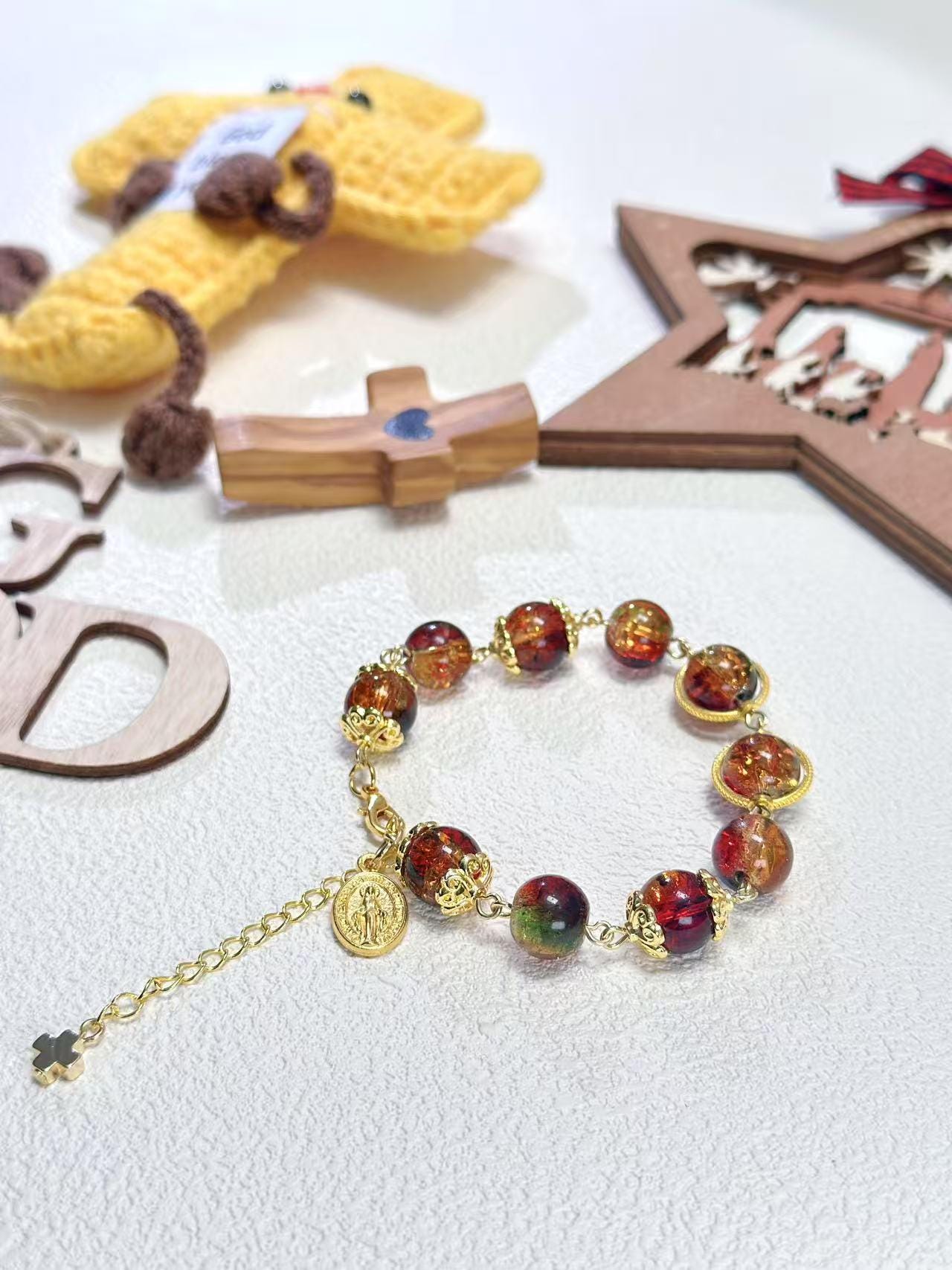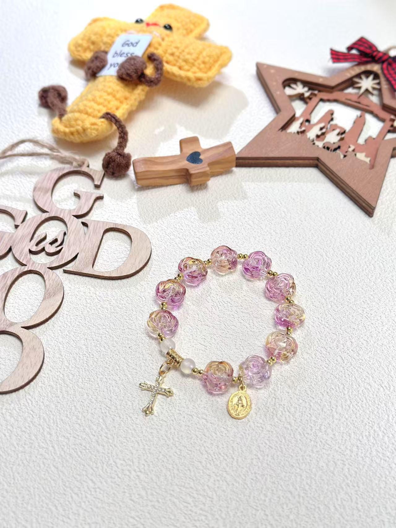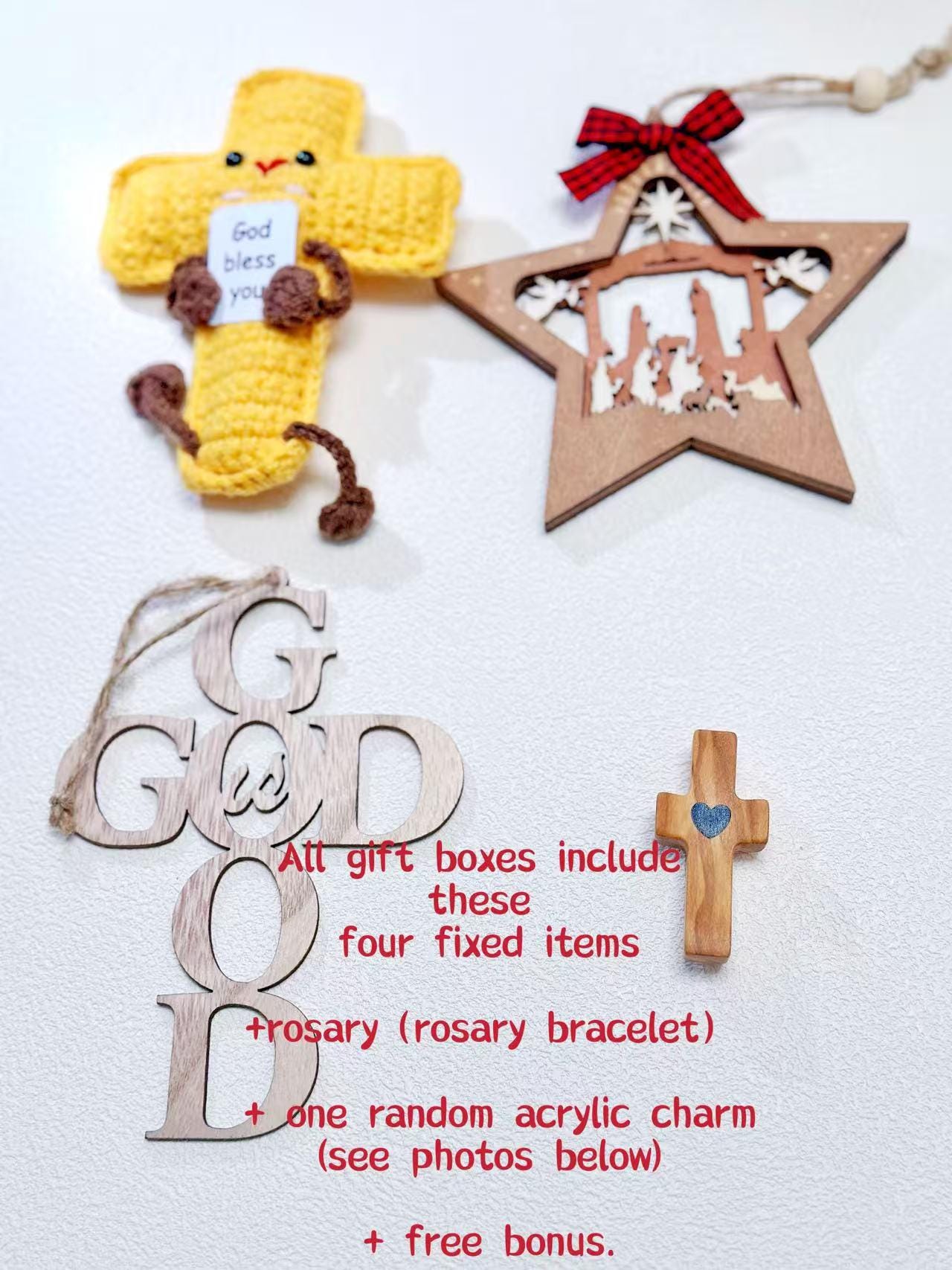 Each box includes 1 rosary of your choice, festive Nativity-themed ornaments, an olive-wood prayer cross, a handmade crochet cross, and a free acrylic charm (large colorful cross or Lamb of God, sent randomly).