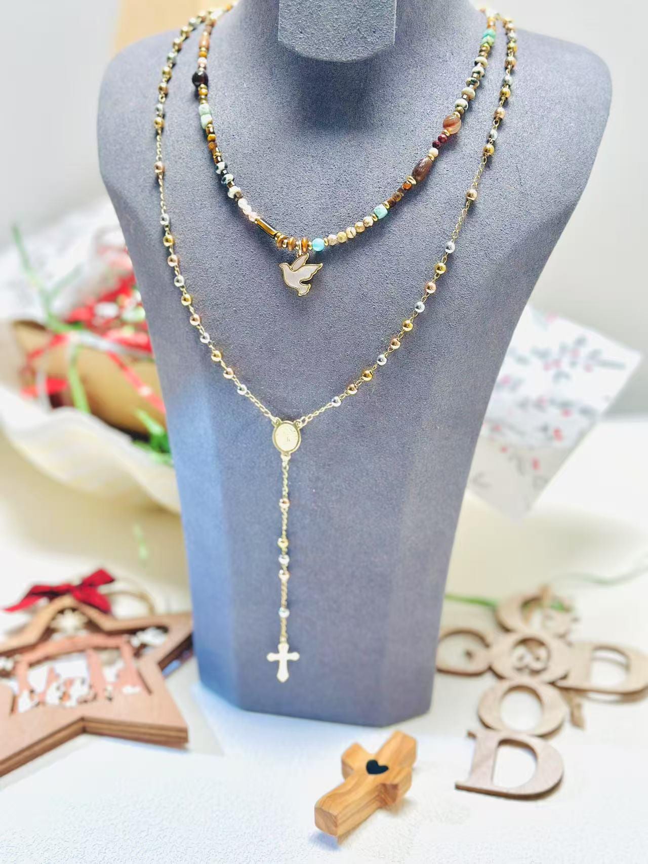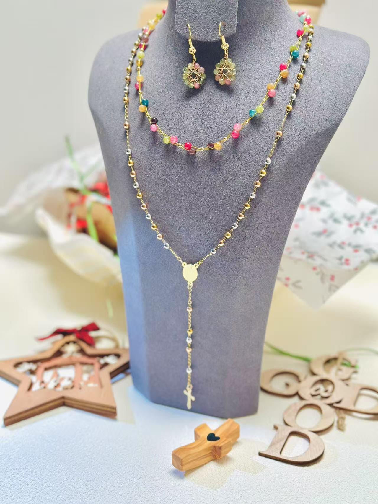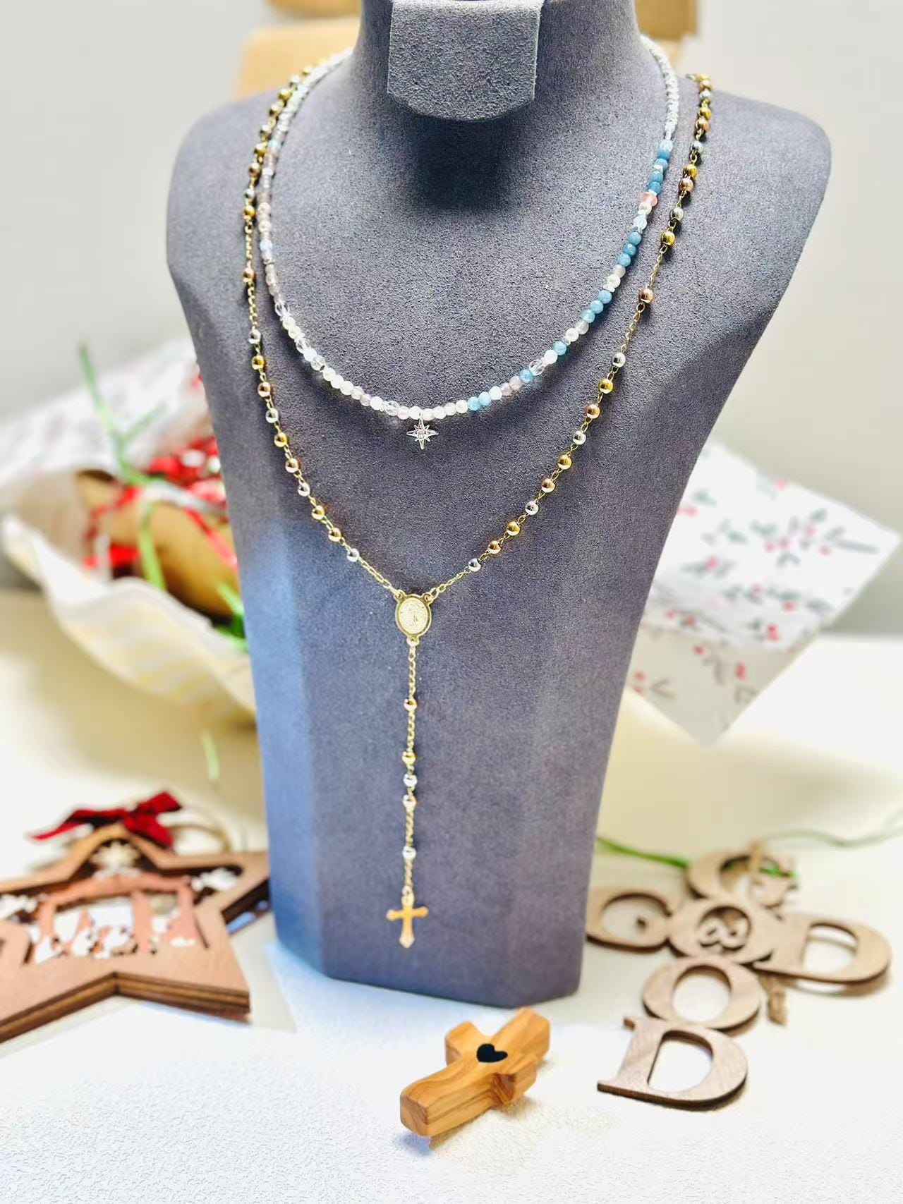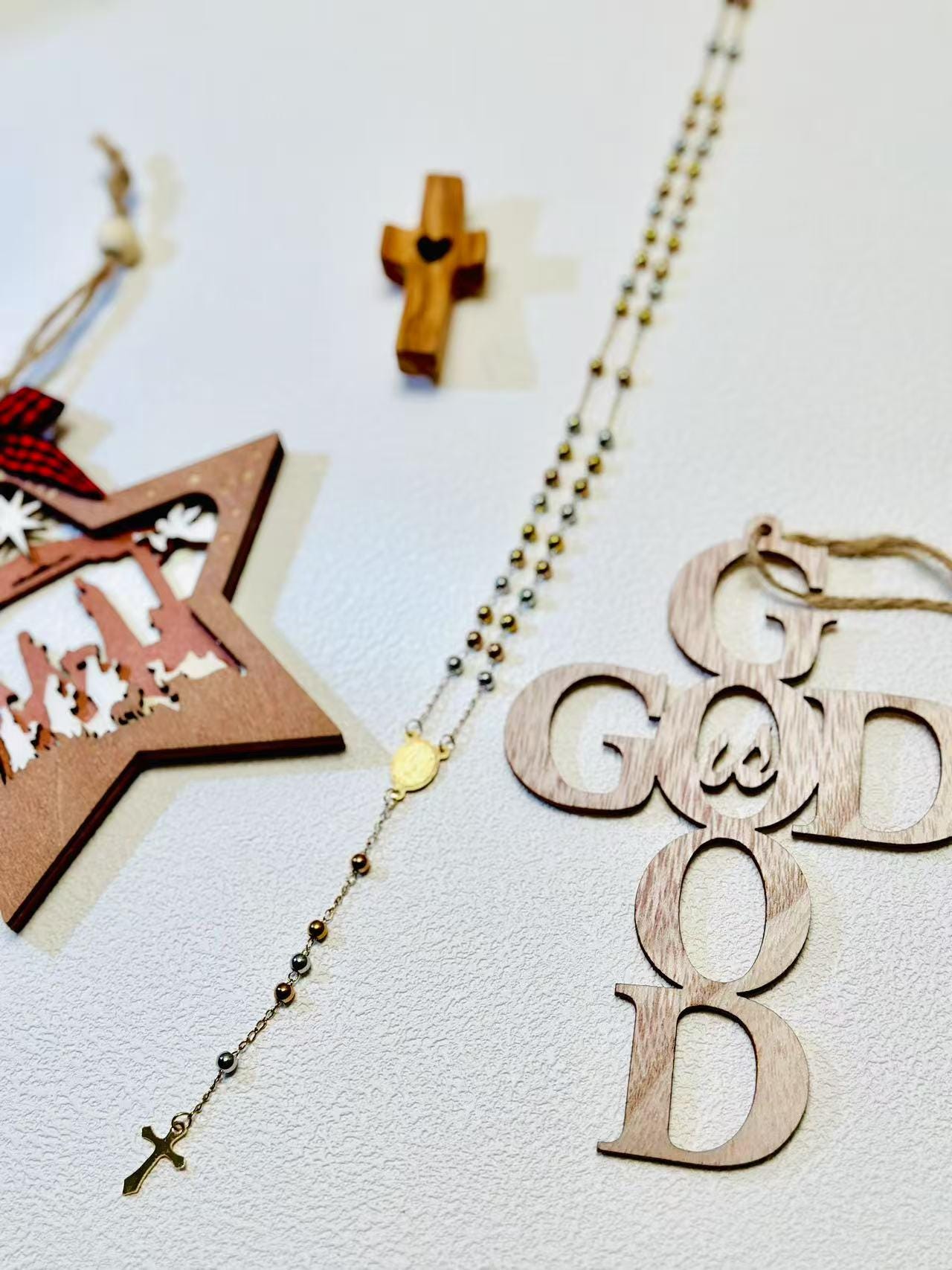 • Stainless steel, 4 mm beads, 1.5 cm center medal, 1.6 cm cross