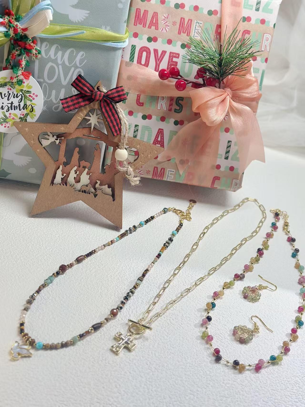 A curated Christmas gift box combining natural gemstones with faith-friendly holiday elements.